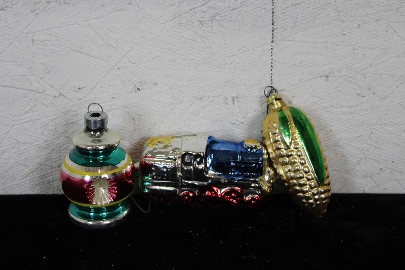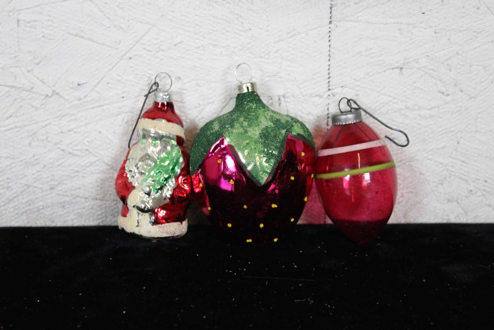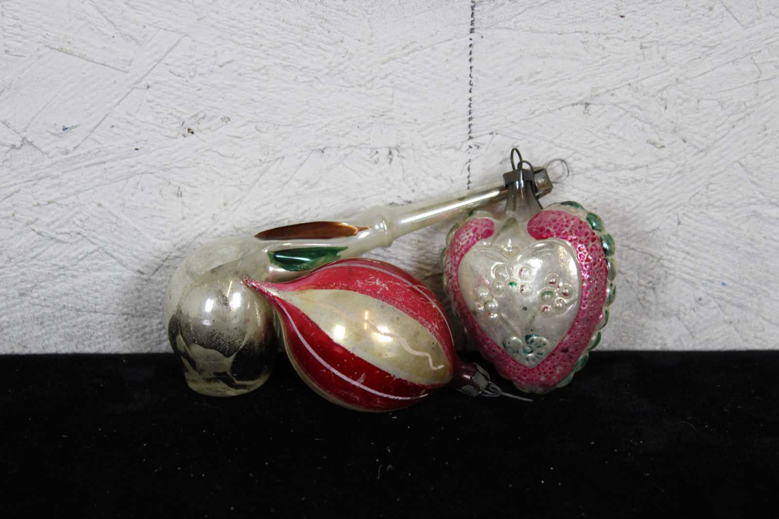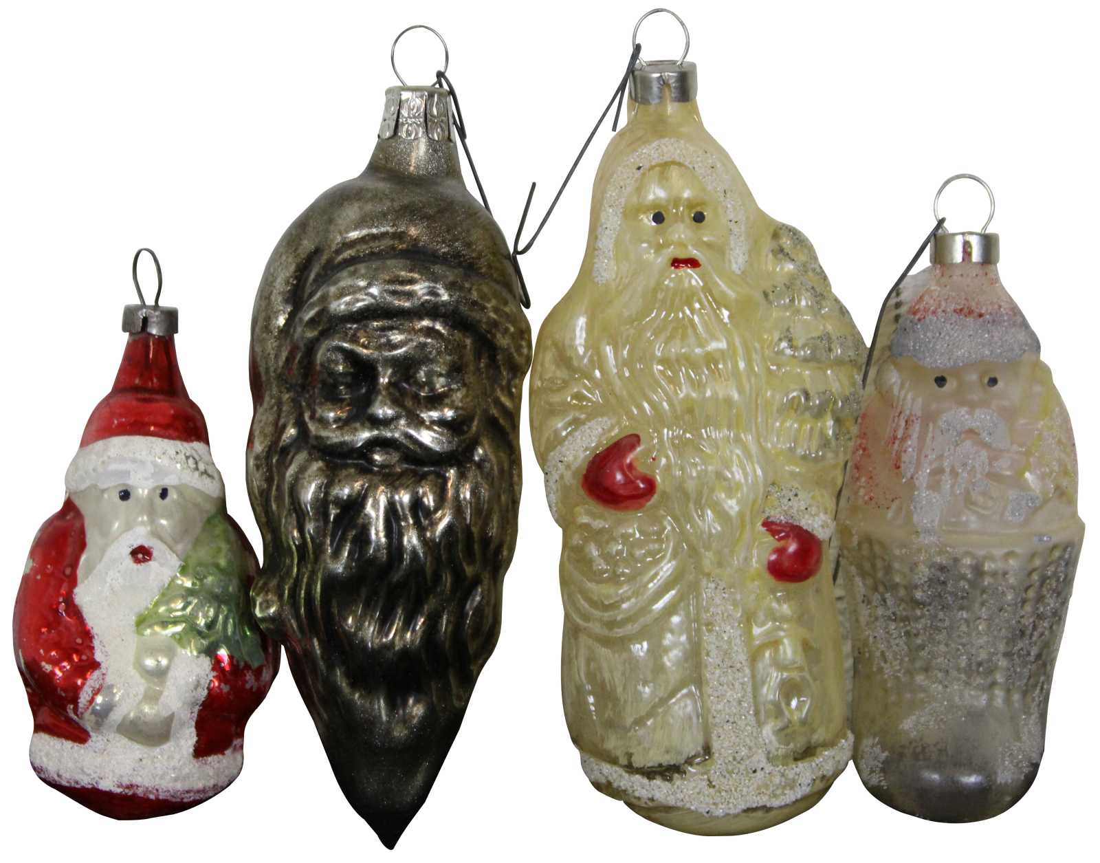 Lot of 31 rare assorted antique German mercury glass Christmas ornaments. Featuring Kugel or ball like ornaments in the shapes of fruit, tear drops, santa clauses, heart, pipe, birds, baskets, acorn, train, corn, bell, lanterns ect.
