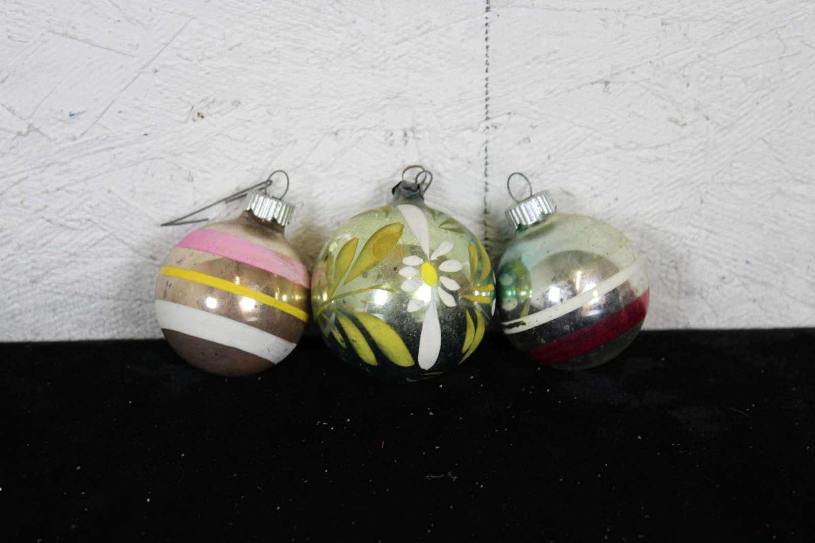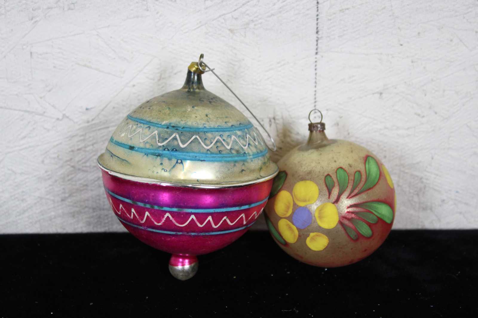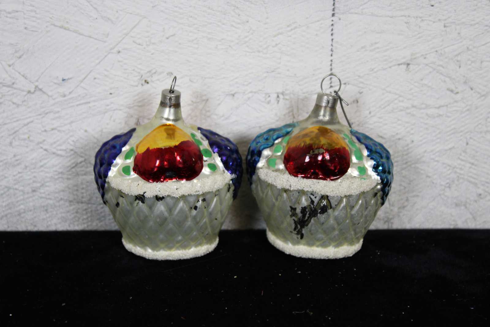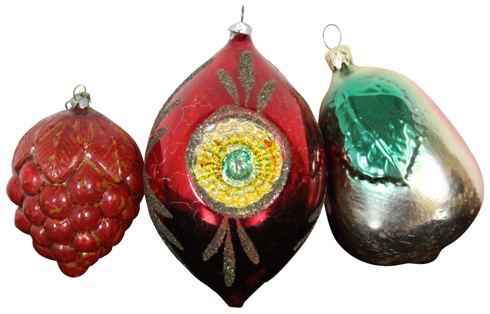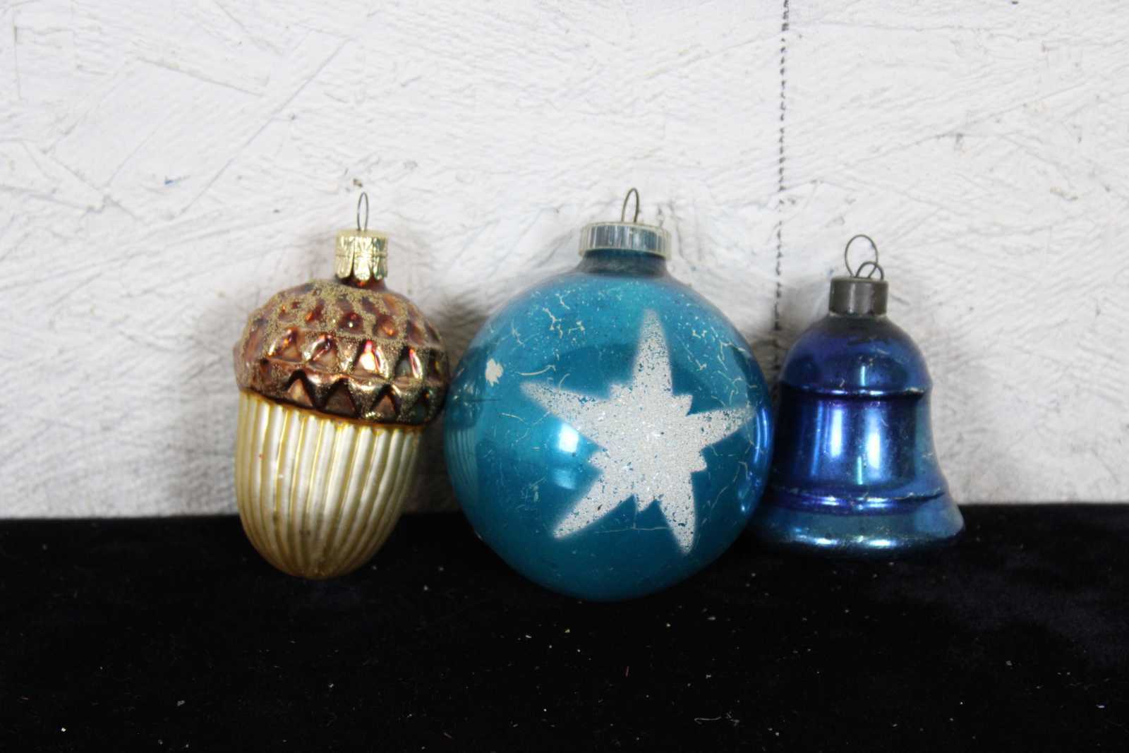 Lot of 31 rare assorted antique German mercury glass Christmas ornaments. Featuring Kugel or ball like ornaments in the shapes of fruit, tear drops, santa clauses, heart, pipe, birds, baskets, acorn, train, corn, bell, lanterns ect.