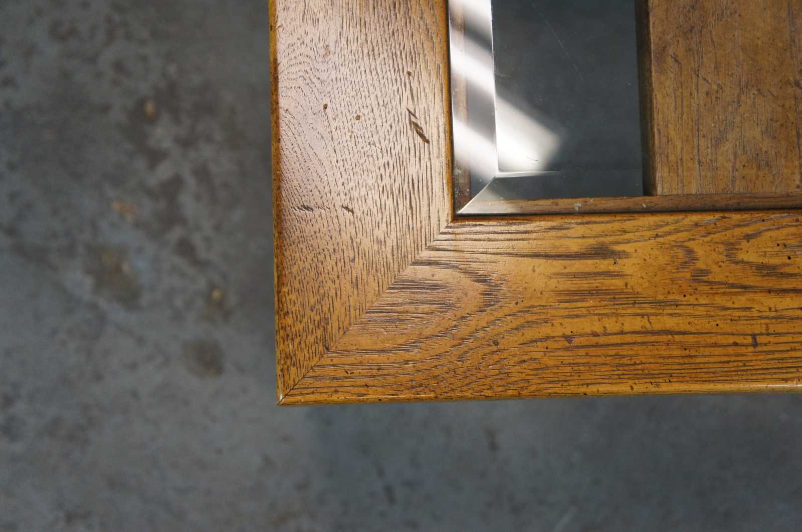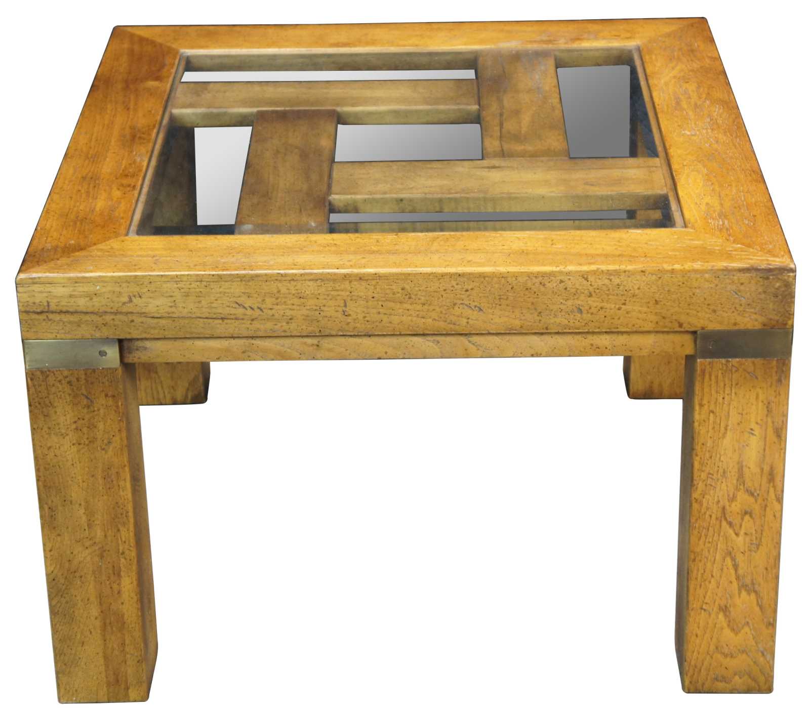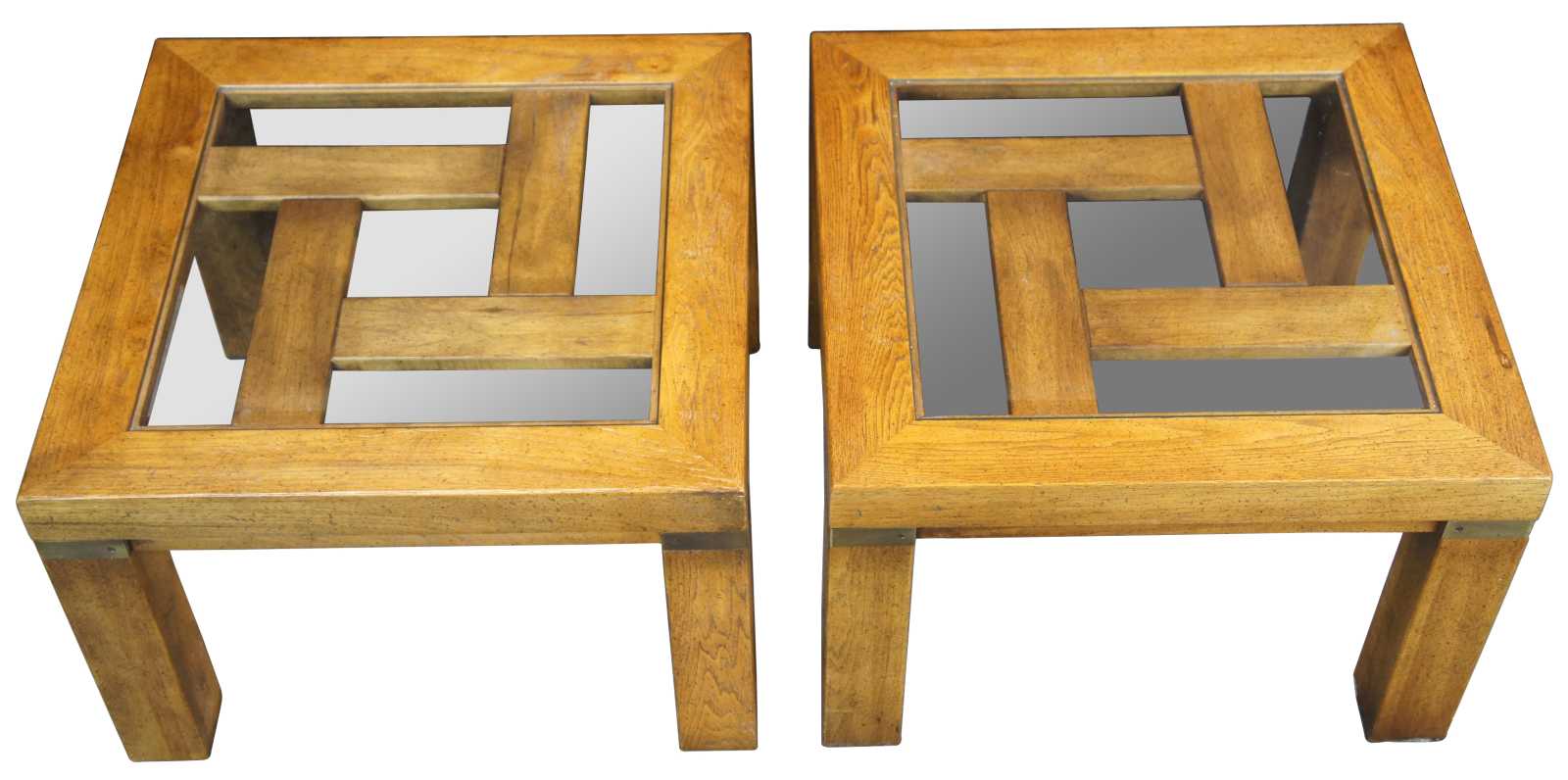 Two vintage Drexel Heritage Woodbriar collection side tables. Made of oak featuring square form with geometric design, beveled glass top and brass accents.