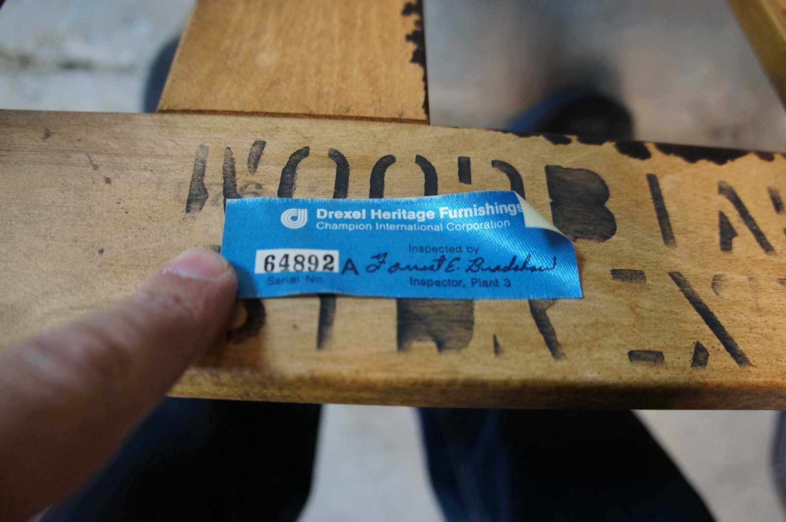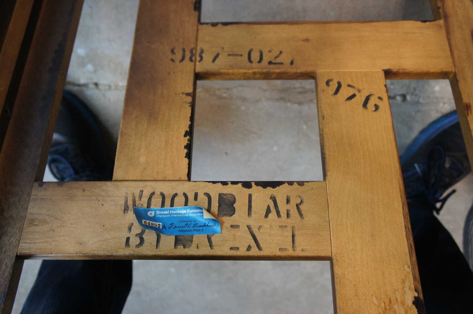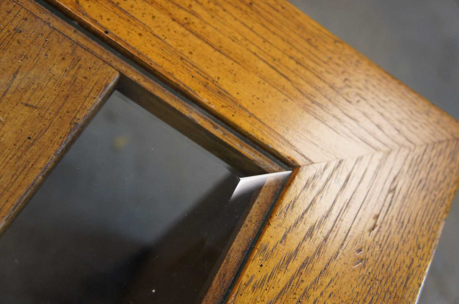 Two vintage Drexel Heritage Woodbriar collection side tables. Made of oak featuring square form with geometric design, beveled glass top and brass accents.