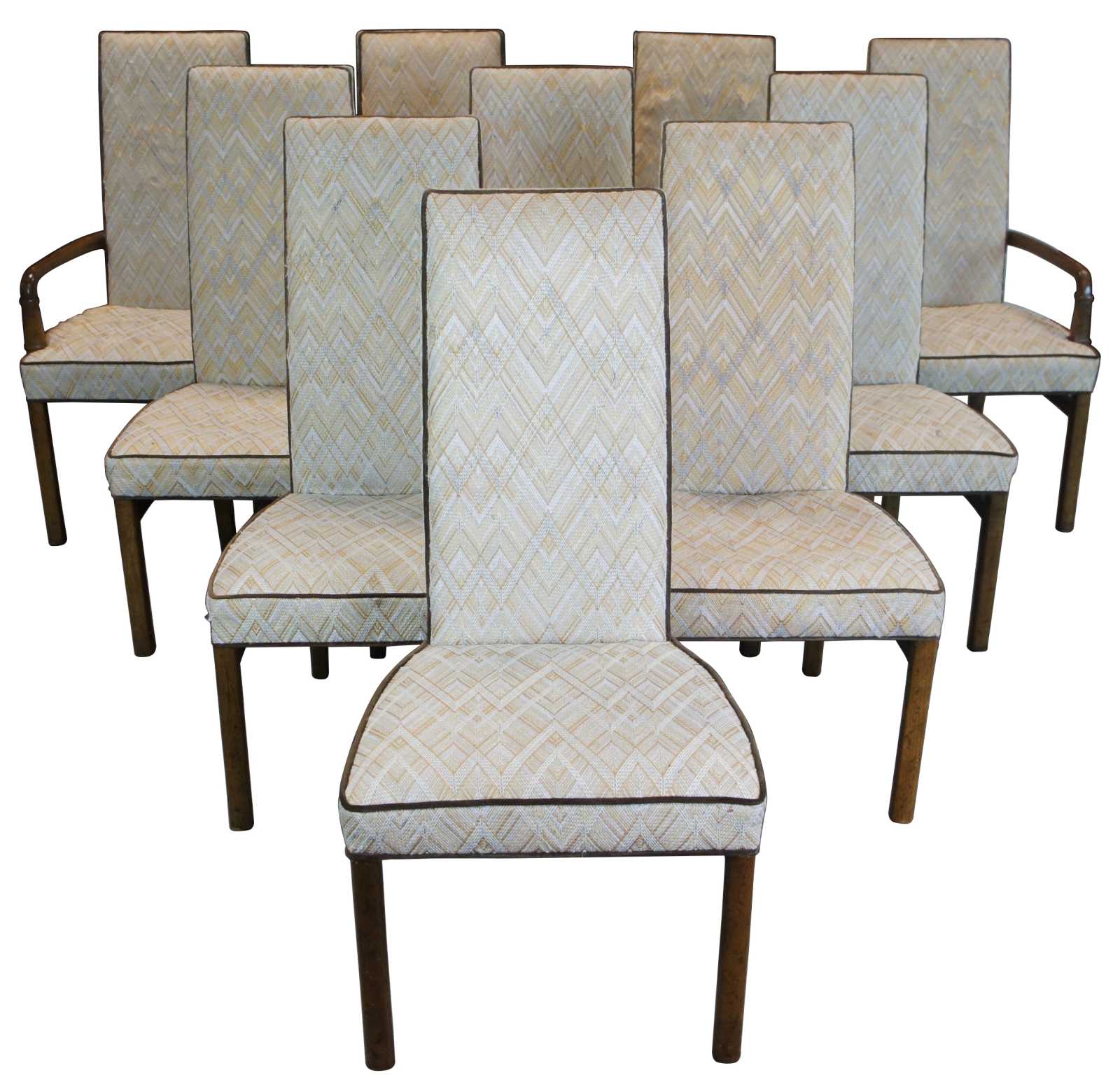 Ten mid century highback dining chairs by Drexel Heritage Furniture. Made of walnut featuring geometric tweed upholstery.