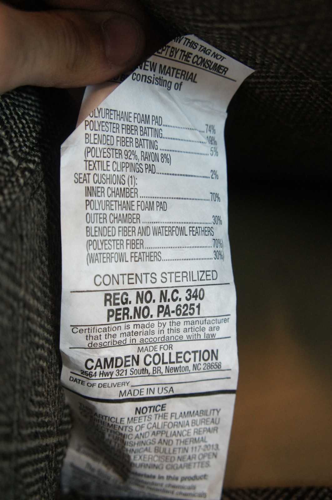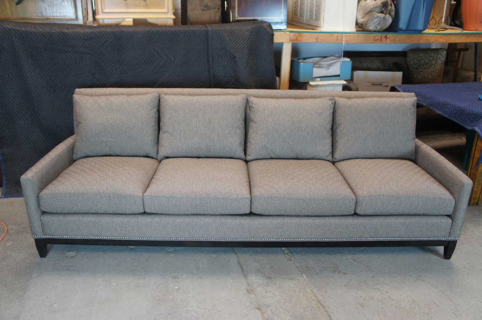 Arhaus Furniture Camden Collection four seat sofa or couch. Features Arhaus's Bench Crafted Upholstery, a gray tweed style fabric with a geometric repeating pattern, accented with nailhead trim and tapered feet.