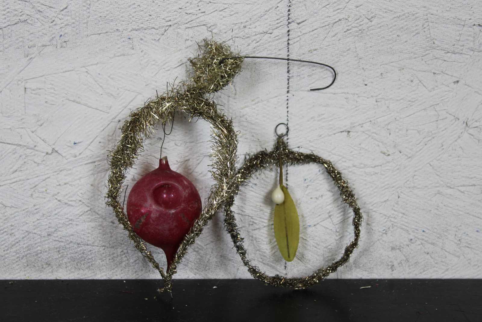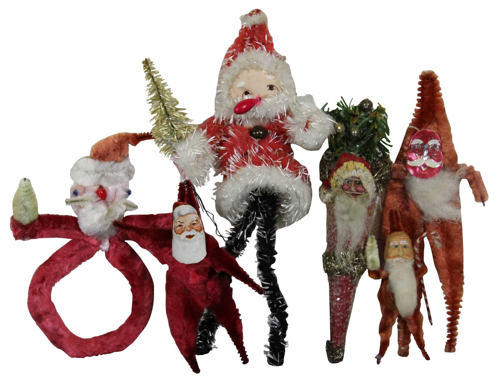 Set of eleven vintage chenille and tinsel pipe cleaner Christmas tree ornaments featuring santas, candy canes, merry Christmas star and tinsels.