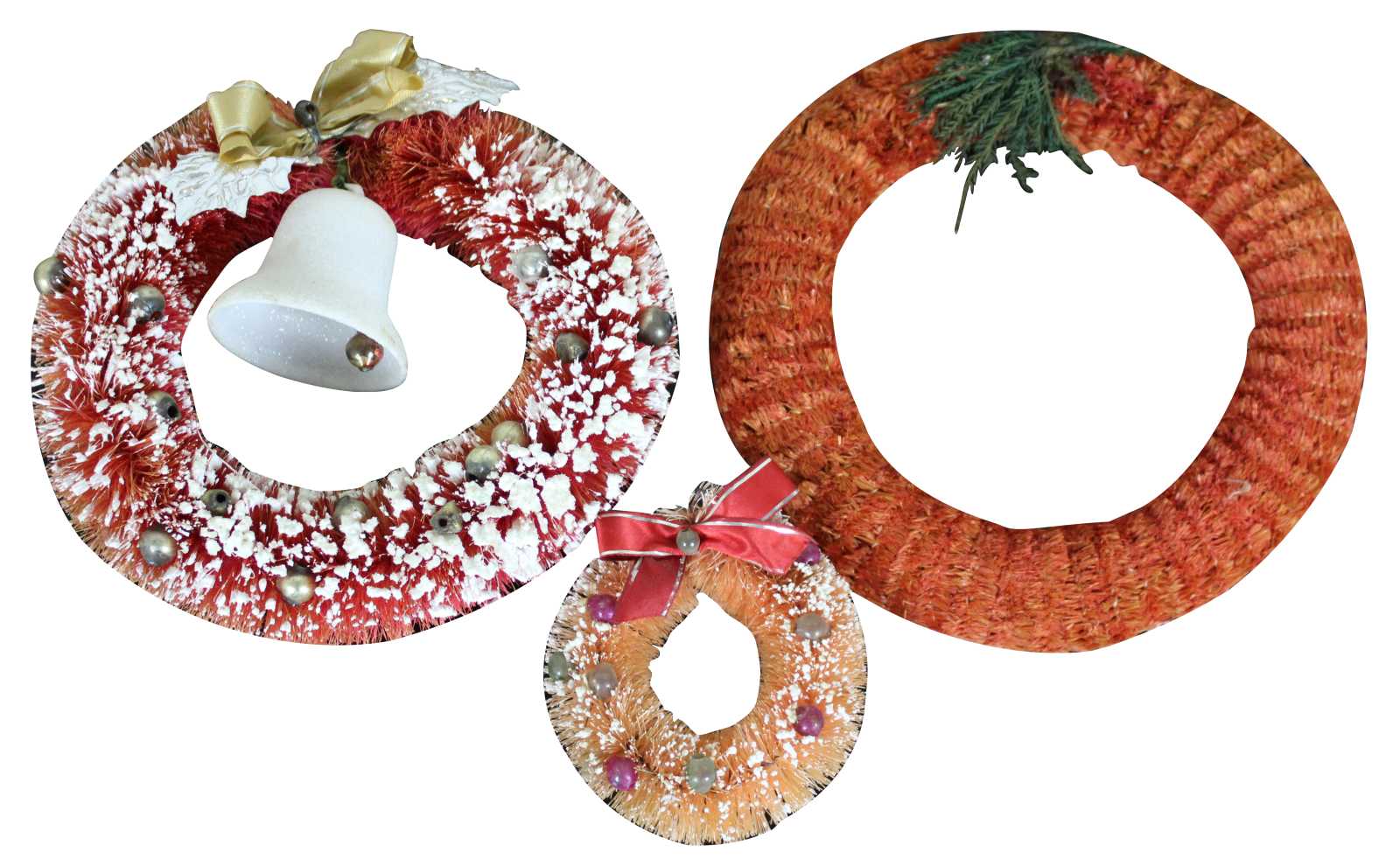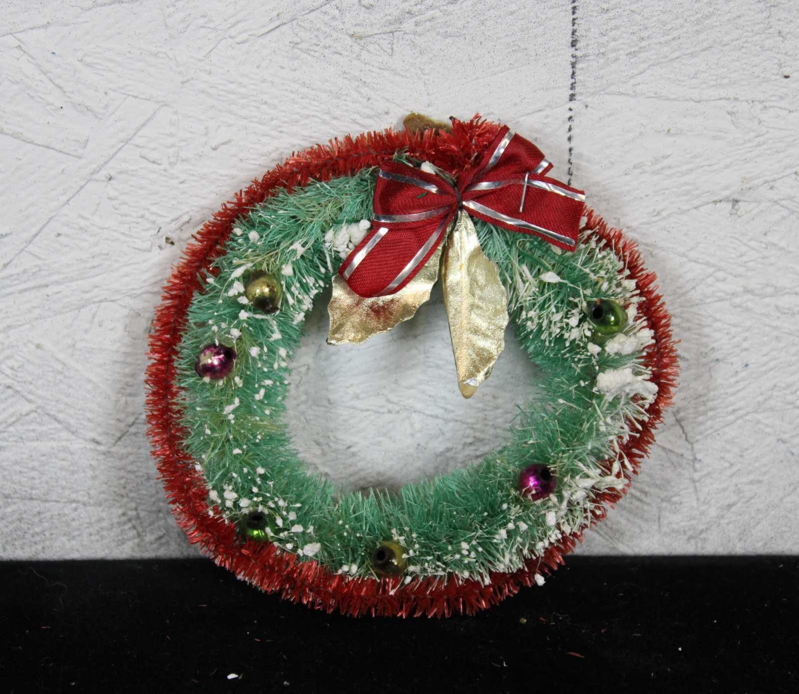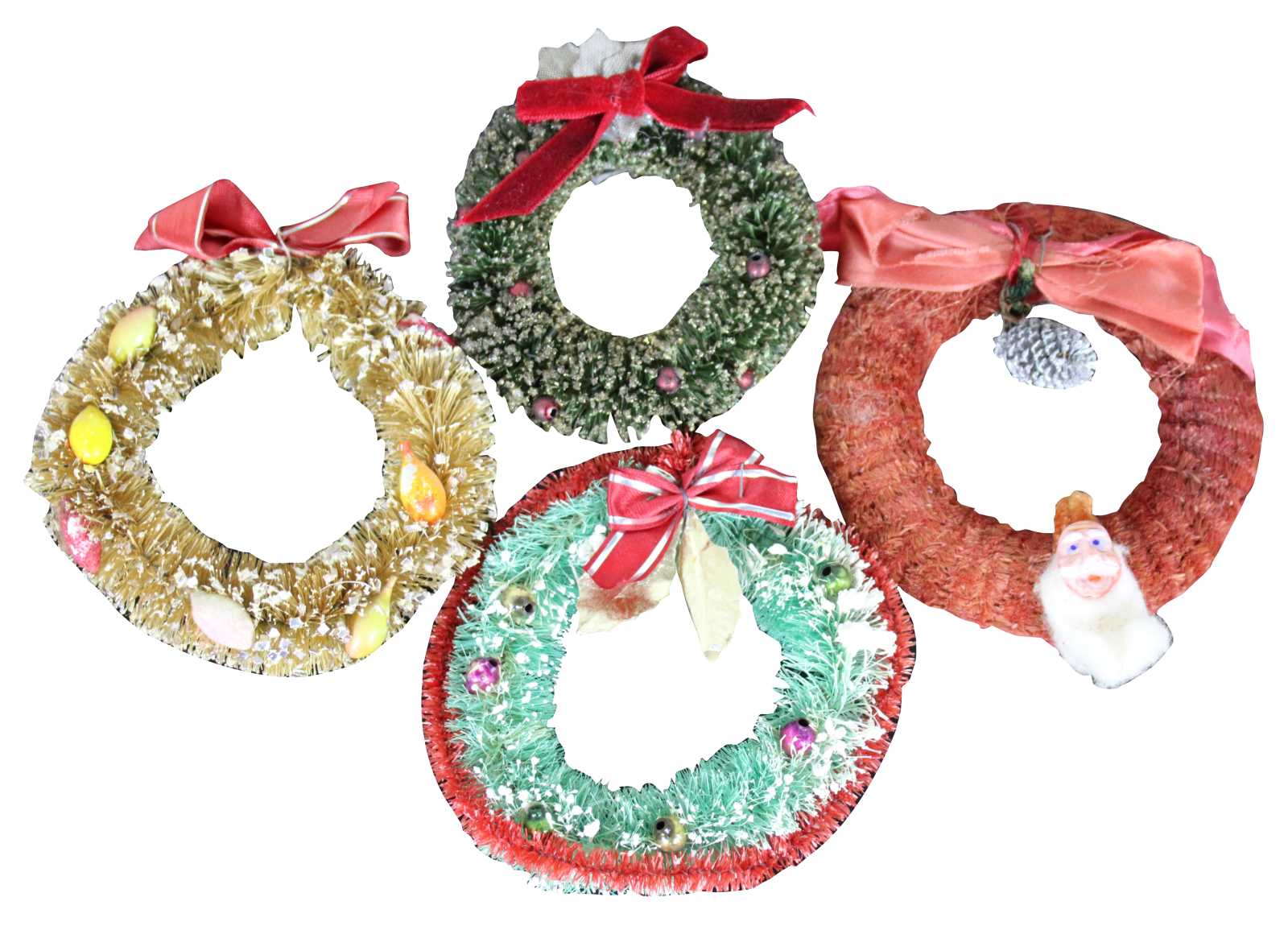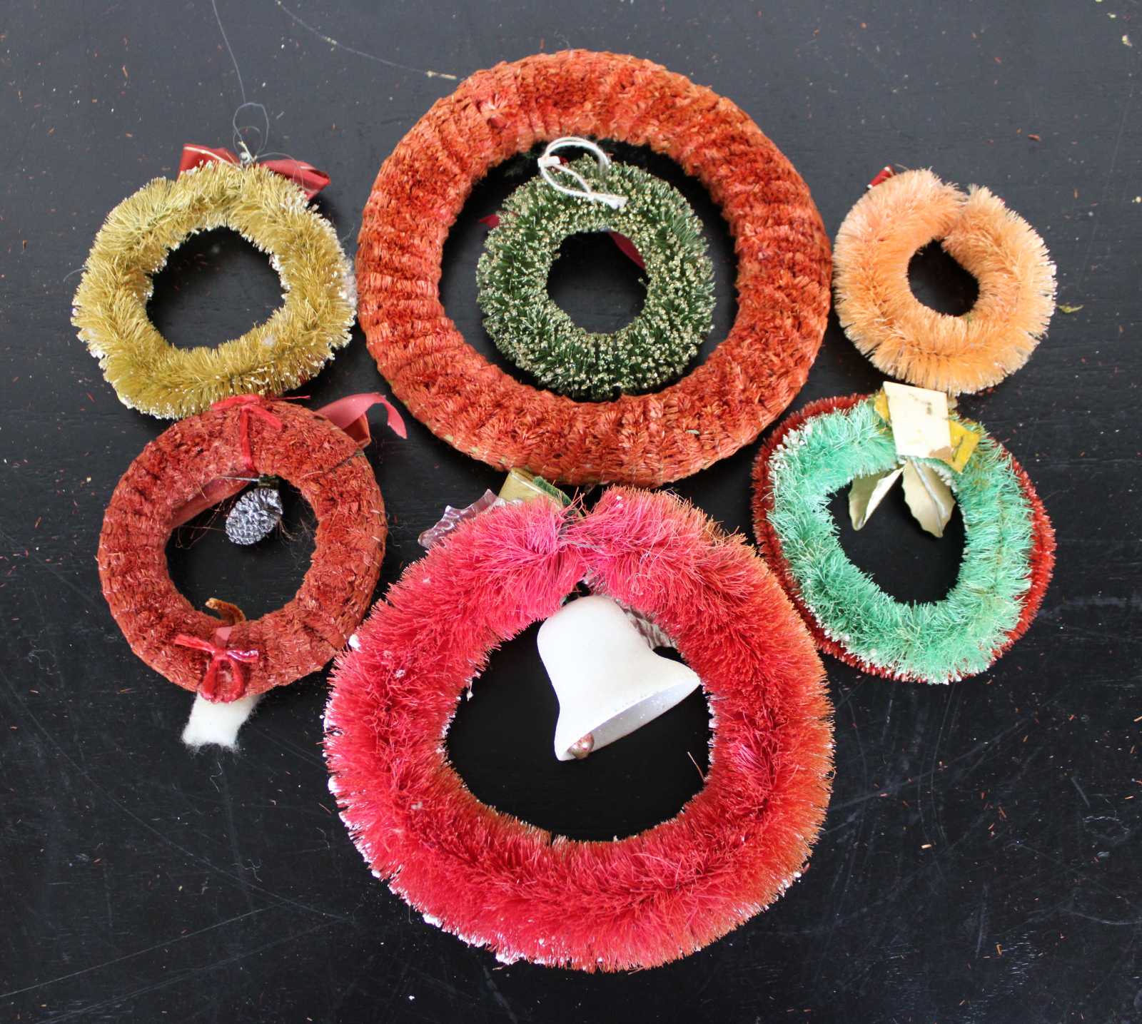 Lot of seven assorted folk art bottle brush Christmas wreaths decorated with snow, ornaments and bows.