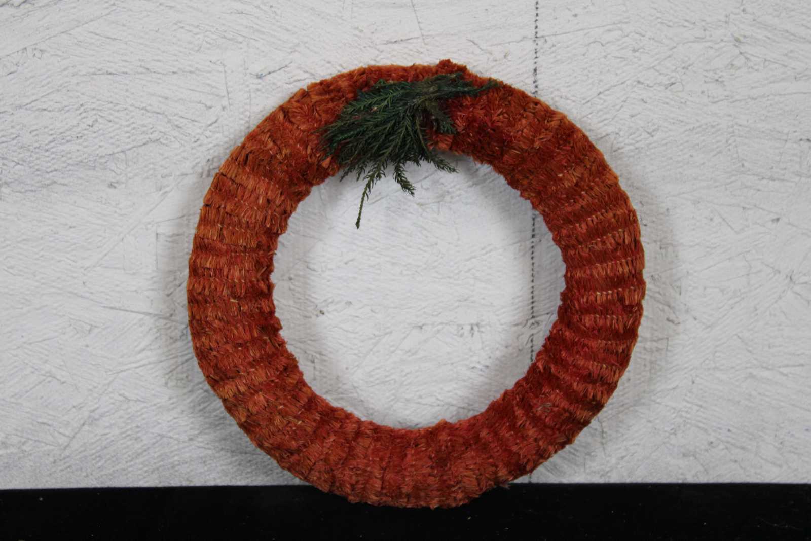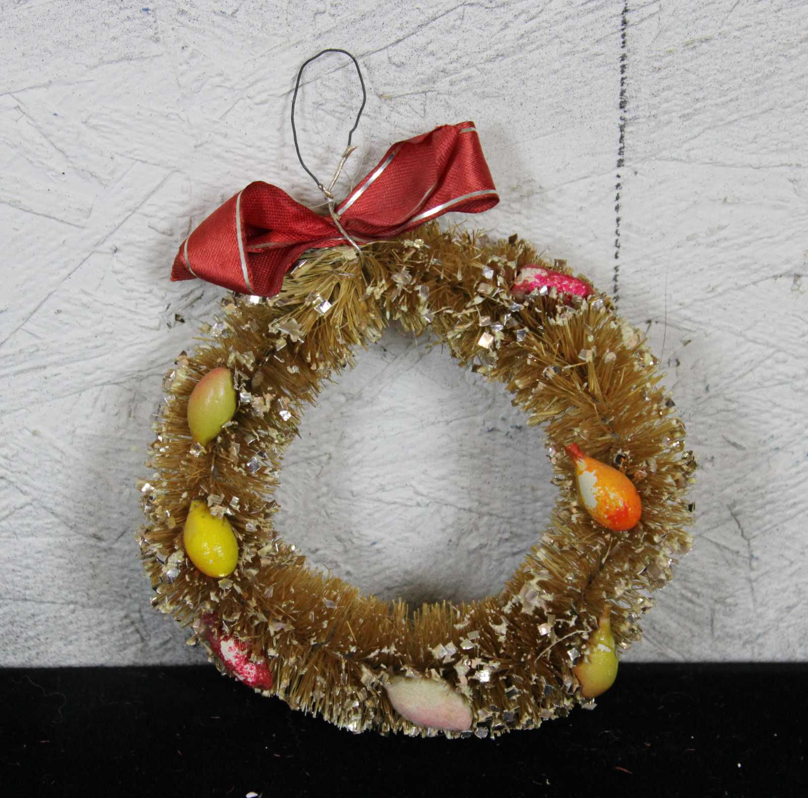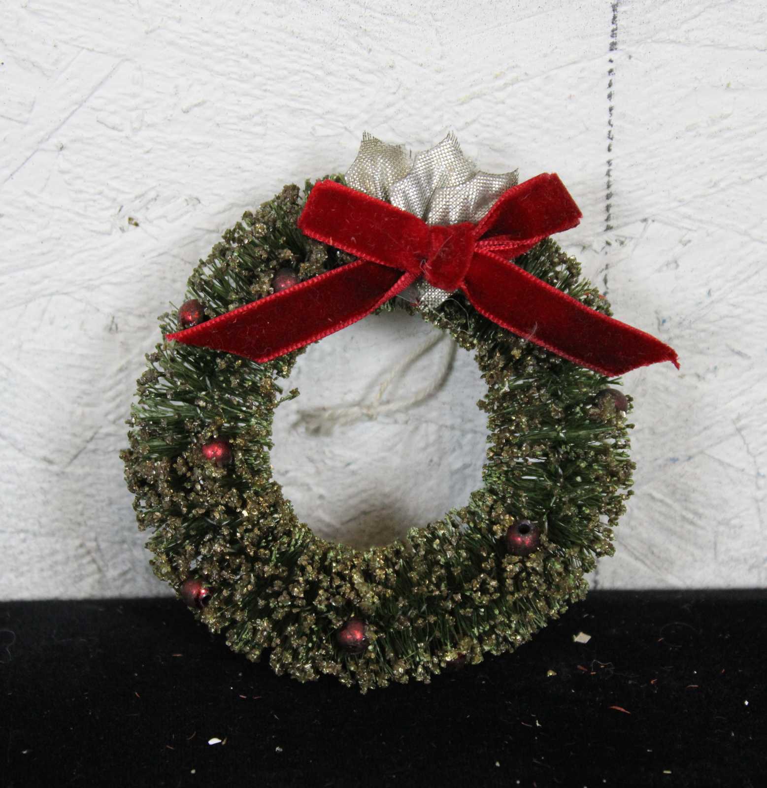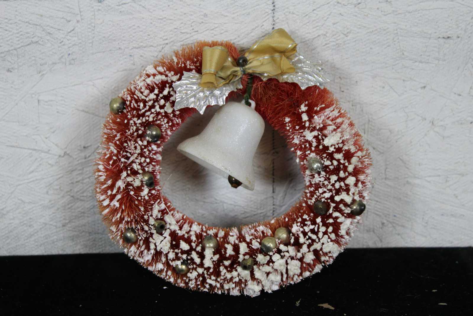 Lot of seven assorted folk art bottle brush Christmas wreaths decorated with snow, ornaments and bows.