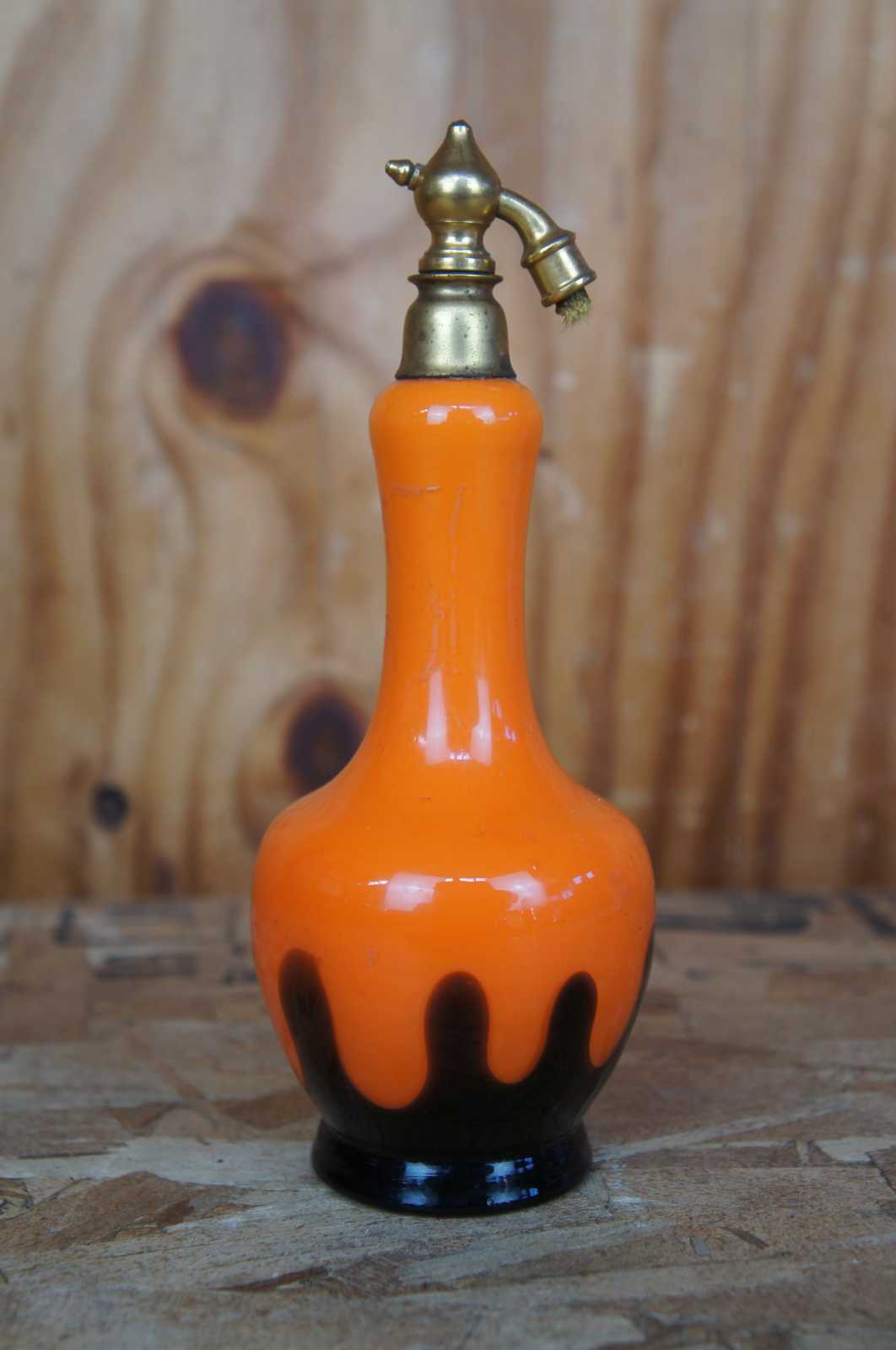 Antique Czechoslovakia (Czech) / German (Germany) tango orange art glass perfume atomizer bottle marked both Czechoslovakia and Germany on the bottom.