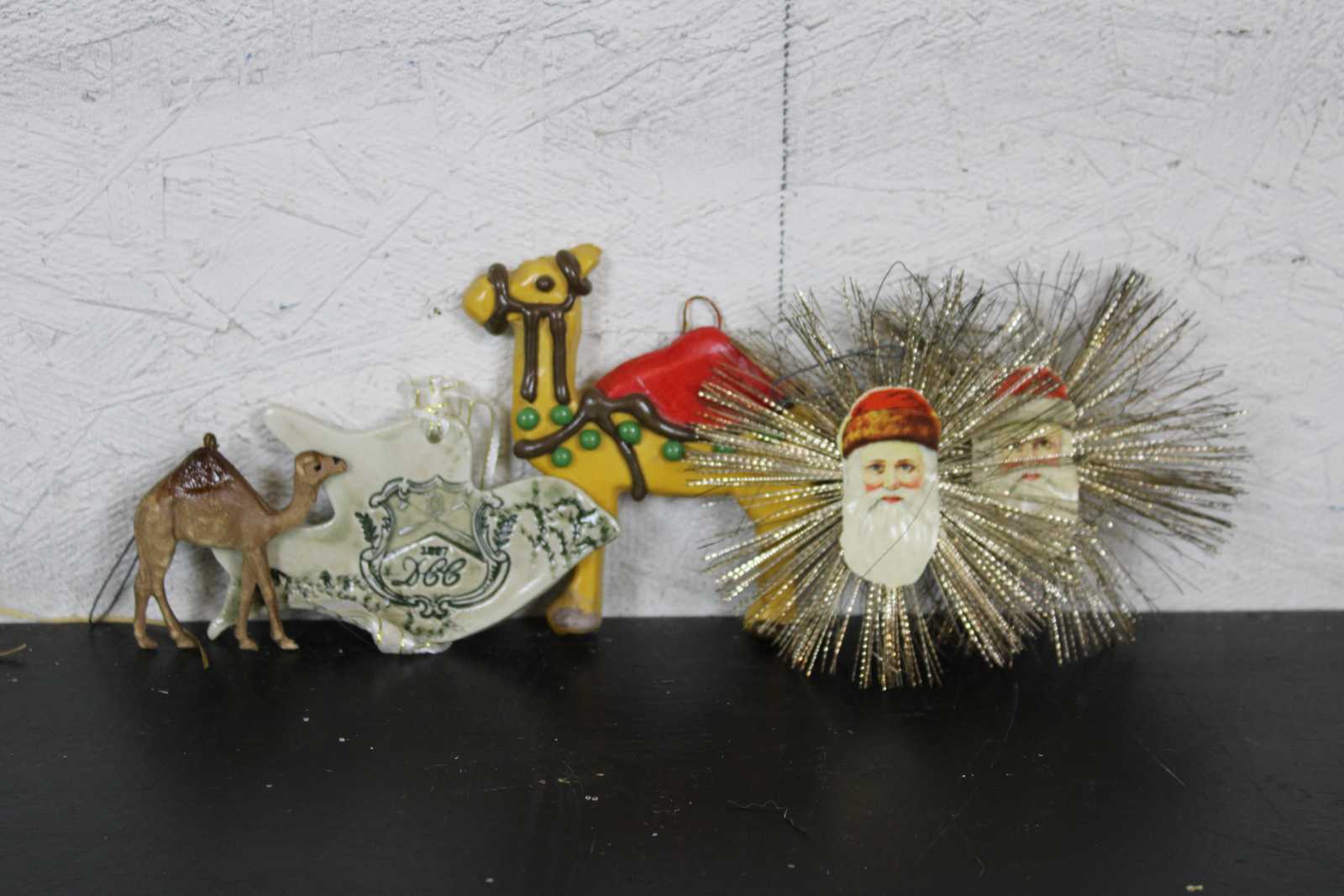 Lot of 34 antique and vintage folk art Christmas ornaments in assorted materials and designs. Featuring cone with cat, cotton santa, and in hanging ornament, dollhouse rush ladderback chair, German spun cotton santa, angel bust with wings, pillow star with moon, bird in gilt cage, German santa in sleigh, porcelain golf clubs, glitter bird, two camels, DCC dove, two santa faces, pipe cleaner bell w santa face, bunny rabbit with carrot in backpack, pear, angel candy basket, German spun cotton snowman, wood peg girl, parrot in ring, beaded fleur de lis, clown ready to party, three birds in nests, German spun cotton santa with wreath, santa on the woon, japanese candy boot, miniature singer sewing machine, two woodpeckers on tree trunk, and German mesh celluloid santa candy container.