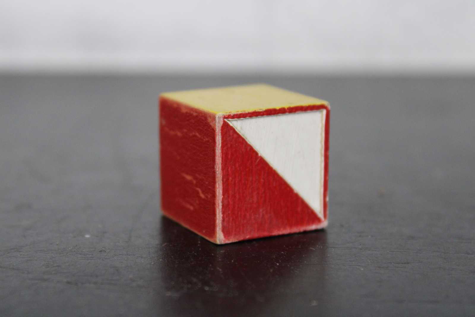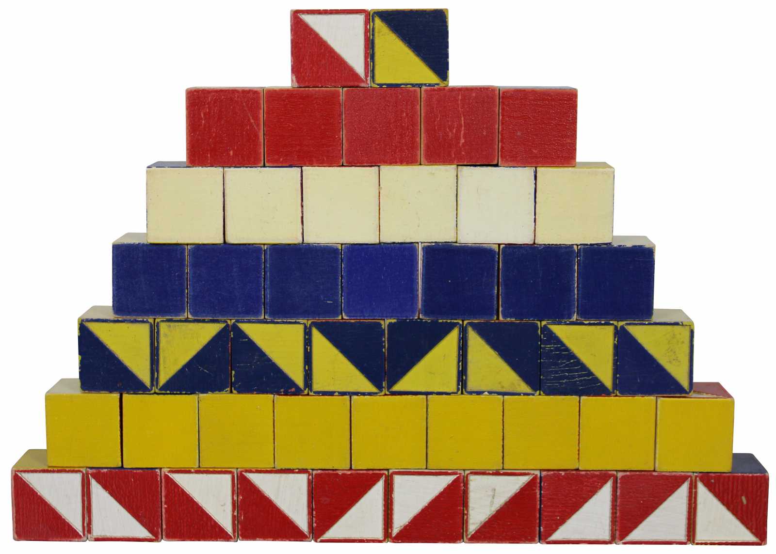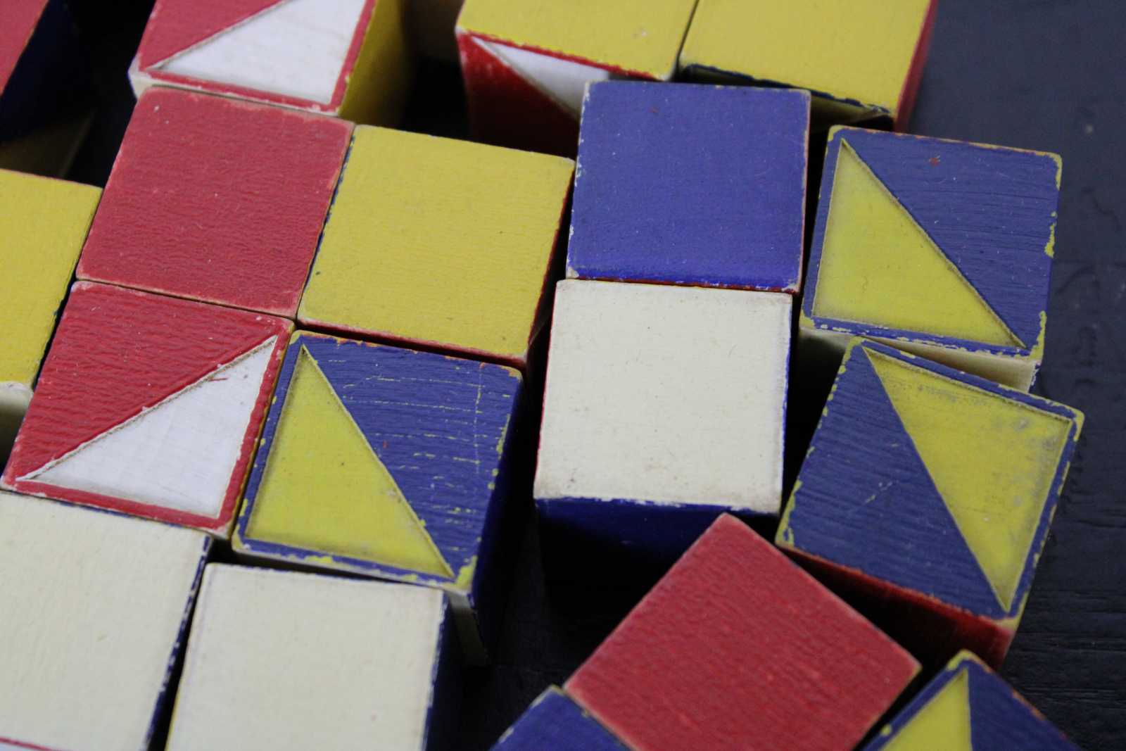 Forty seven wooden blocks for building or pattern making, painted with red, blue, yellow and white geometric halves. Color cubes teach designing initiative colors, concentration symetry observation patience, made by the embossing compnay of Albany New York. No 12.