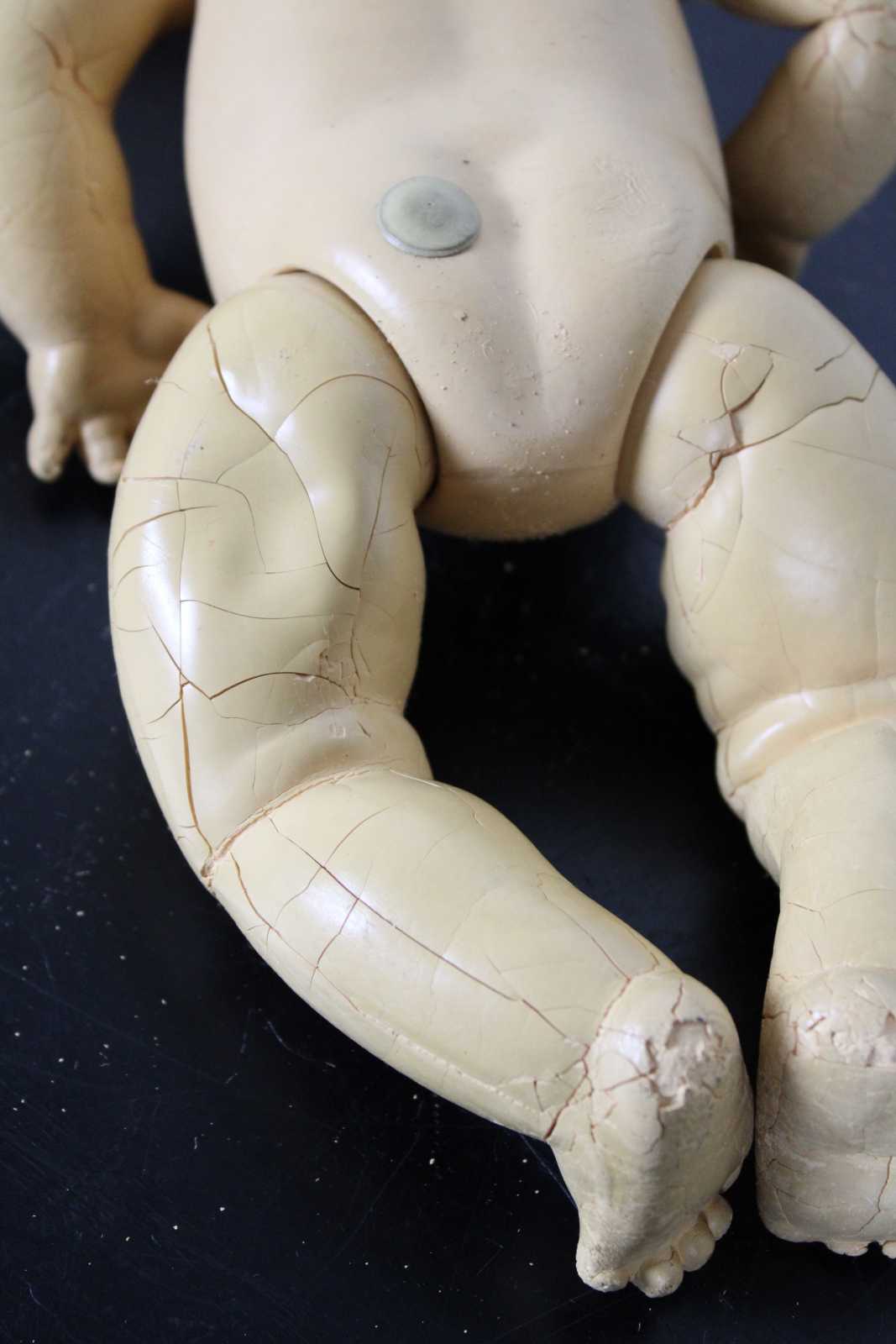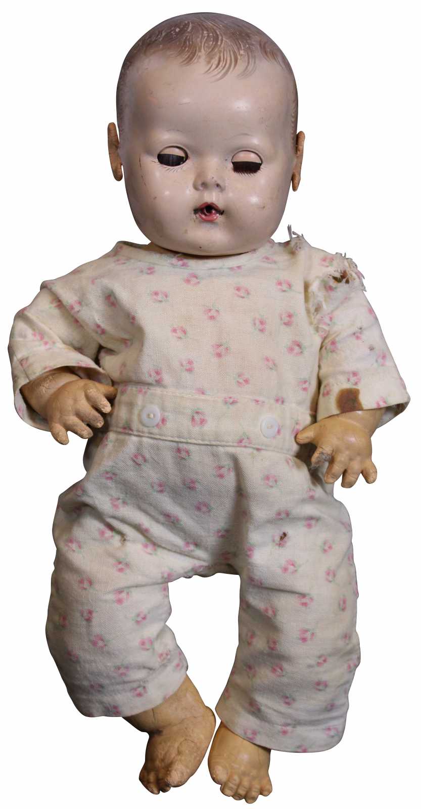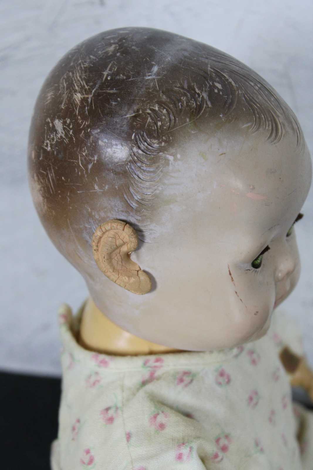 Antique Effanbee Dy-Dee baby doll with molded hair, green sleep eyes, articulated limbs, and dressed in flannel pajamas. “1933-1950s Effanbee Dy-Dee Baby doll, earliest dolls are made with a hard rubber head, later dolls were made of hard plastic, blue, brown or green sleep eyes, real upper lashes, single stroke brows, painted lower lashes, open mouth, applied soft rubber ears, molded painted hair, soft rubber body jointed at the neck, arms and hips, First drink and wet baby doll, came dressed in cotton flannel diaper, doll marked on back DyDee Baby U.S. Pat. 1-857-485 England-880-060 France-723-980 Germany-585-647 Other Pat. Pending.”