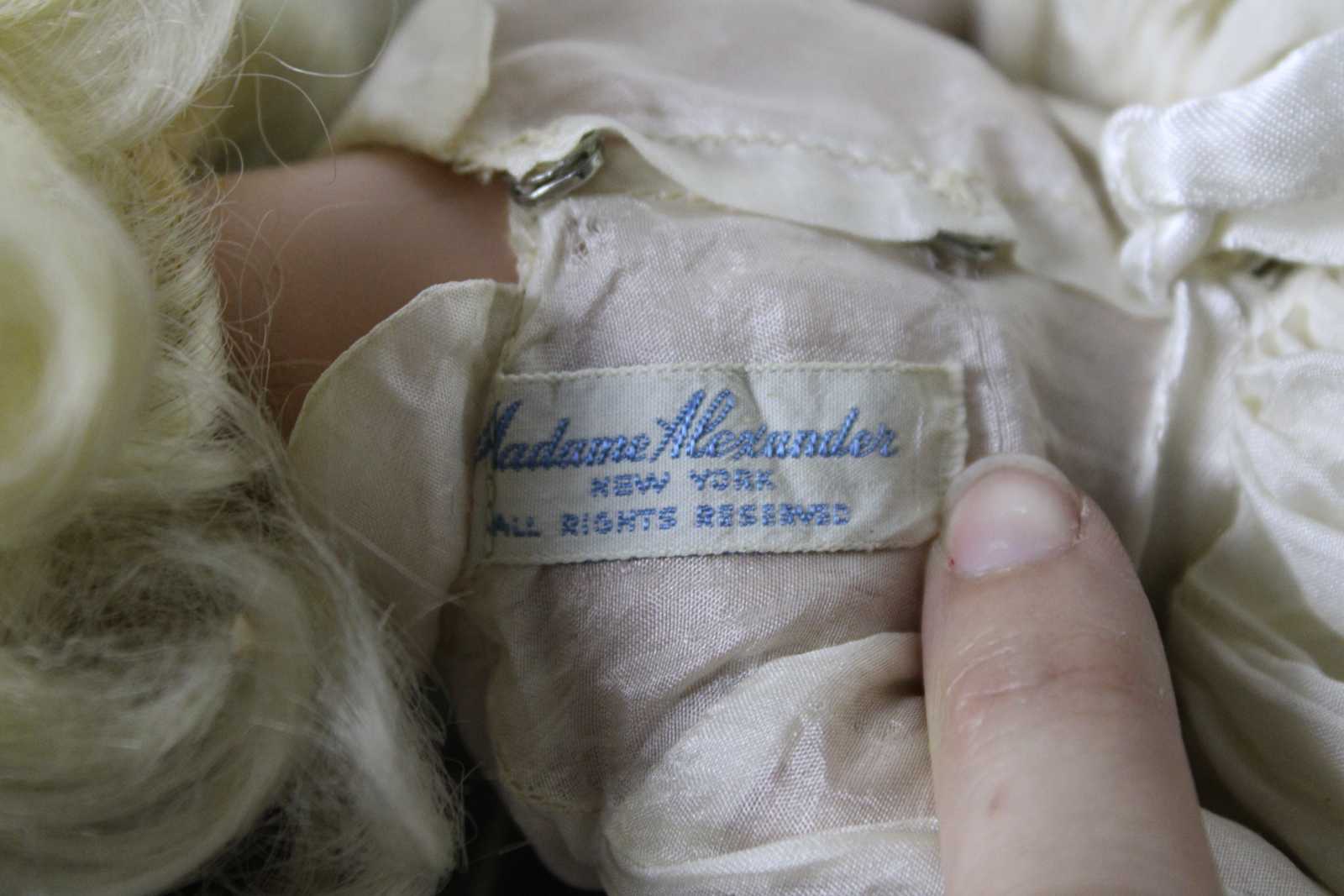 Vintage mid century Madame Alexander doll dressed as a bride with blonde hair, blue, sleep eyes, a cap veil and long sleeved chiffon gown.