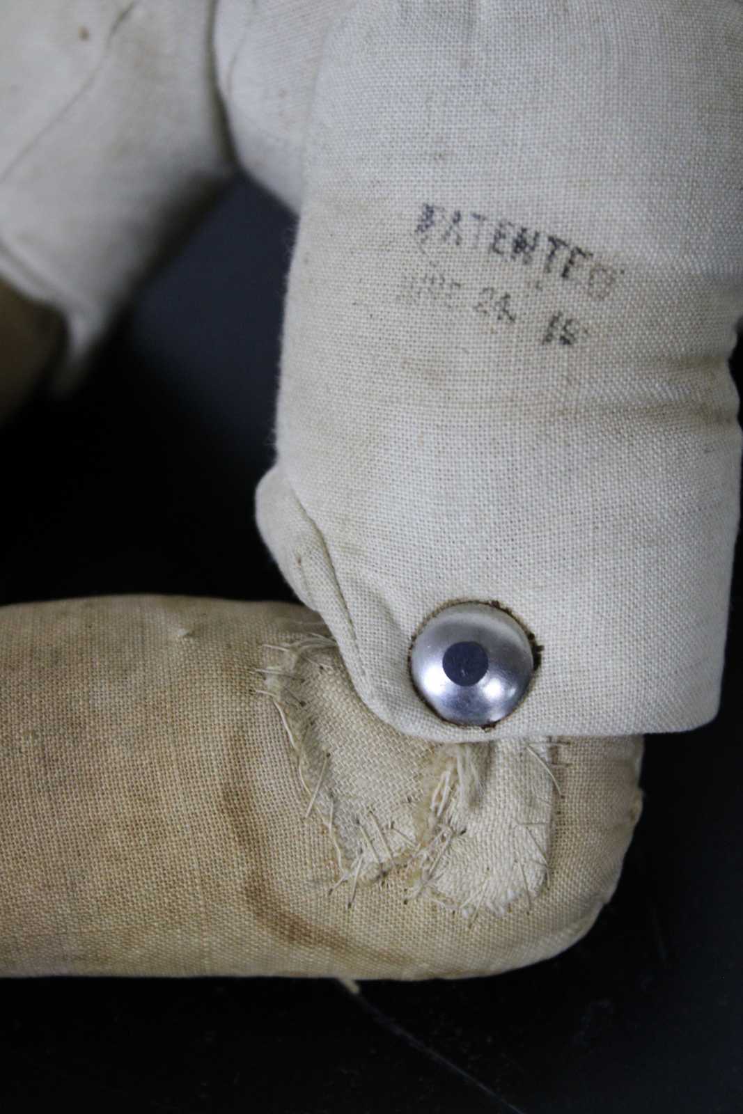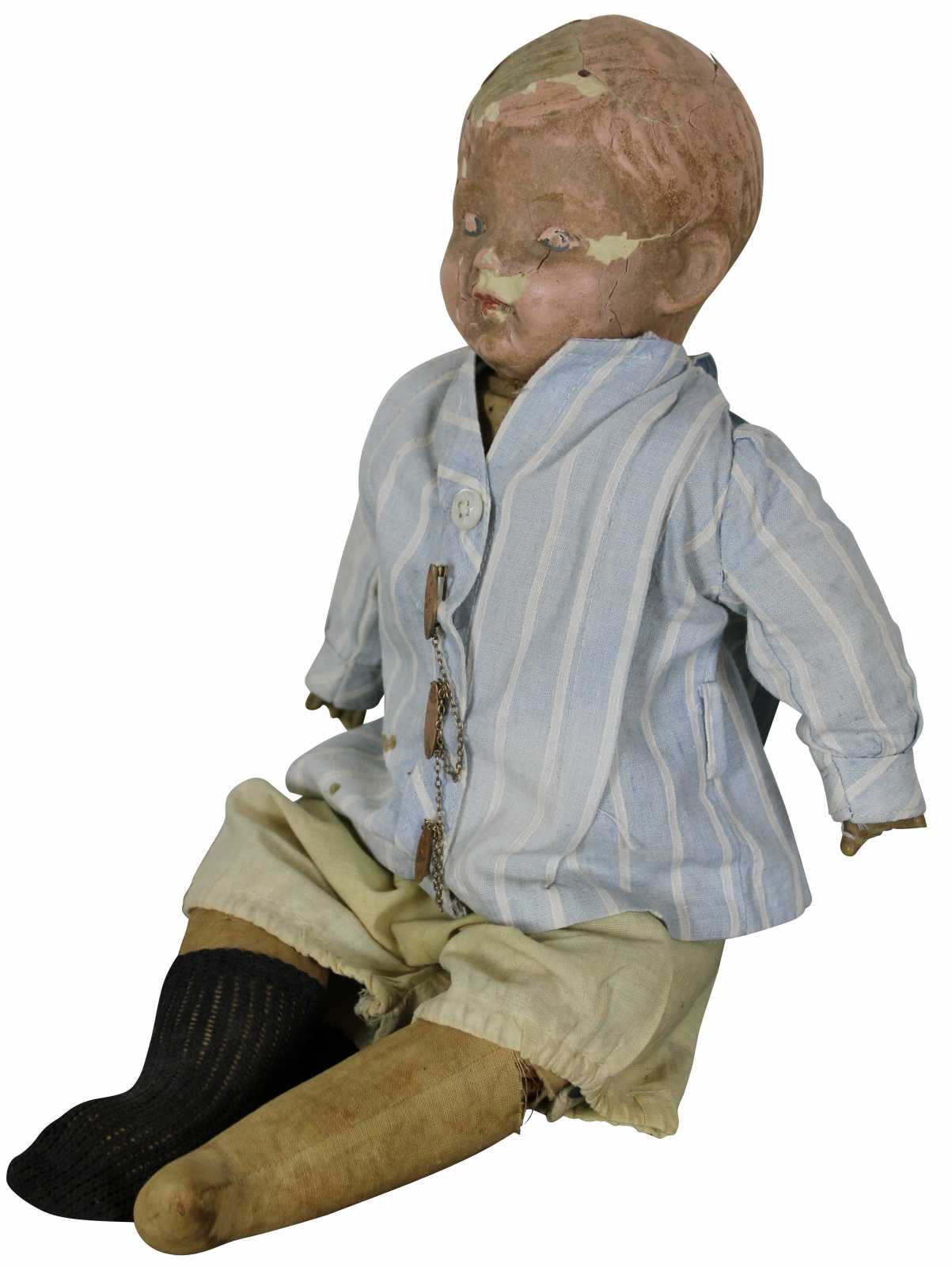 Fair Condition - Dirt/heavy chipping to head; missing fingers; stains/discoloration to fabric; split in leg; couple of patches; missing sock.