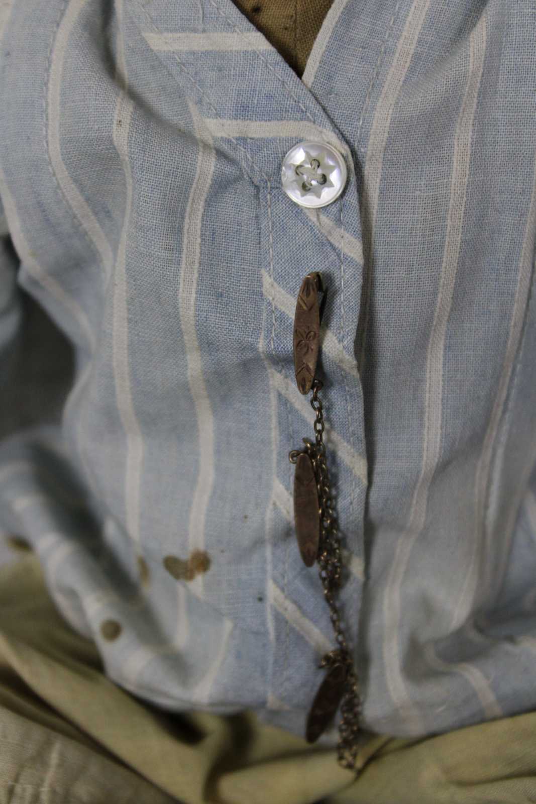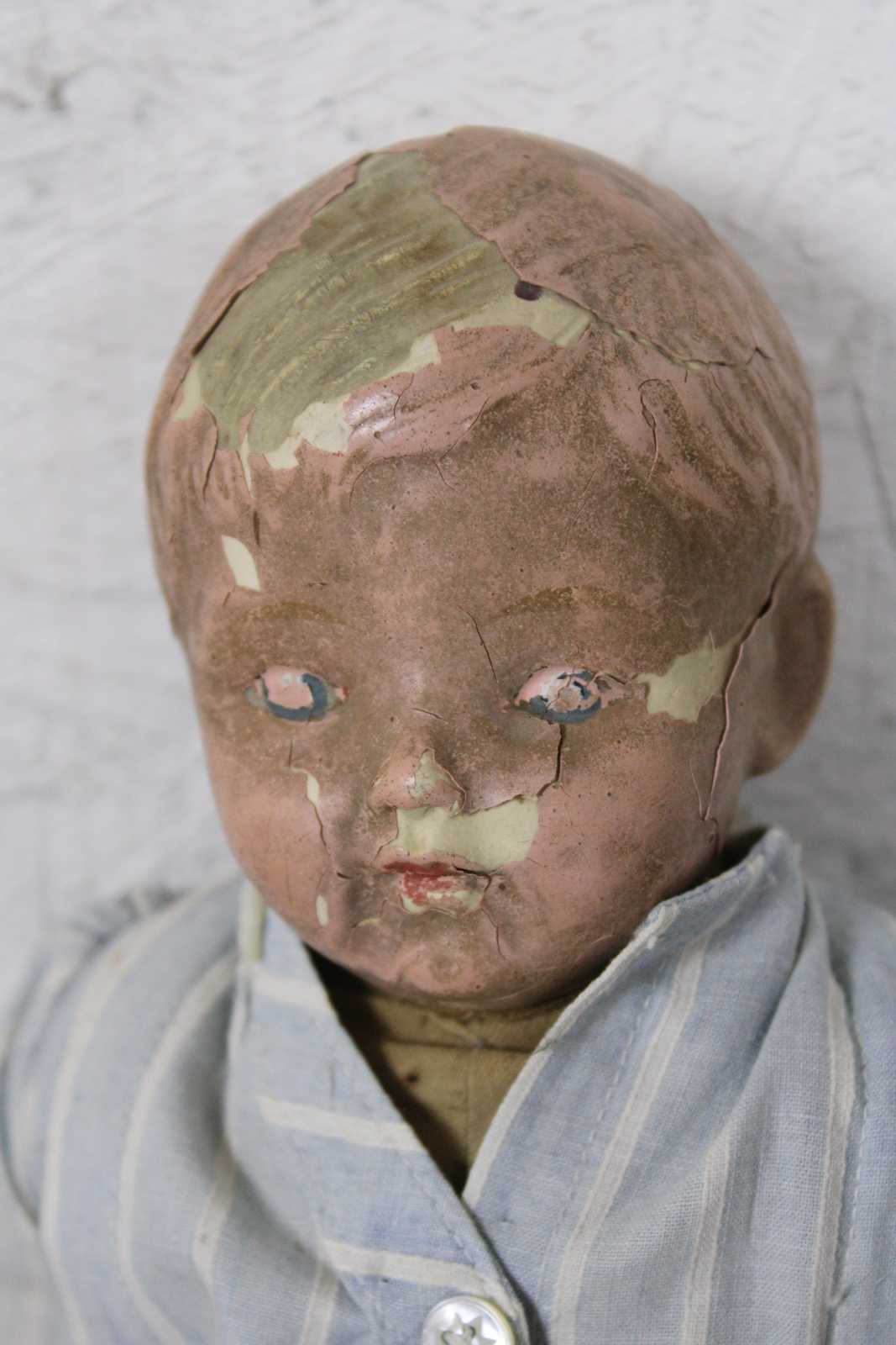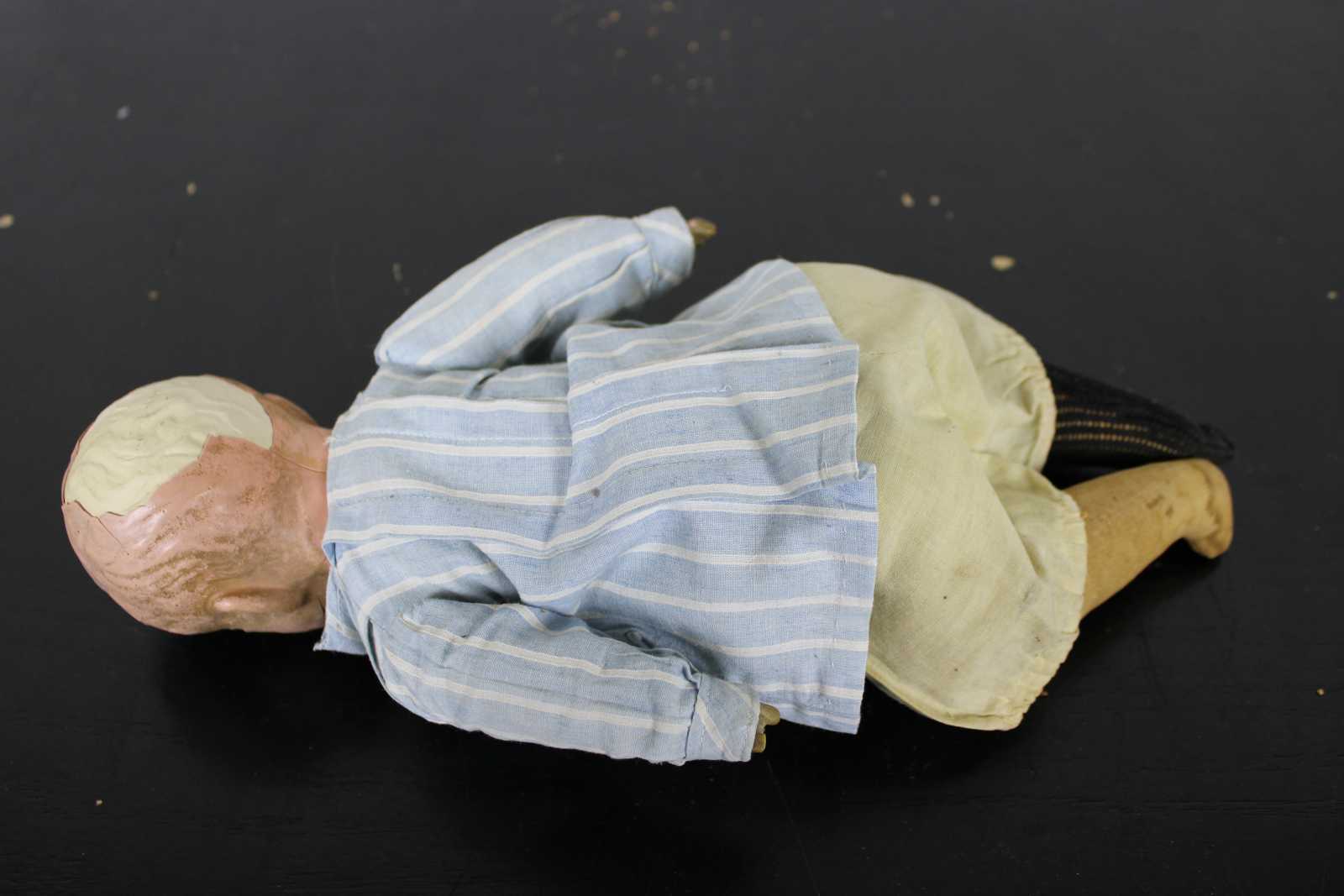 Antique boy baby doll with painted composition head and hands with jointed cloth body, dressed in a blue striped pajama shirt and white pants.
