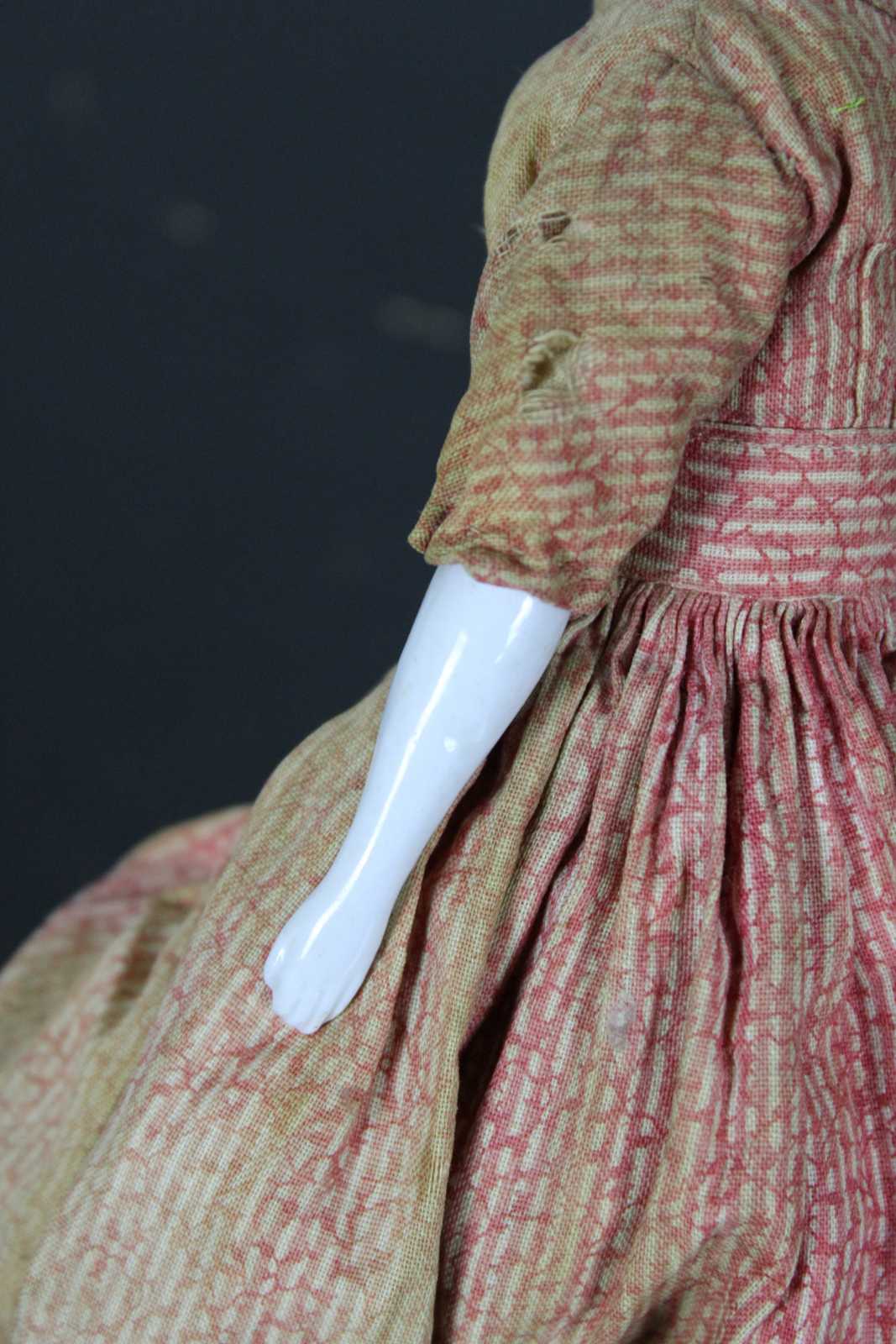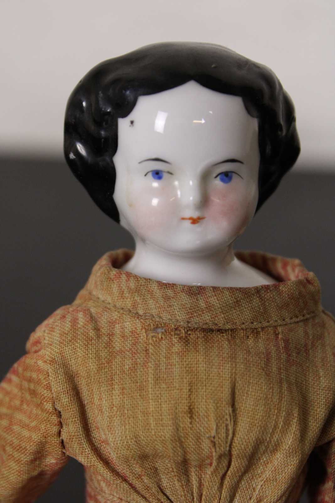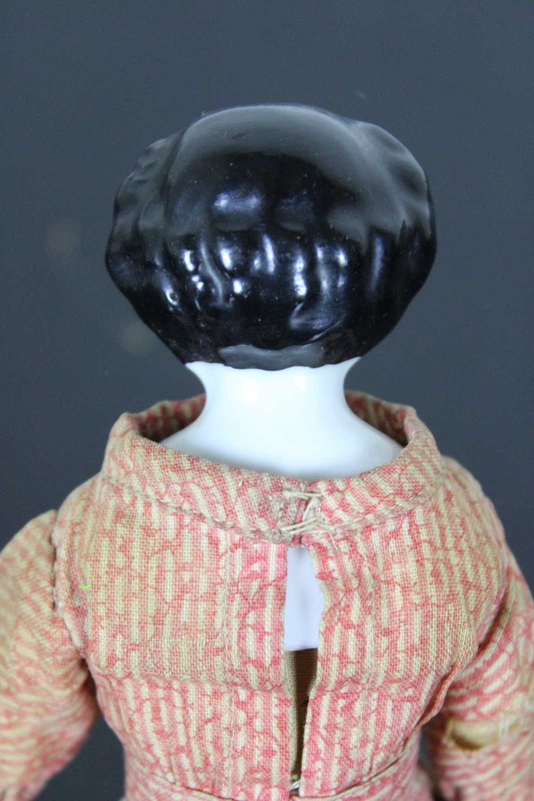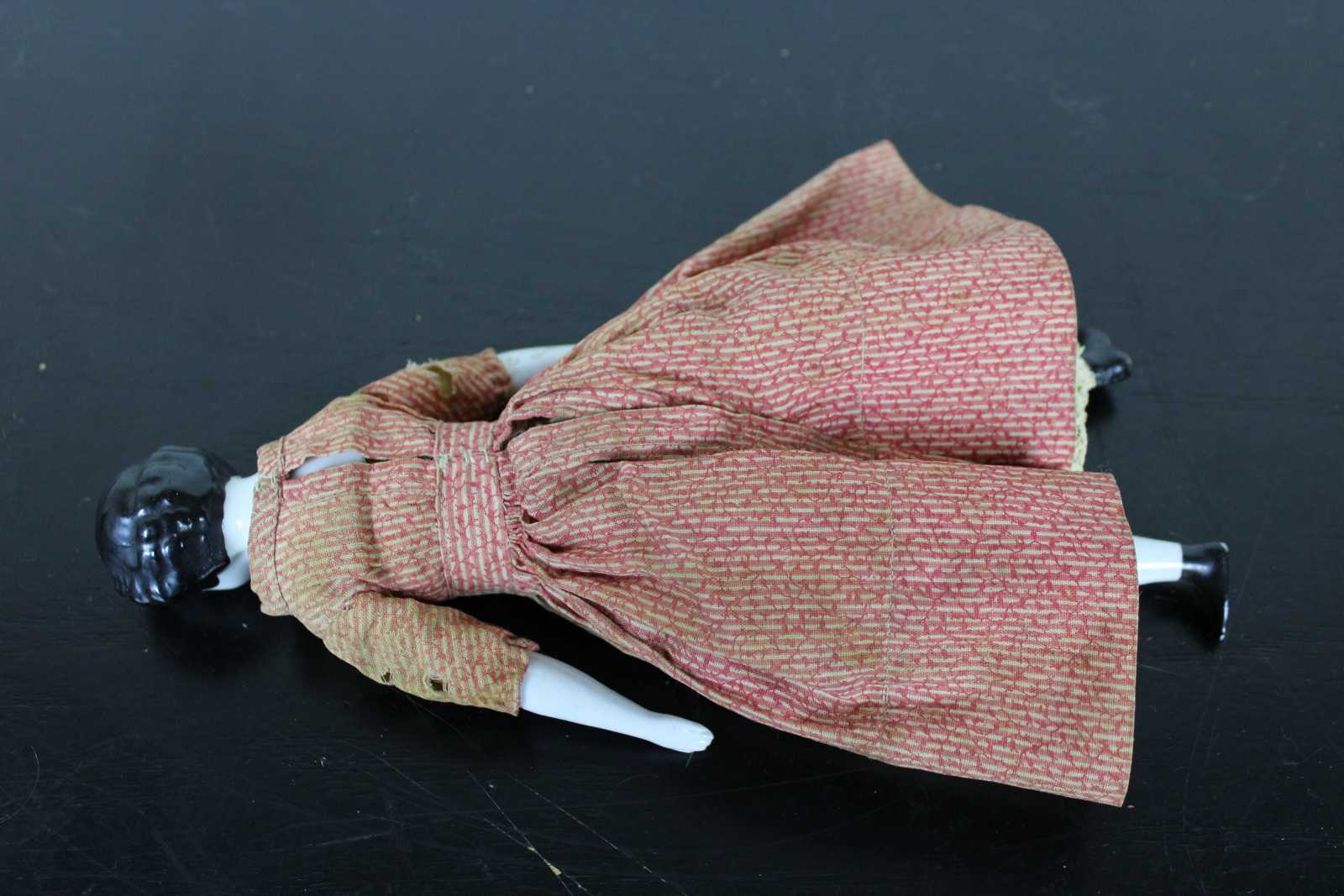 Antique mid 19th century German china head doll with black hair and blue eyes, sawdust filled cloth body, dressed in a red print dress with petticoat and authentic split drawers.