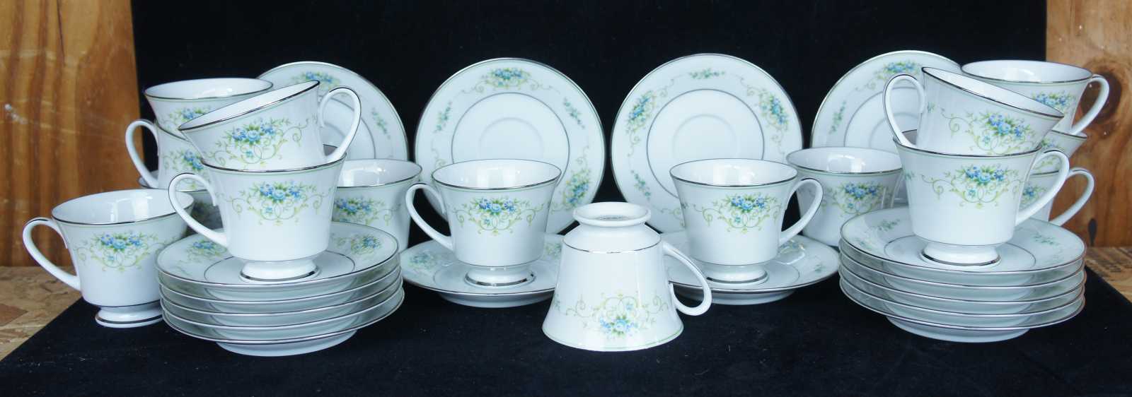 Set of thirty two vintage Noritake Sri Lanka Culeton 2692 dinner and salad plates featuring silver rim with a floral motif of blue, green and yellow.