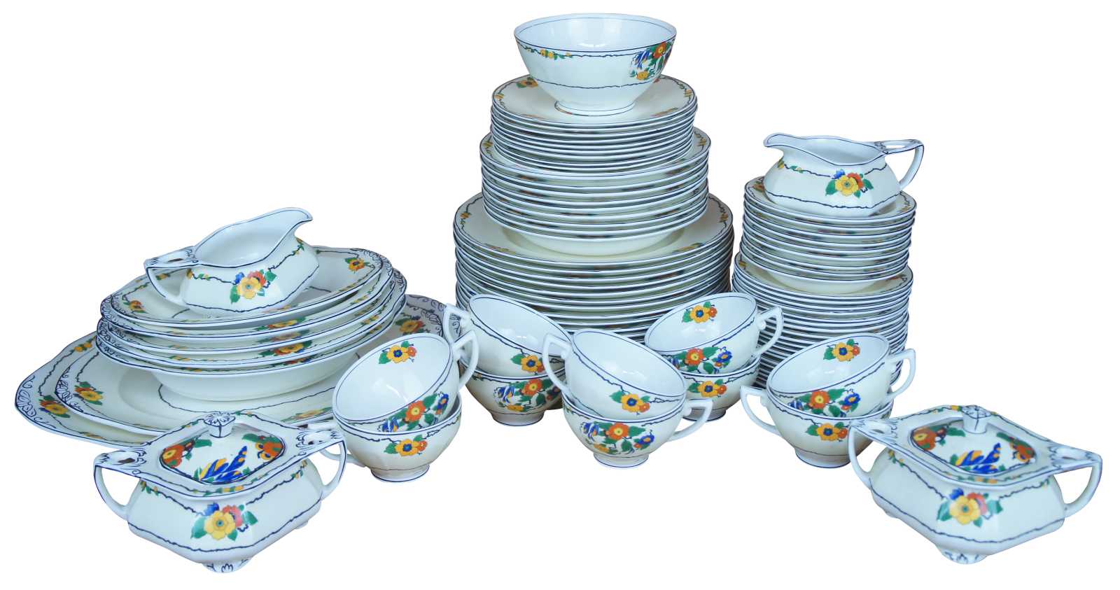 Rare antqiue English eighty five piece china tea / coffee and dinnerware set by W.H. Grindley & Co Ltd featuring Art Deco styling with vibrant Ivory flowering pattern of yellow, green orange / red, blue and purple. Circa 1920s.