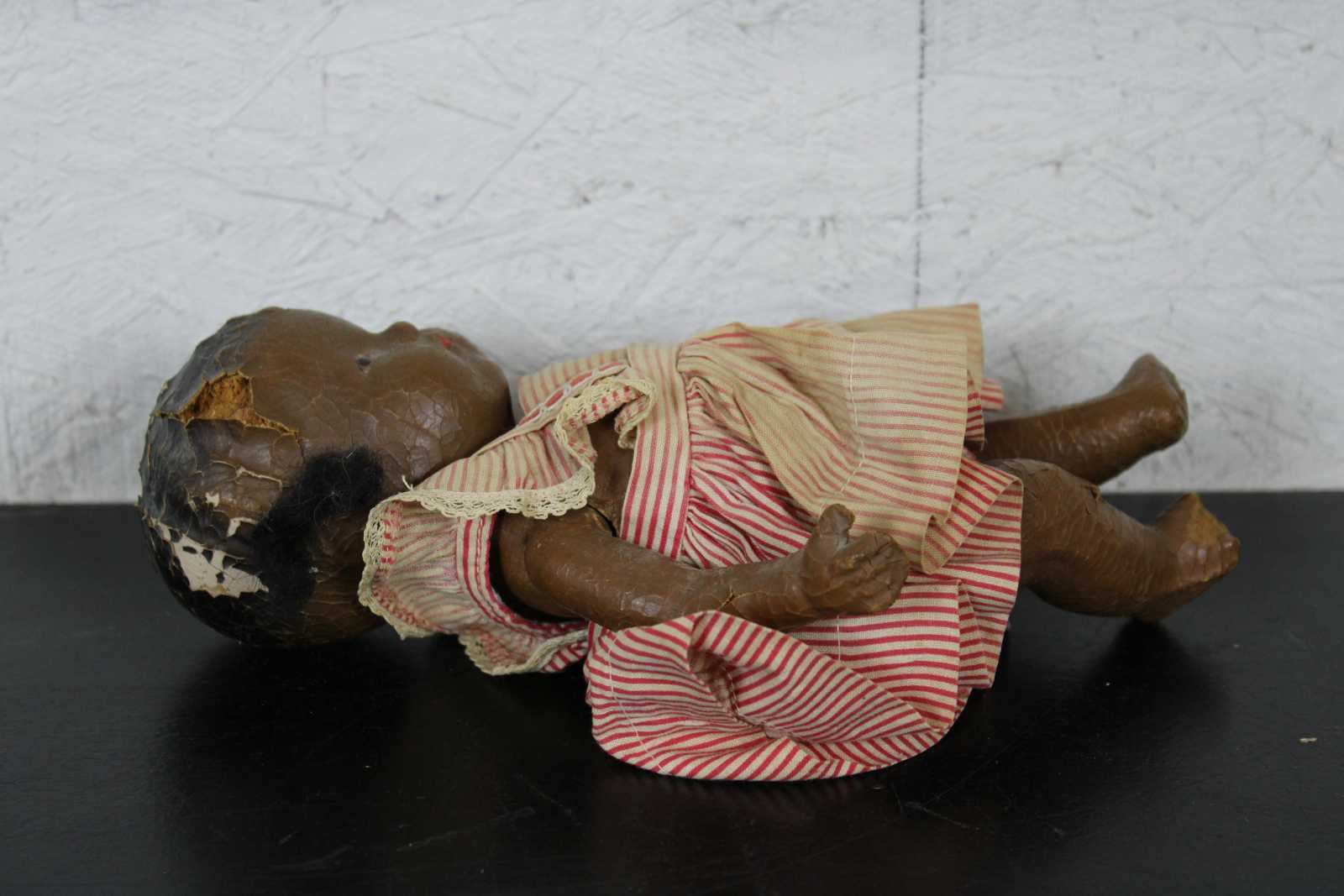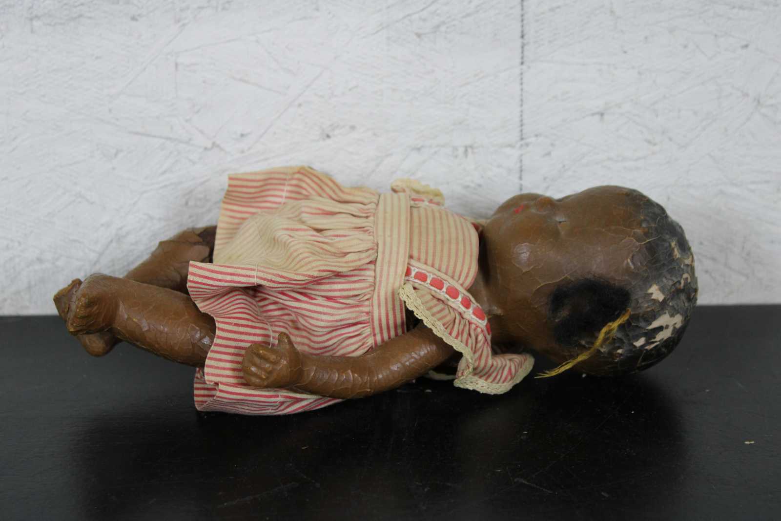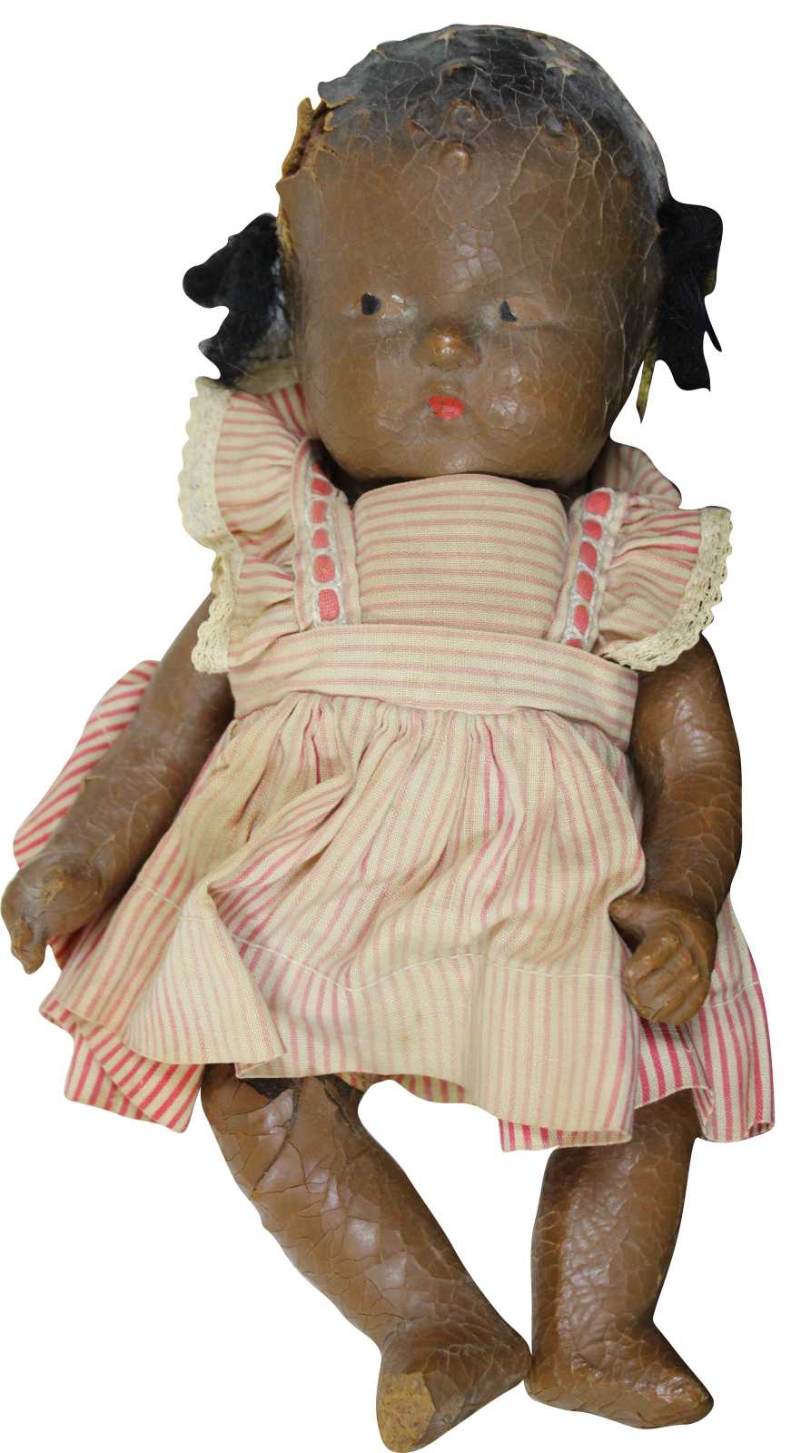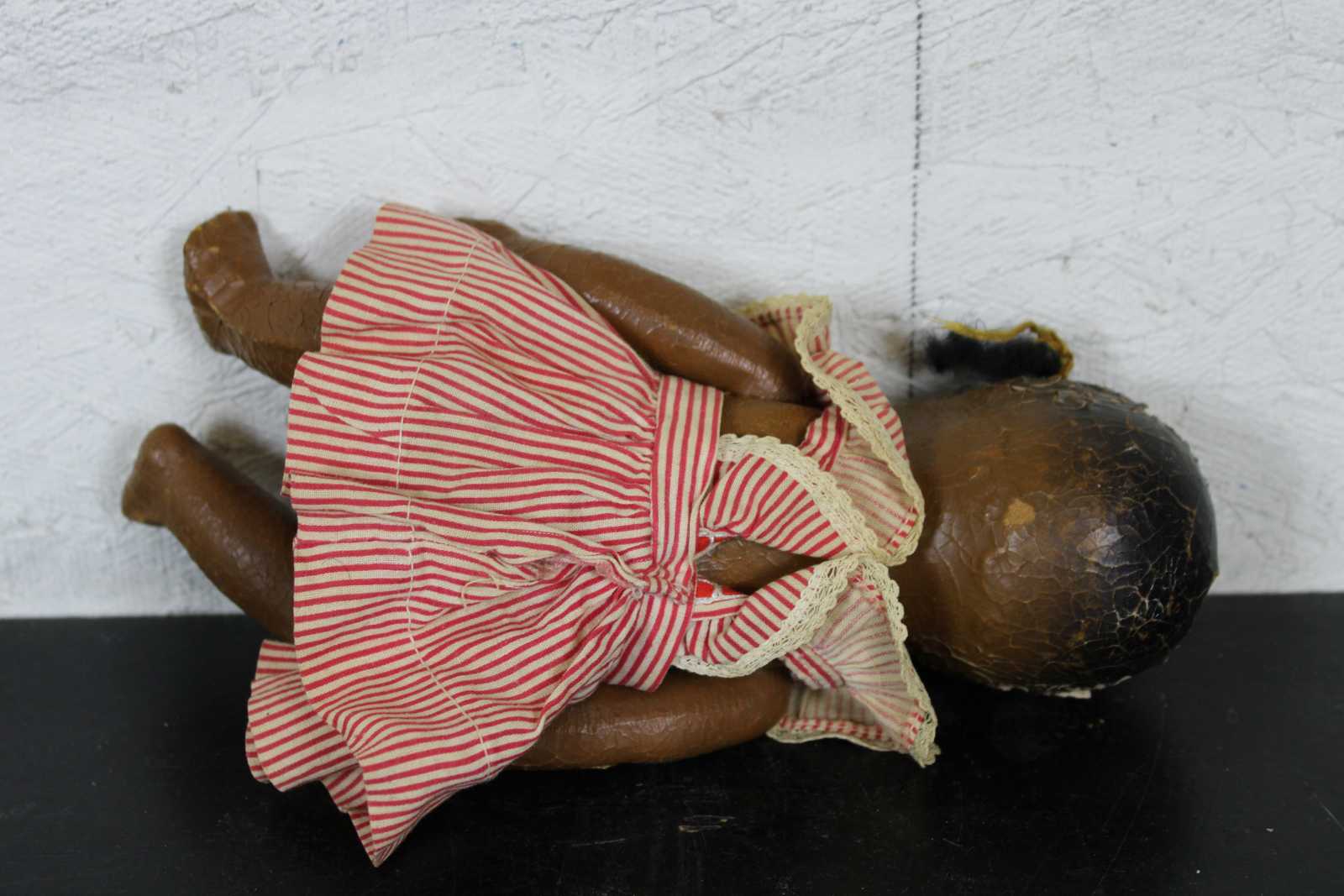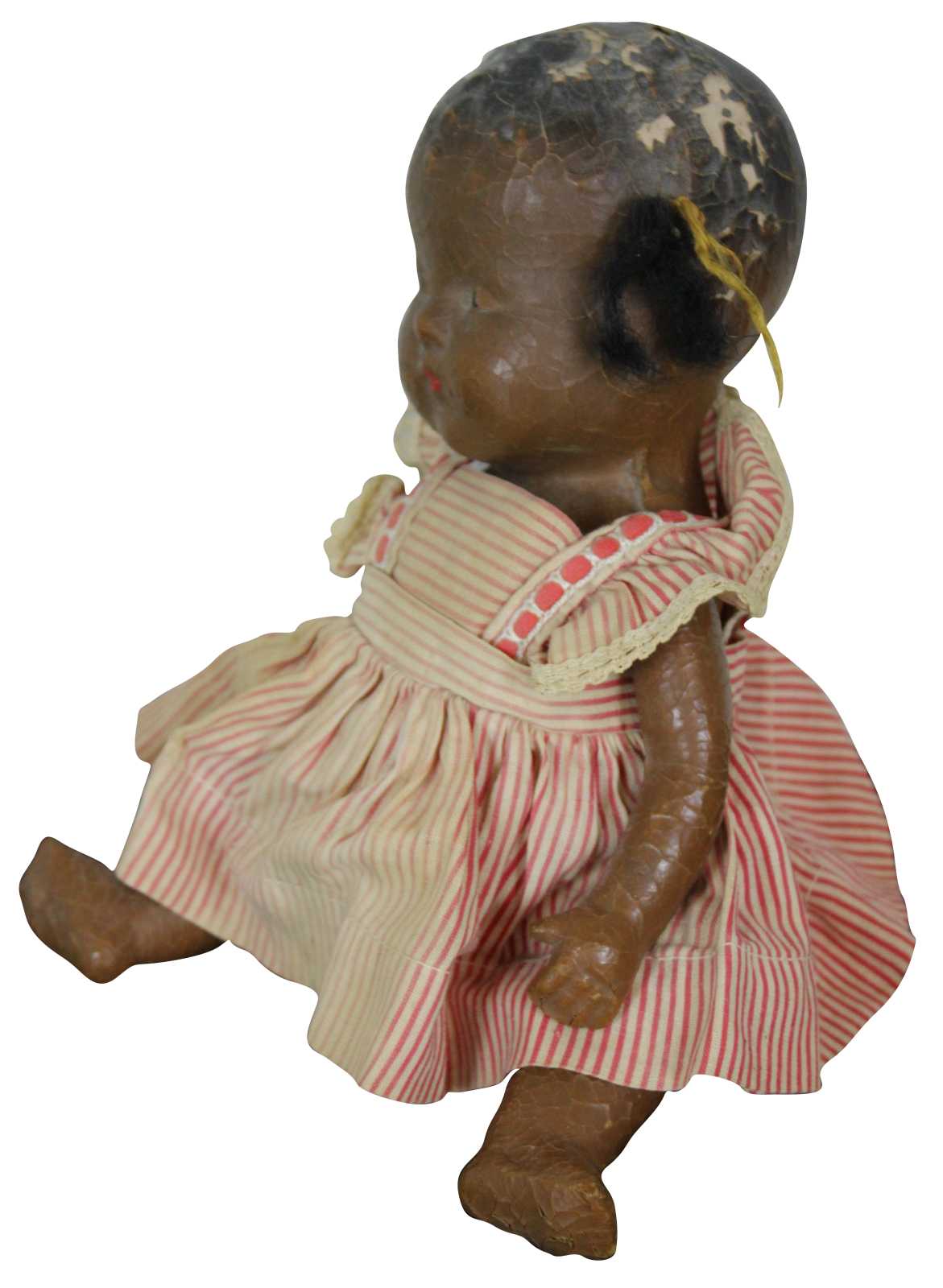Antique composition African American baby doll with jointed limbs, black hair and pink dress. Unmarked, similar to Effanbee's Patsy doll.