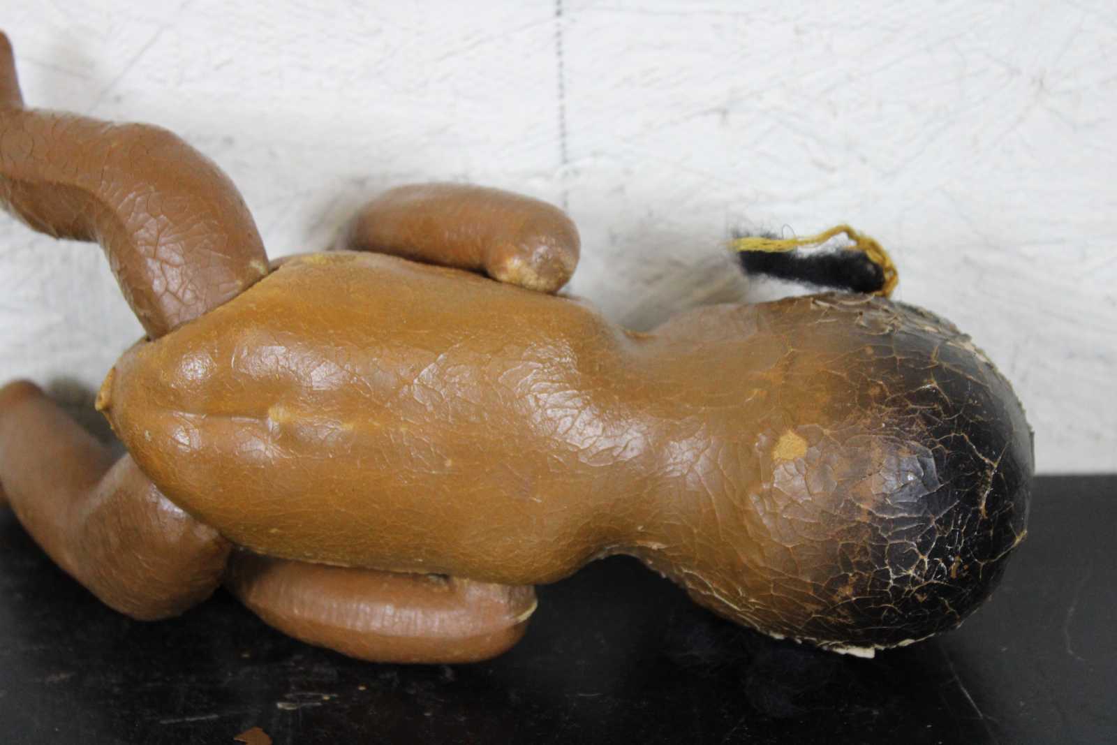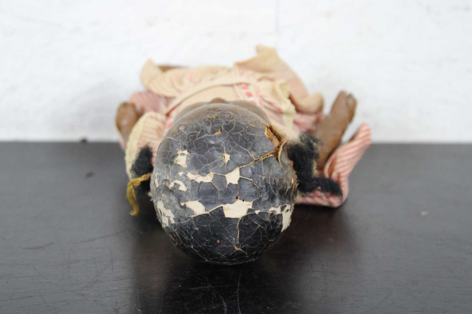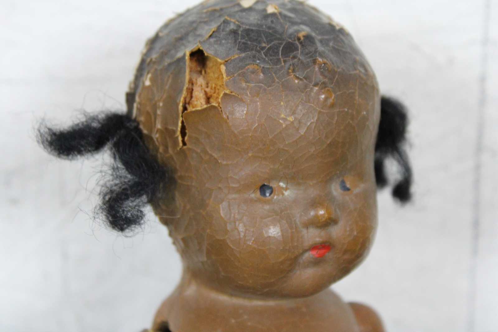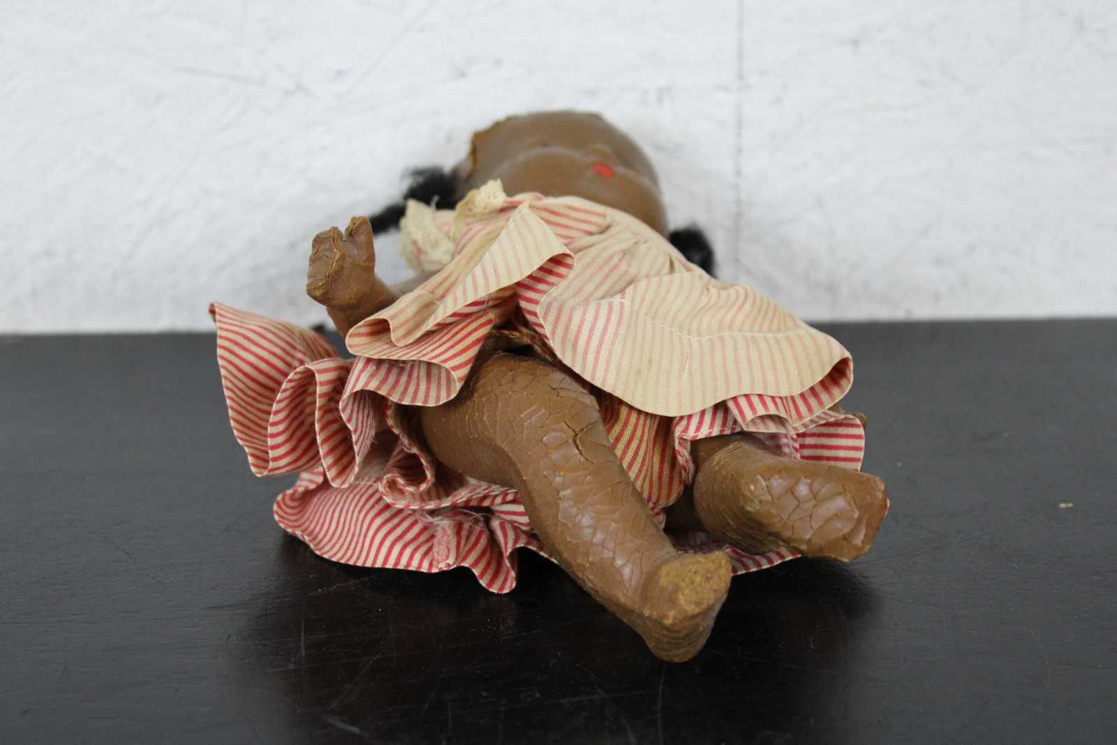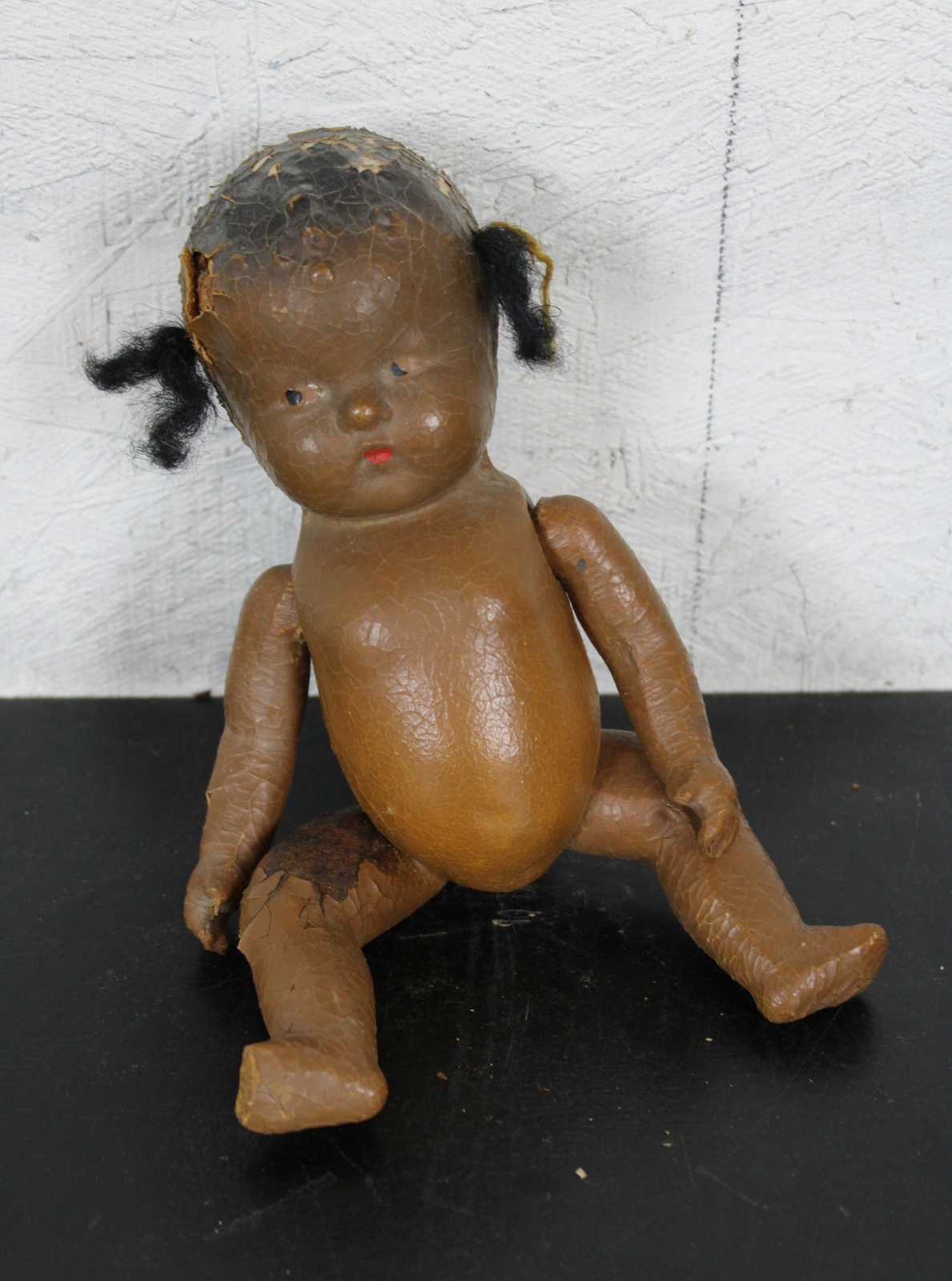 Antique composition African American baby doll with jointed limbs, black hair and pink dress. Unmarked, similar to Effanbee's Patsy doll.