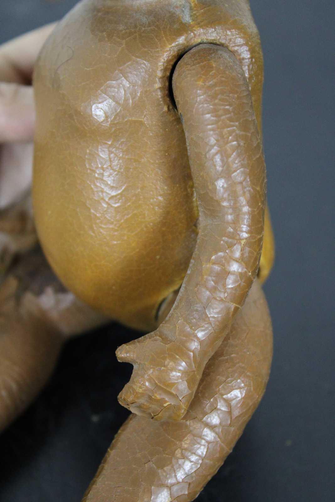 Fair - Fading to dress; stiff limb joints; heavy crazing/distressing, some chips to surface, one full hole in scalp, missing hair.