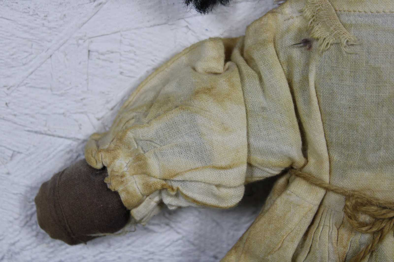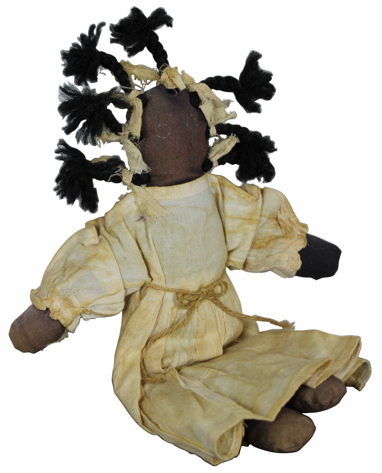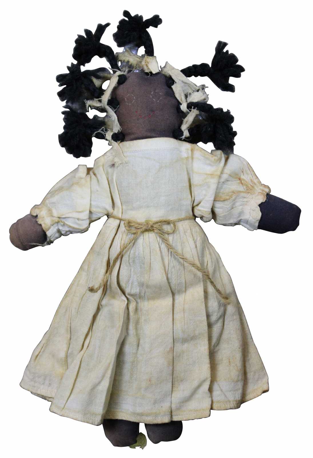 Antique African American folk art style rag doll with hand stitched features, braided hair and a simple 19th century dress.