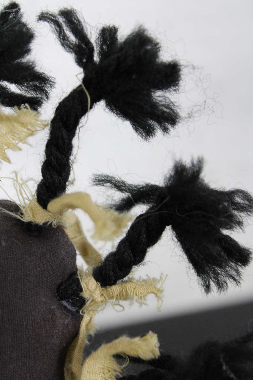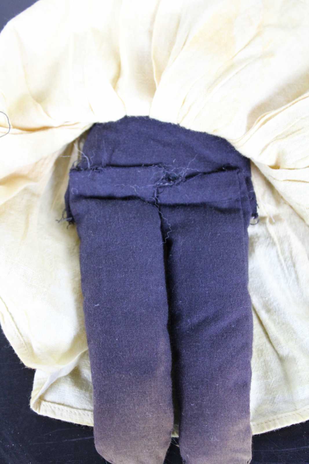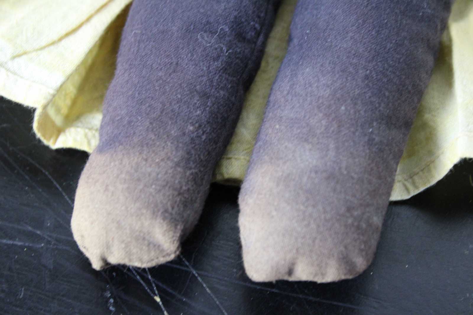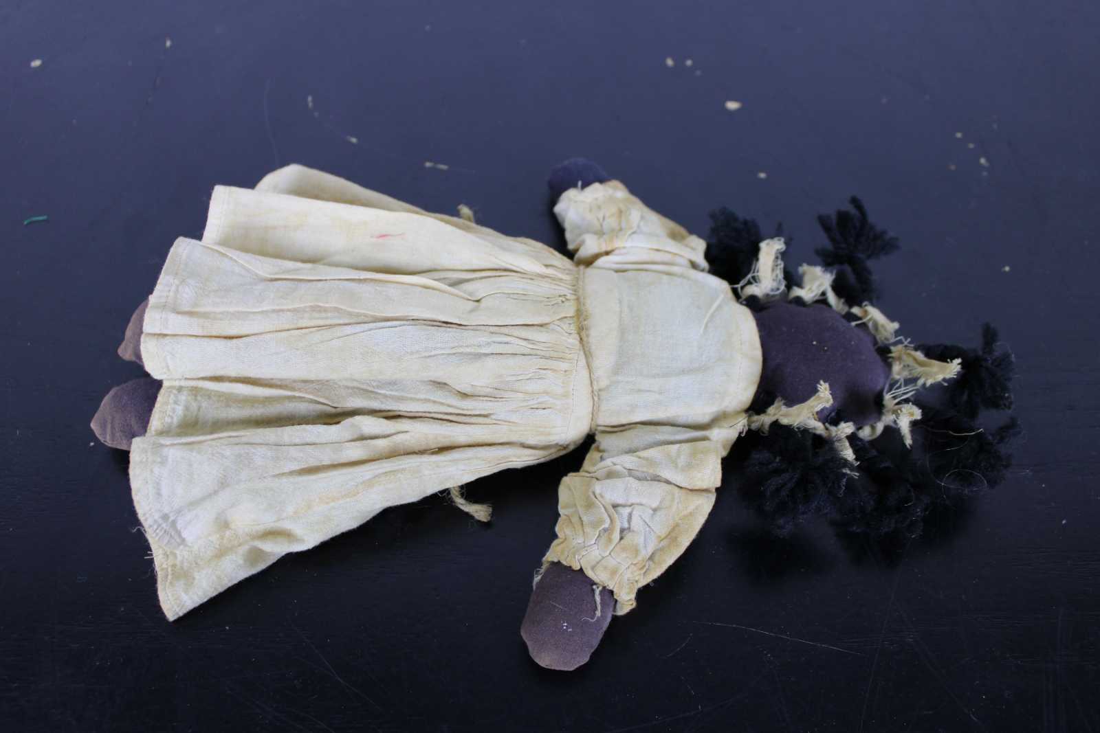 Antique African American folk art style rag doll with hand stitched features, braided hair and a simple 19th century dress.
