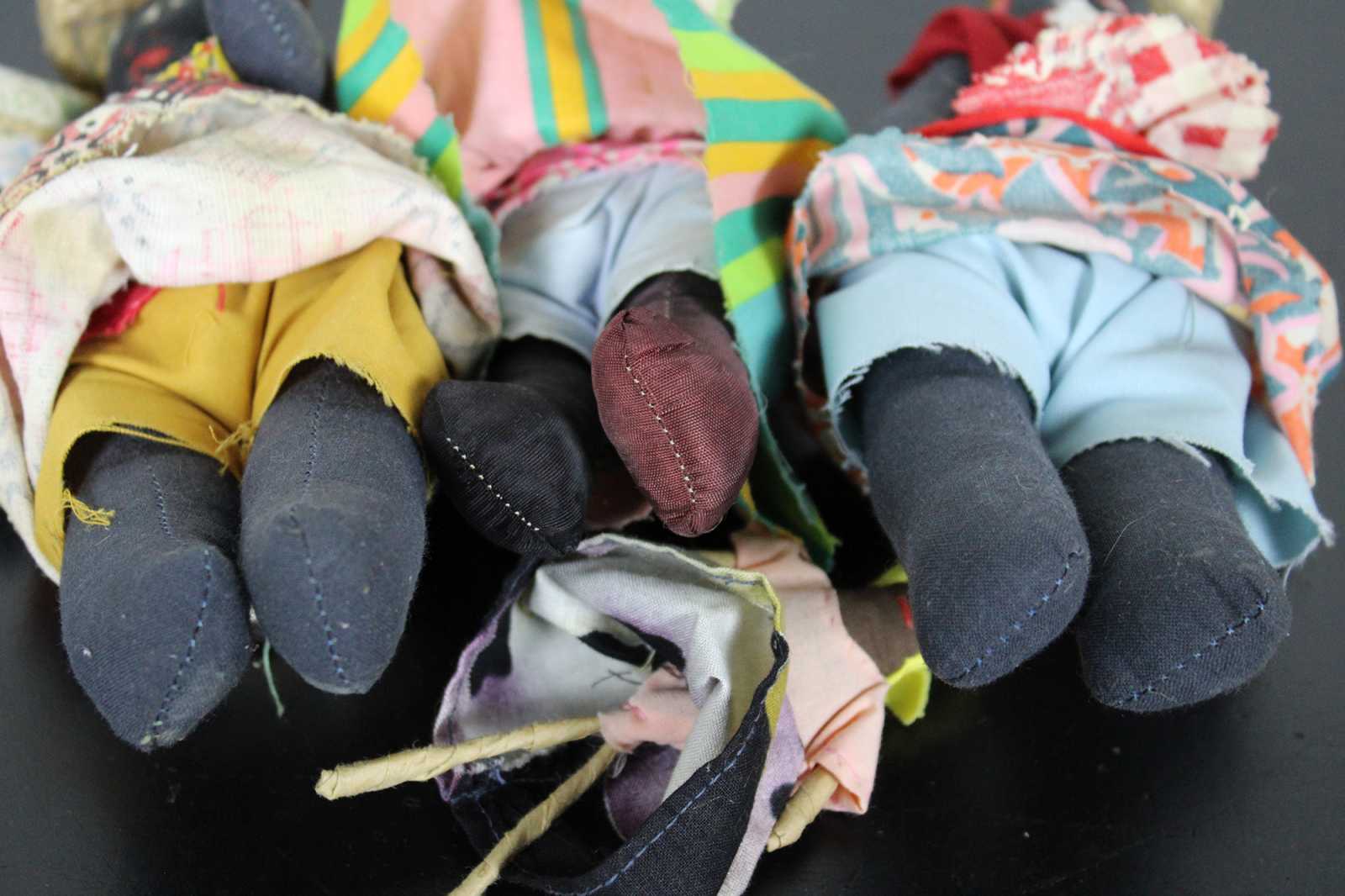 Lot of five vintage Jamaican folk art cloth dolls, three dressed in bright cotton prints with baskets on their heads, one small wooden infant figure, and one wood and cloth doll ornament.