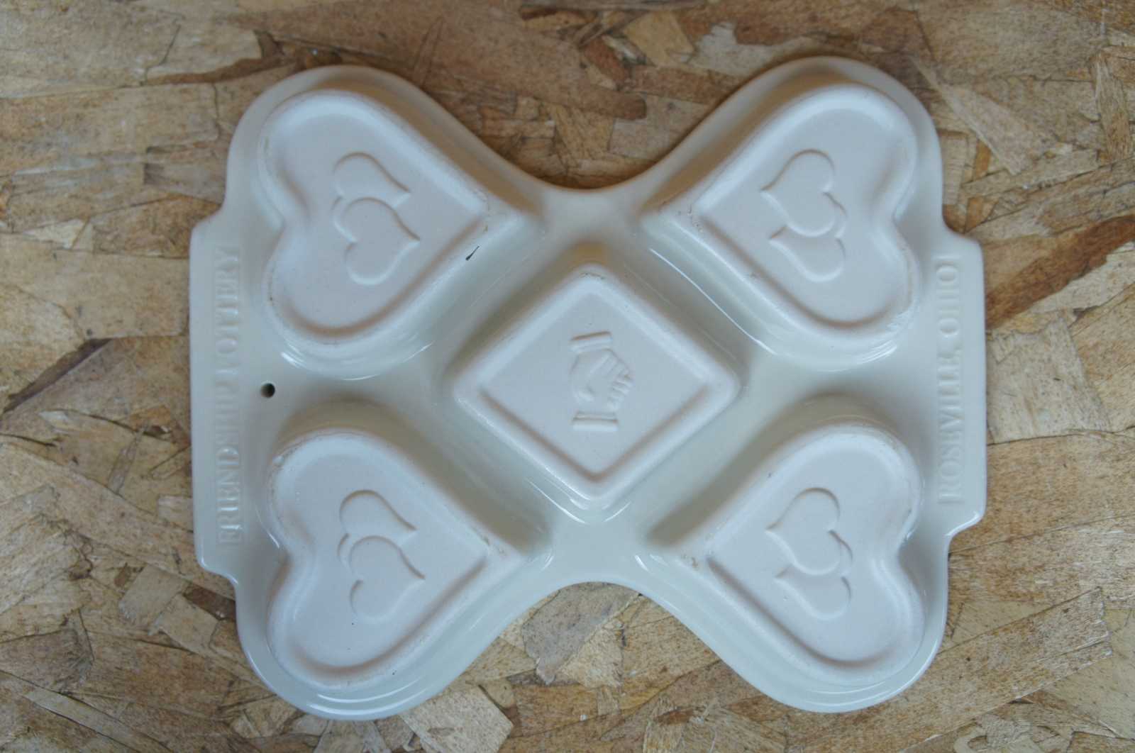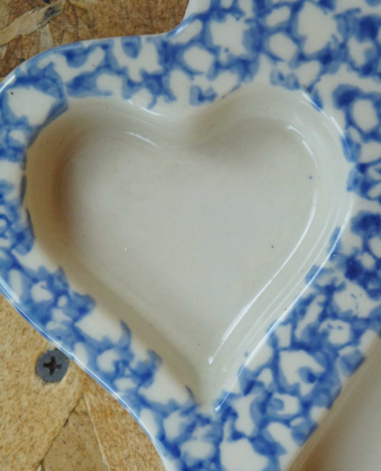 Vintage Roseville Ohio blue spongeware "Friendship Pottery" heart / diamond muffin mold or pan.