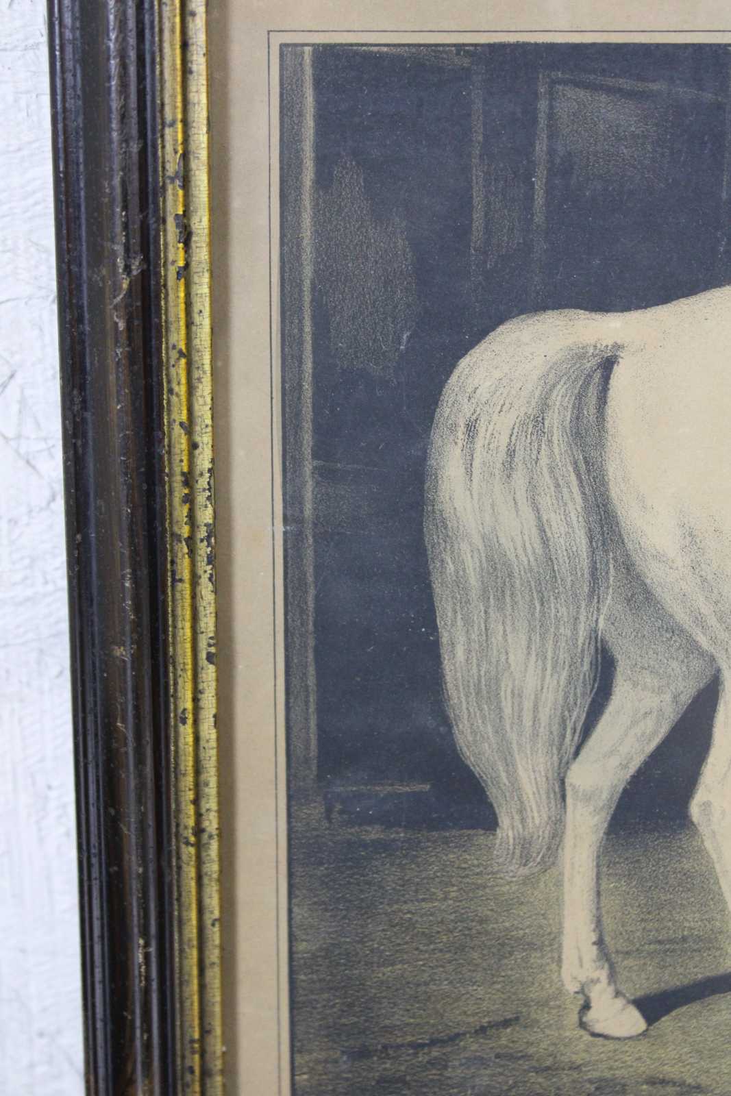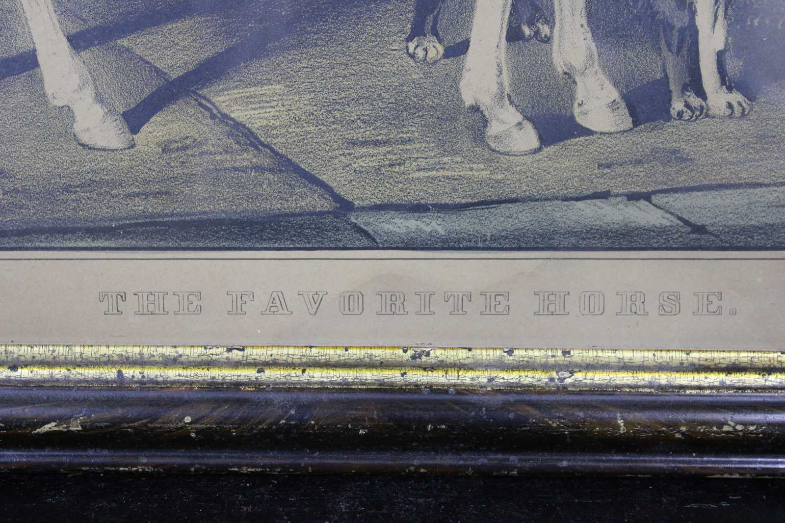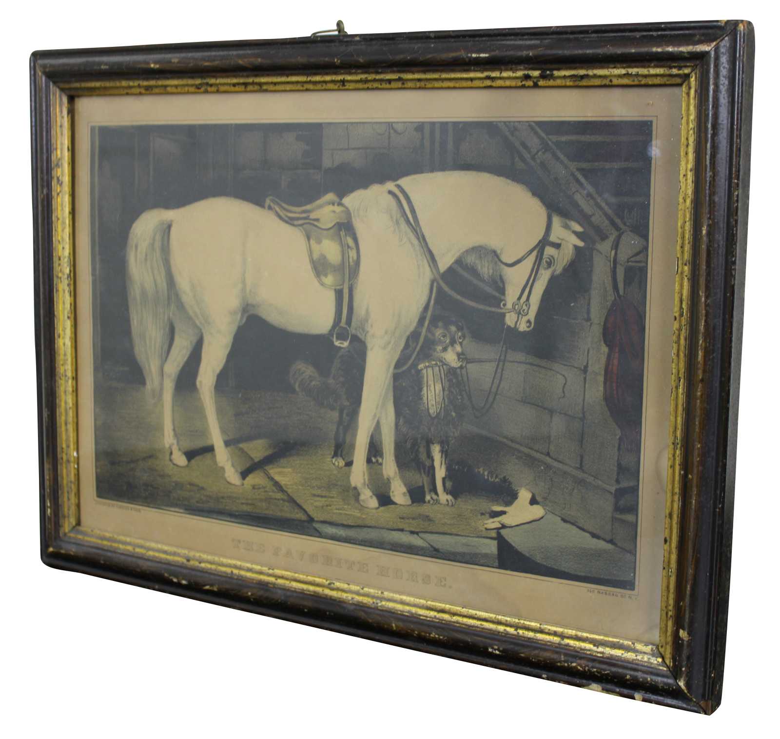 Antique lithograph print by Currier and Ives titled “The Favorite Horse” showing a white horse saddled in a stall with a border collie holding a riding crop in its mouth.