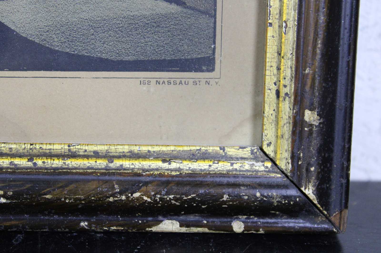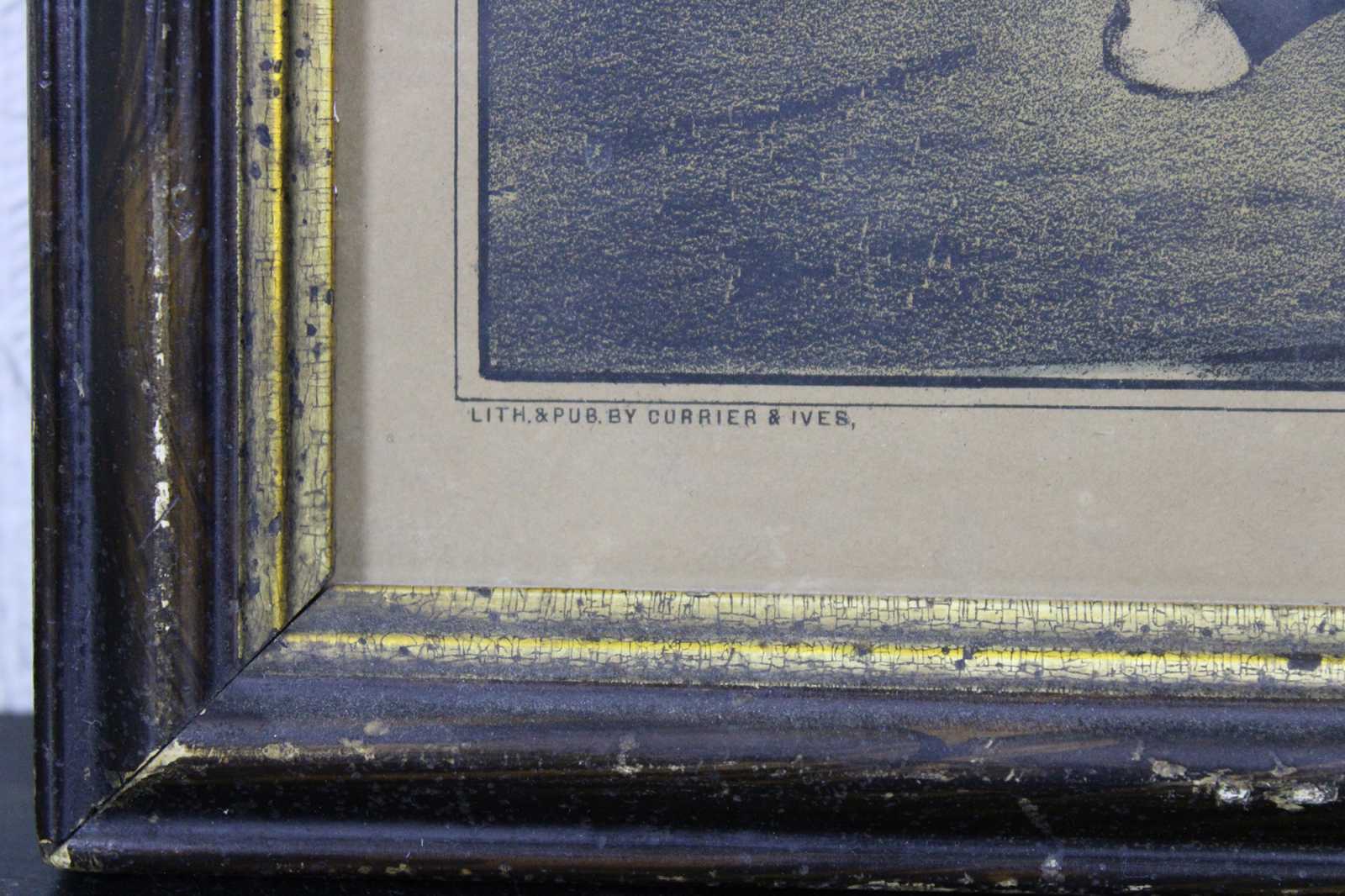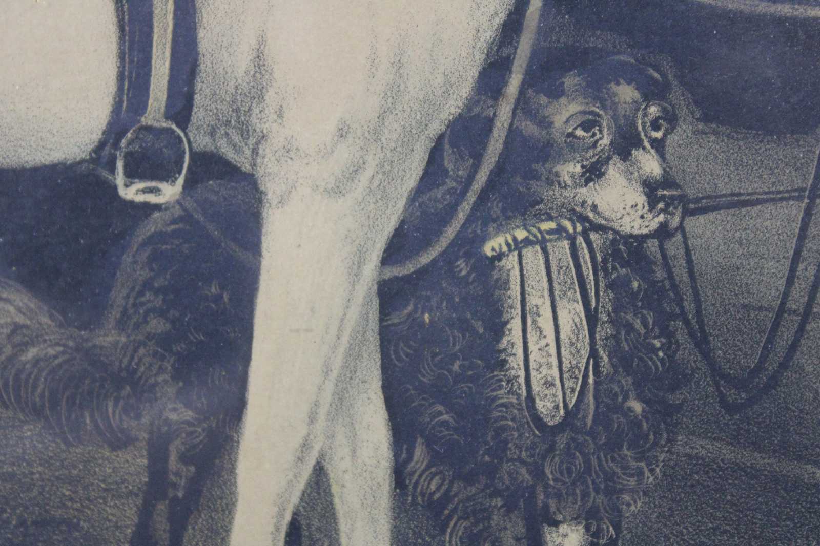 Antique lithograph print by Currier and Ives titled “The Favorite Horse” showing a white horse saddled in a stall with a border collie holding a riding crop in its mouth.