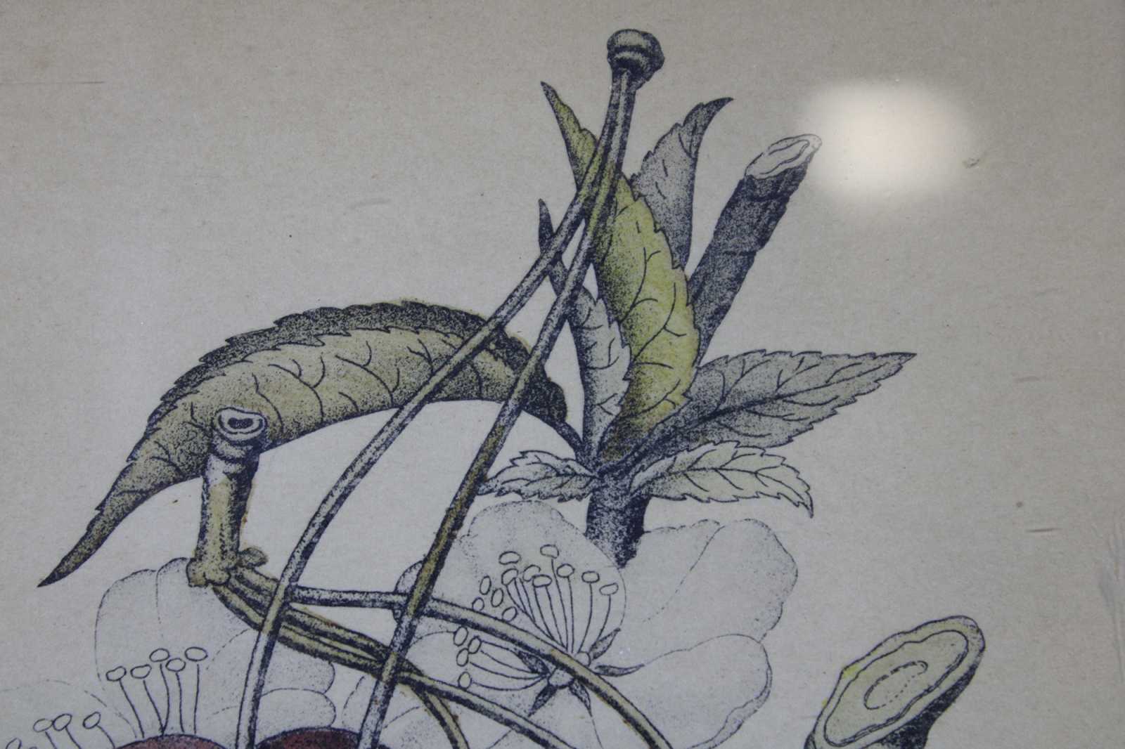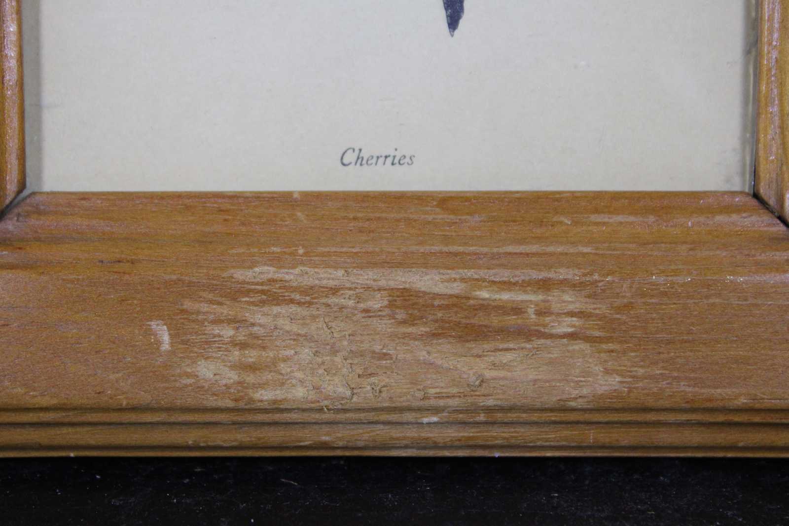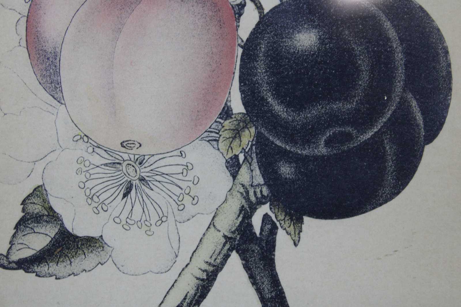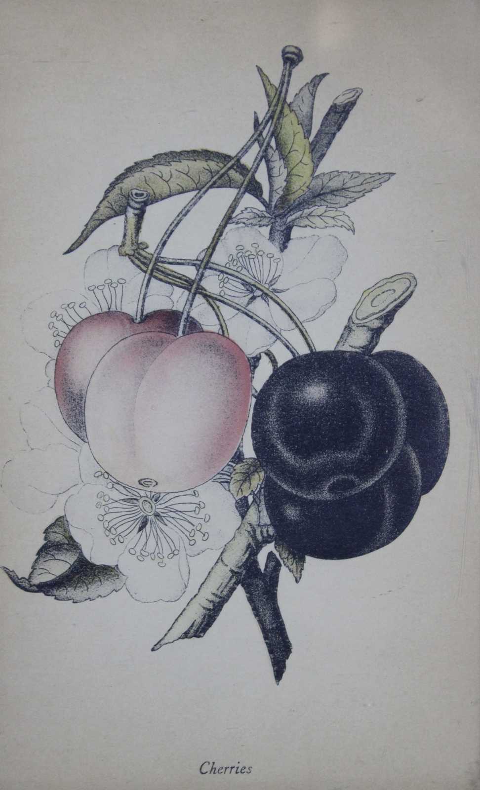 Antique botanical lithograph print of a branch of cherries.