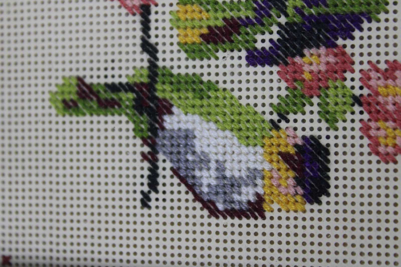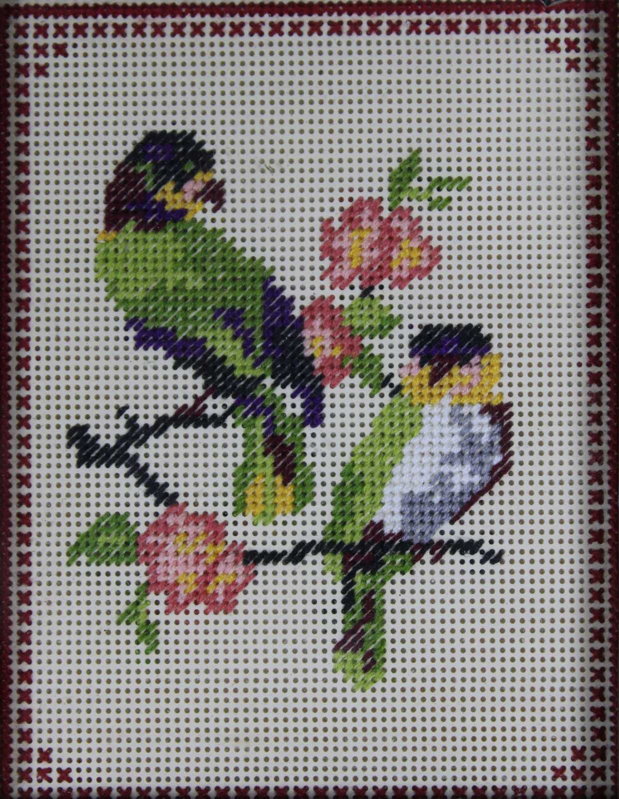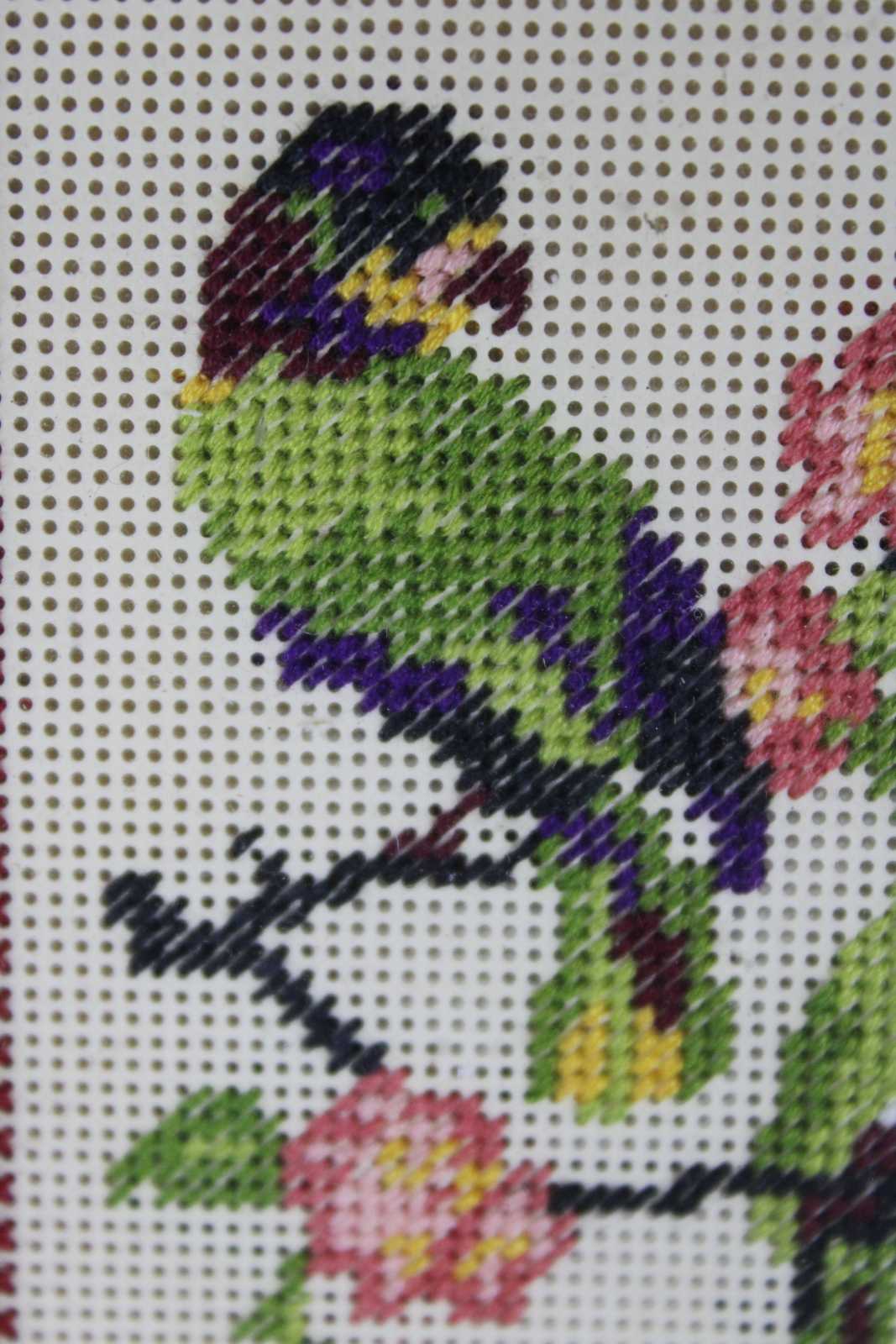 Antique cross stitched tableau of two parrots on a flowering branch.