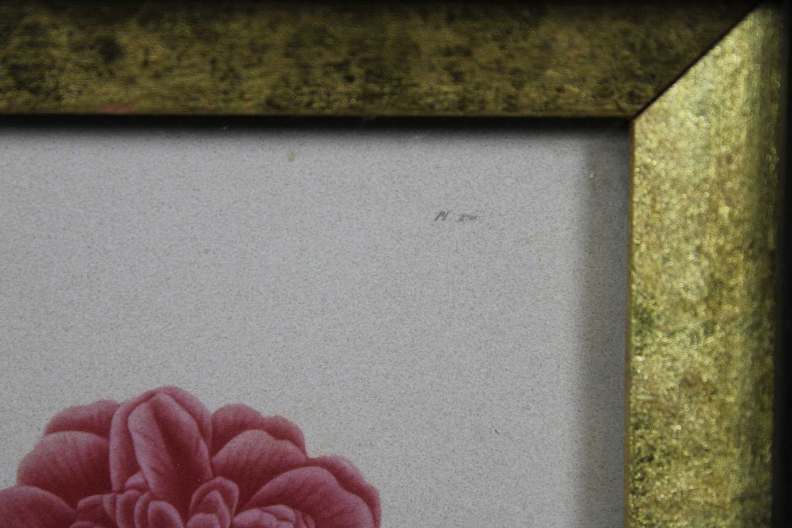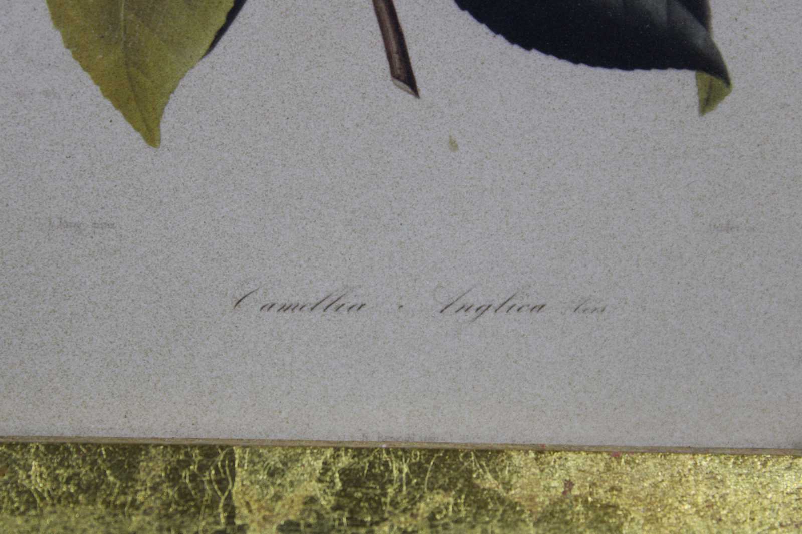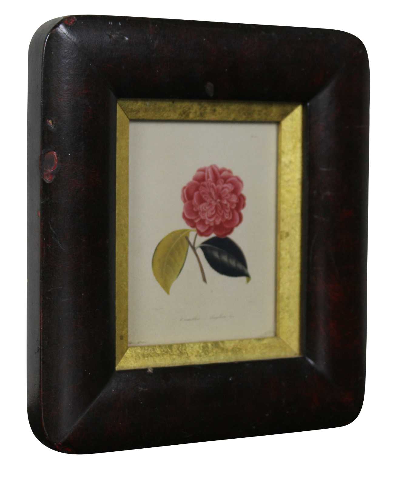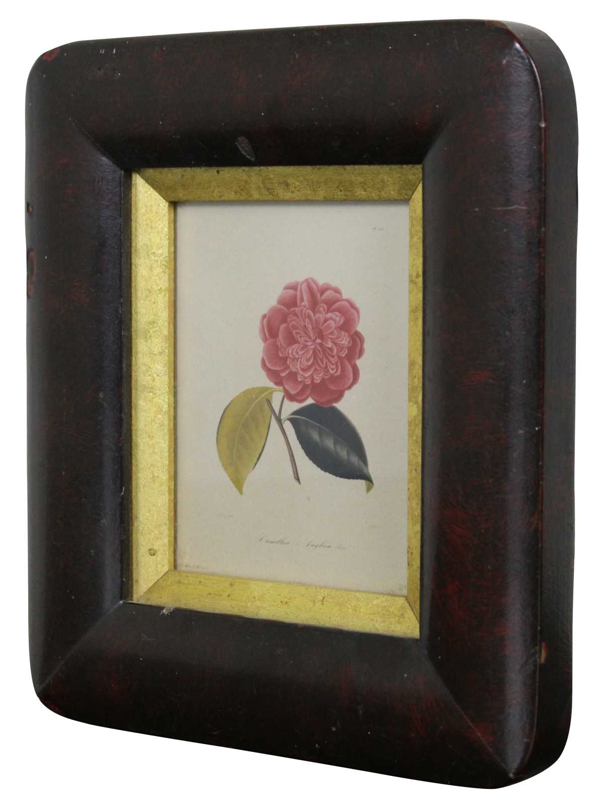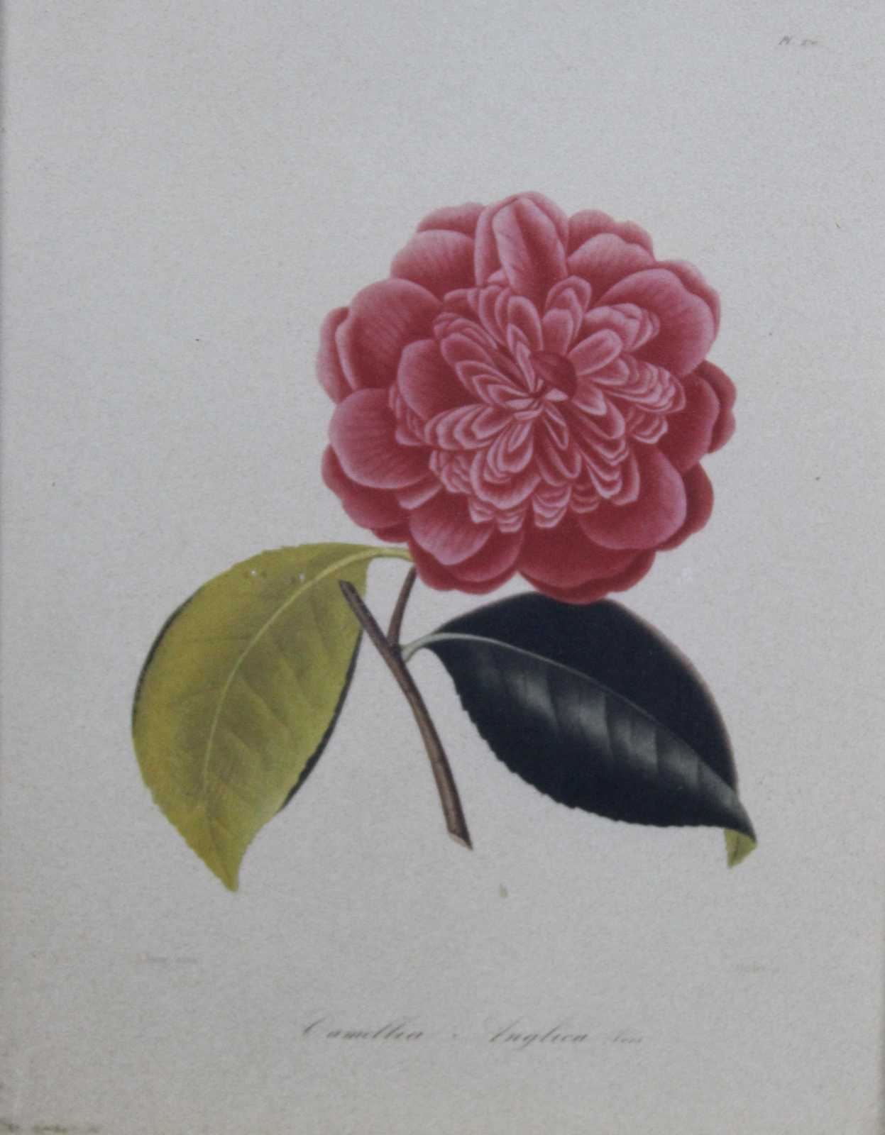 Antique small scale botanical engraving of a pink Camellia Anglica by J.J. Jung. “Camellia Anglica (Vers.)” From N. Remond’s Iconographie Du Genre Camellia ou collection des Camellias les plus beaux et les plus rares peints d’après nature dans les serres de Mr. l’Abbé Berlese par J.J. Jung. Paris, 1839-43. Stipple and line engraving by Oudet.” “Produced from 1839—1843 by Lorenzo Berlèse (1784—1863), the greatest 19th-century scholar on the subject of camellias, Iconographie du Genre Camellia comprises 300 partly hand-colored plates. Engraved by Dumenil, Gabriel and Oudet and printed in Paris by N. Rémond, the subtlety and coloring of these plates is comparable in many ways to Redouté’s Les Roses. Beautiful in groupings of four, six, or eight images, the camellias vary in color from ruby red to pink, white, and variegated.