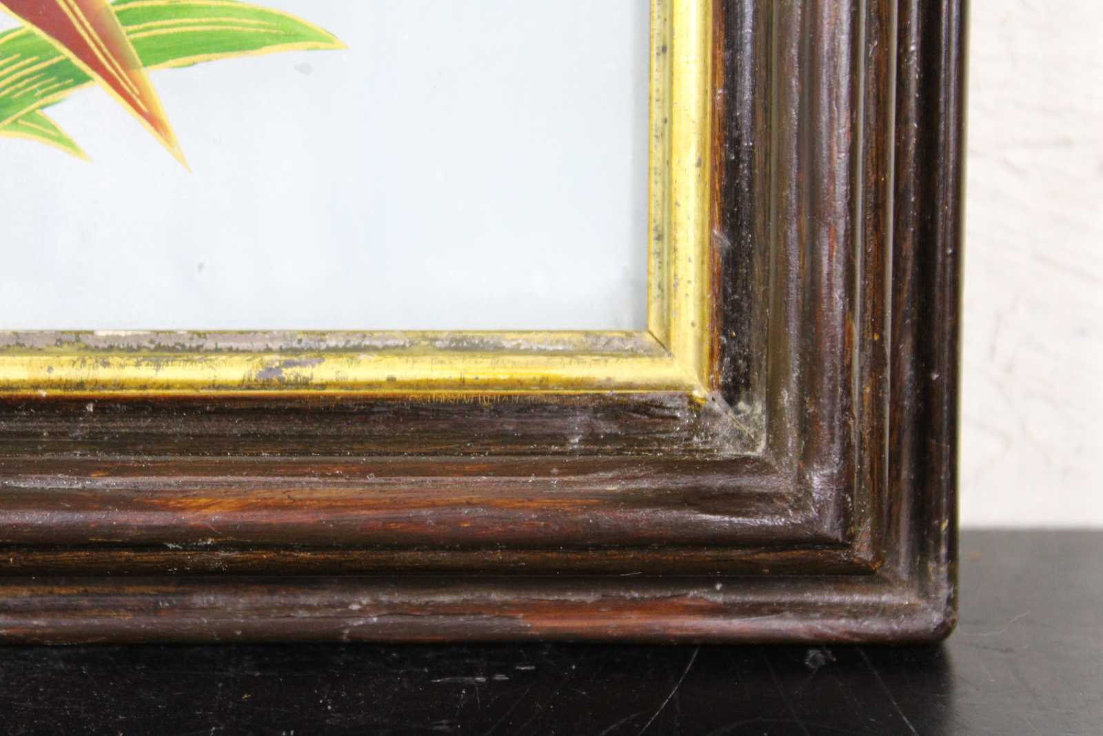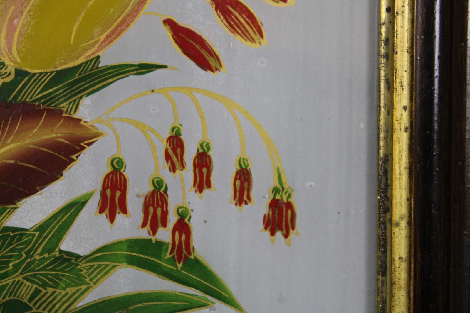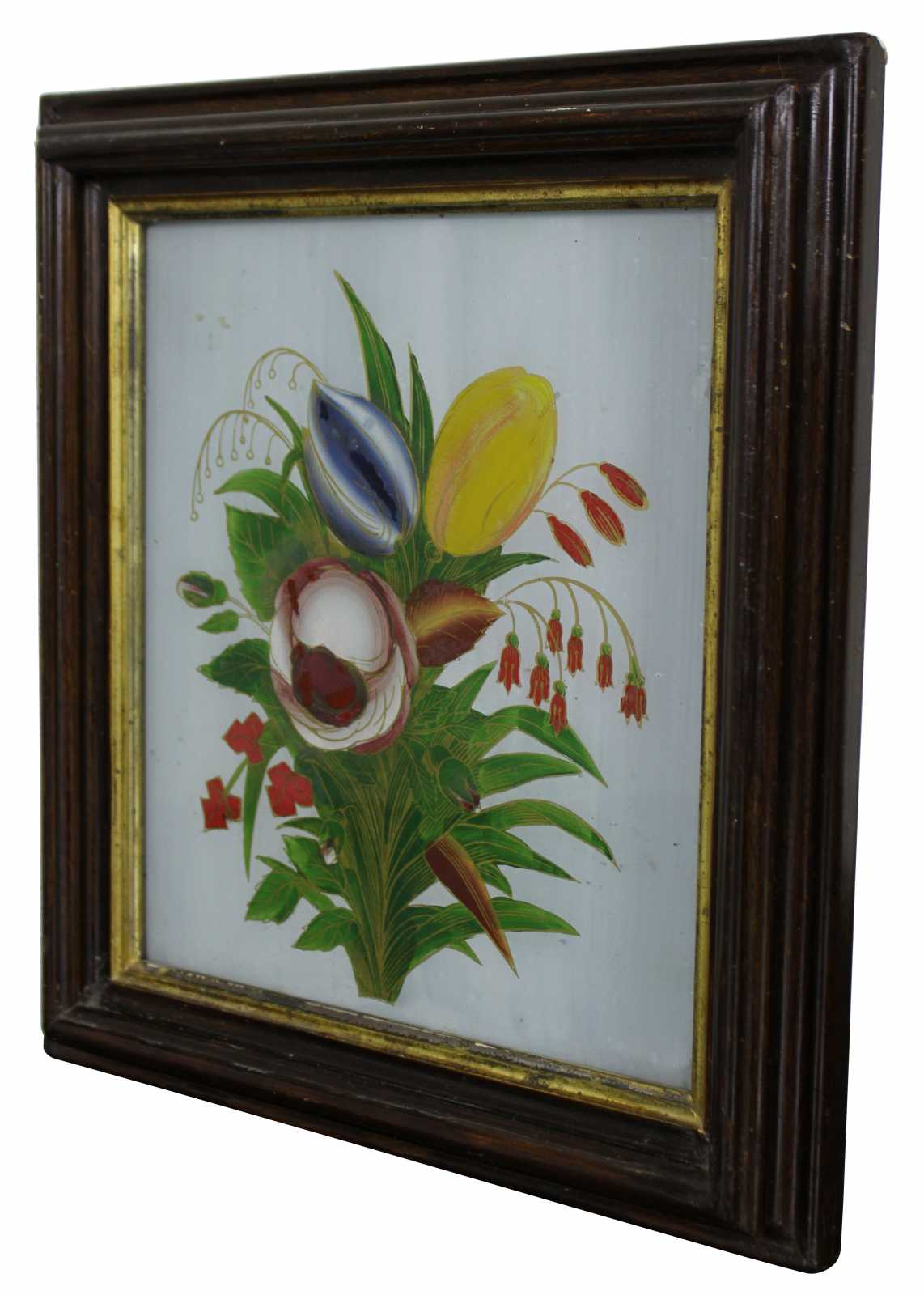 Antique floral botanical still life oil painting, reverse painted on glass, featuring a brightly colored flower arrangement with gold gilded accents.