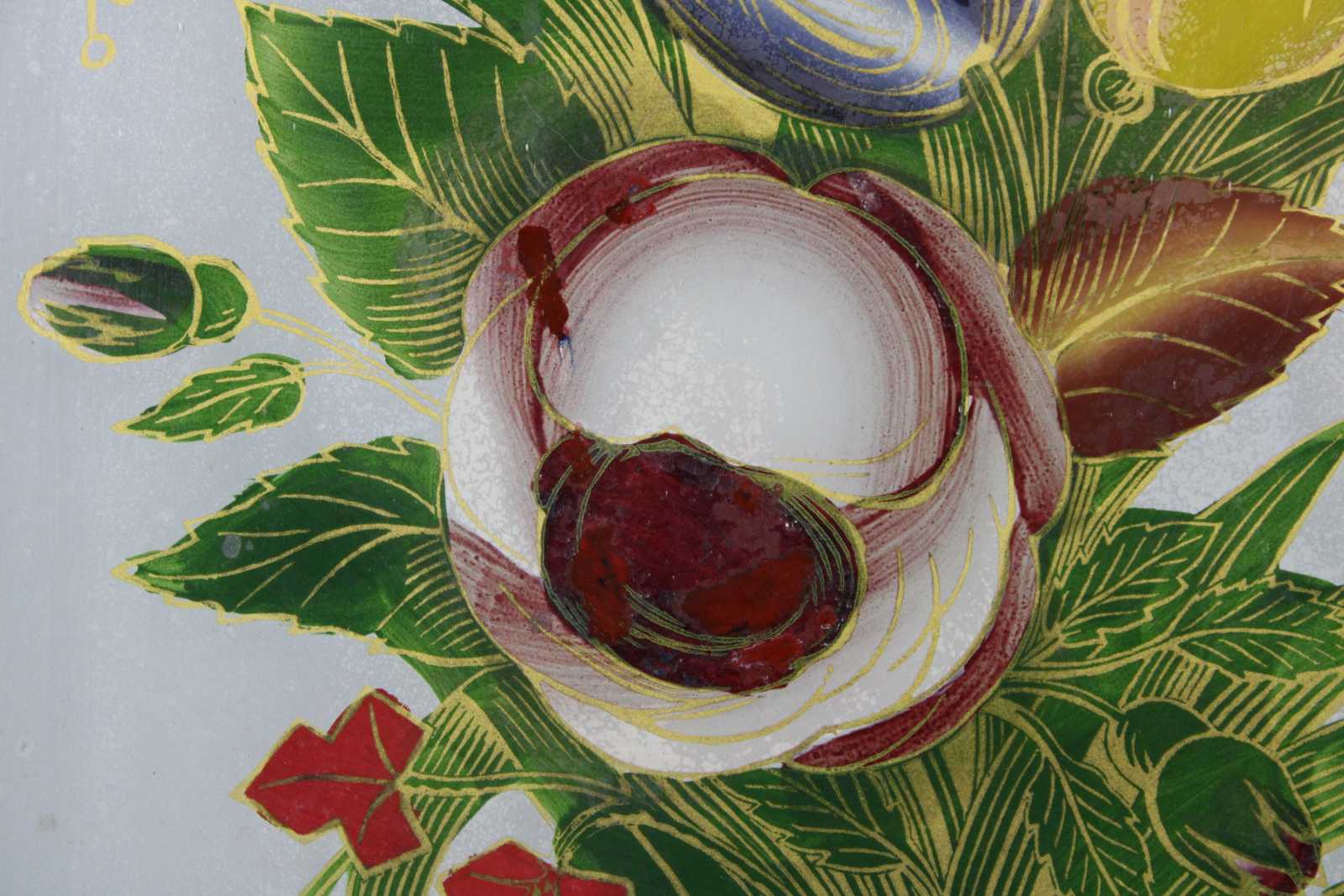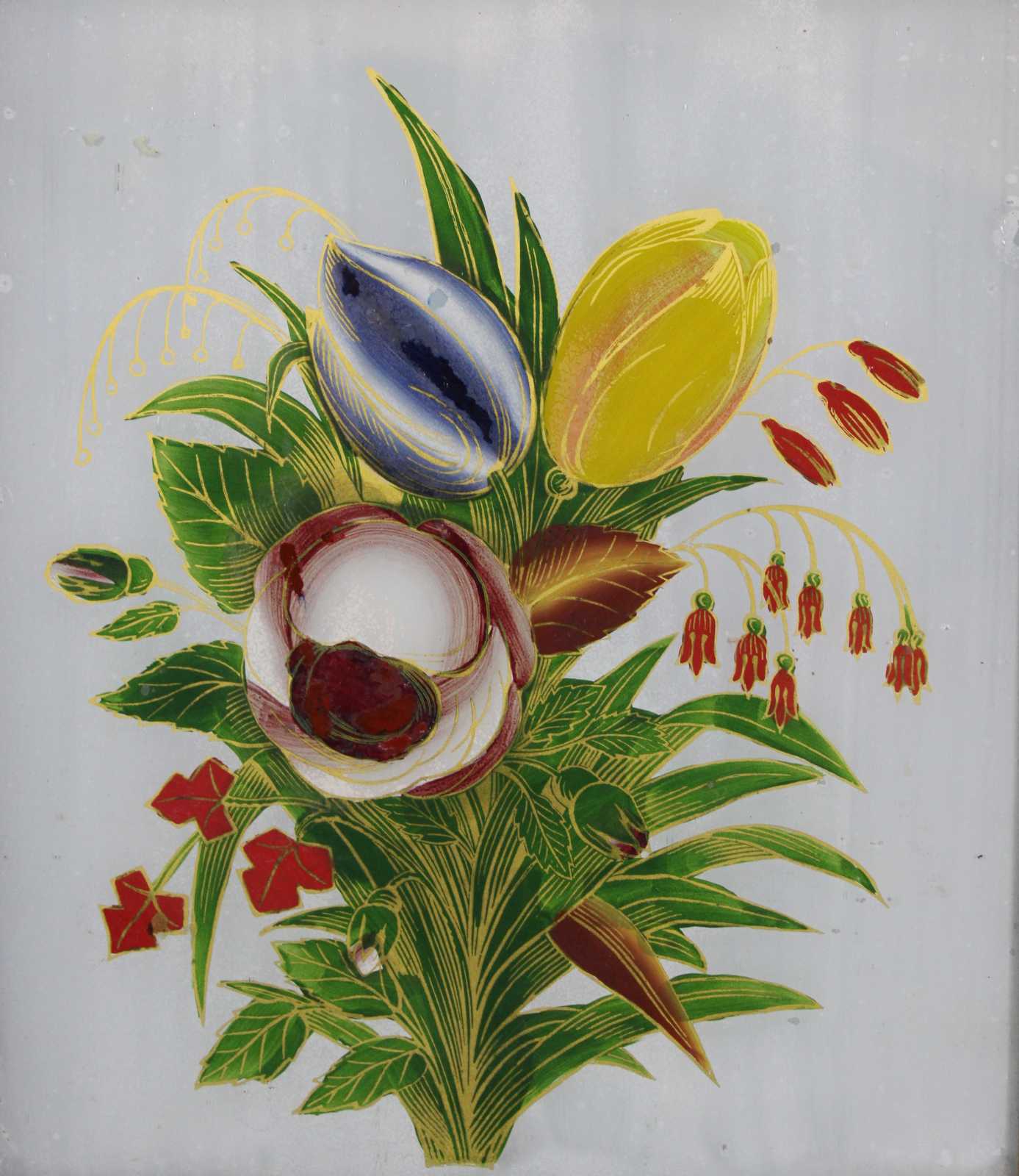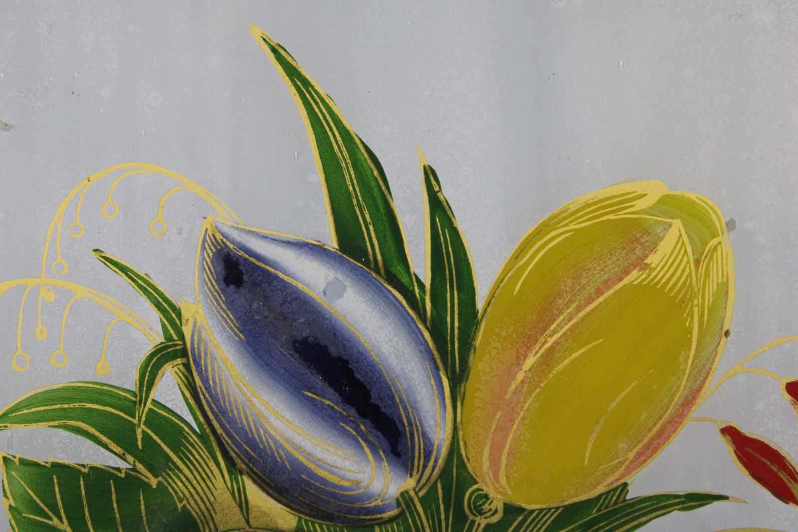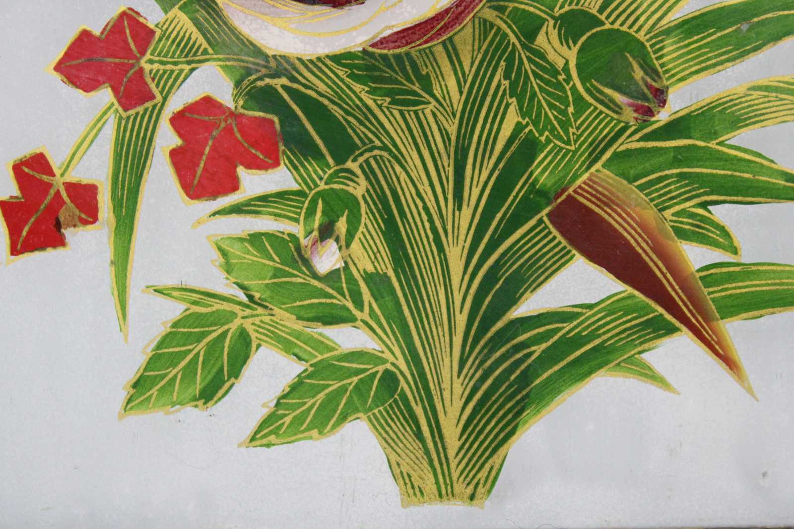Antique floral botanical still life oil painting, reverse painted on glass, featuring a brightly colored flower arrangement with gold gilded accents.