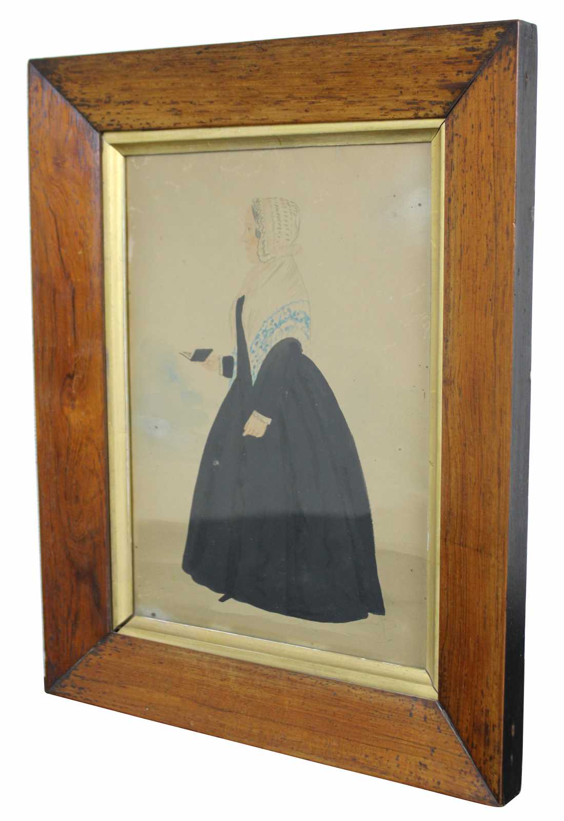 Antique primitive mid to early 19th century framed full length folk art silhouette portrait painting of a woman in black with an embroidered shawl and bonnet, holding / reading a book.