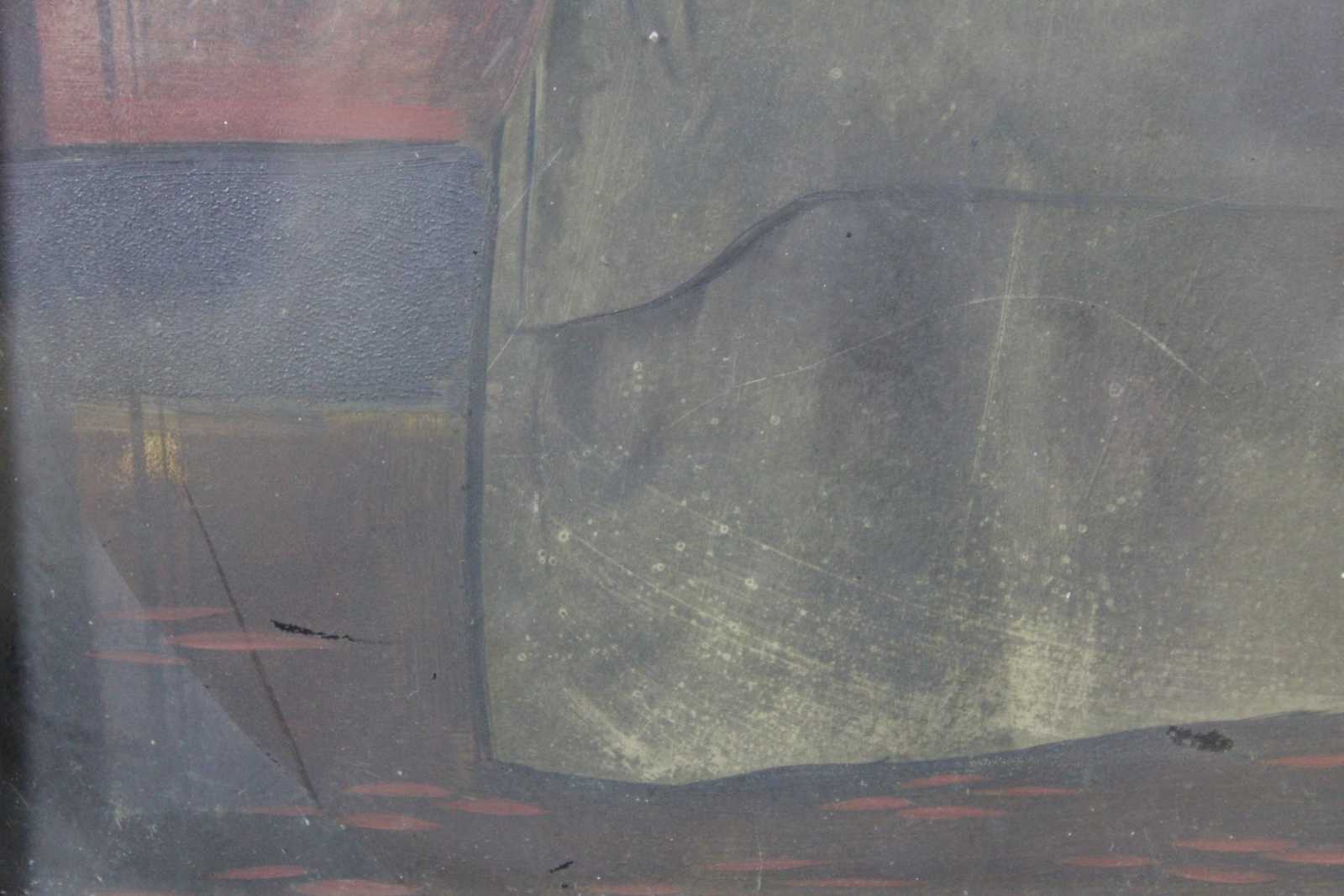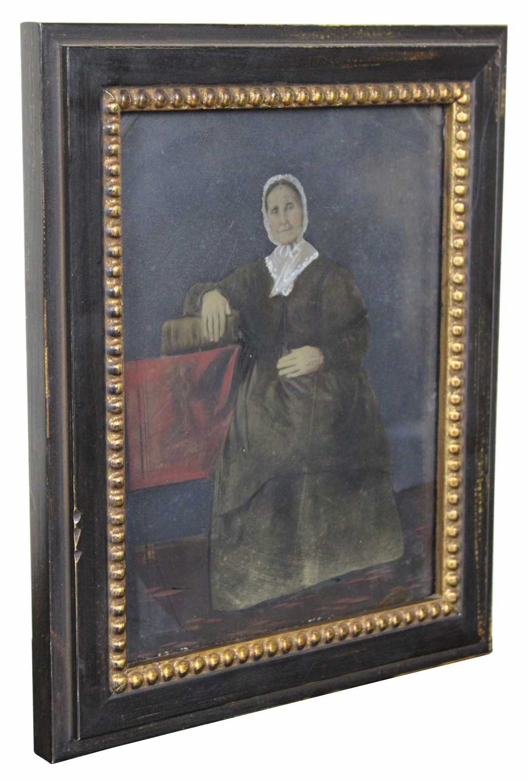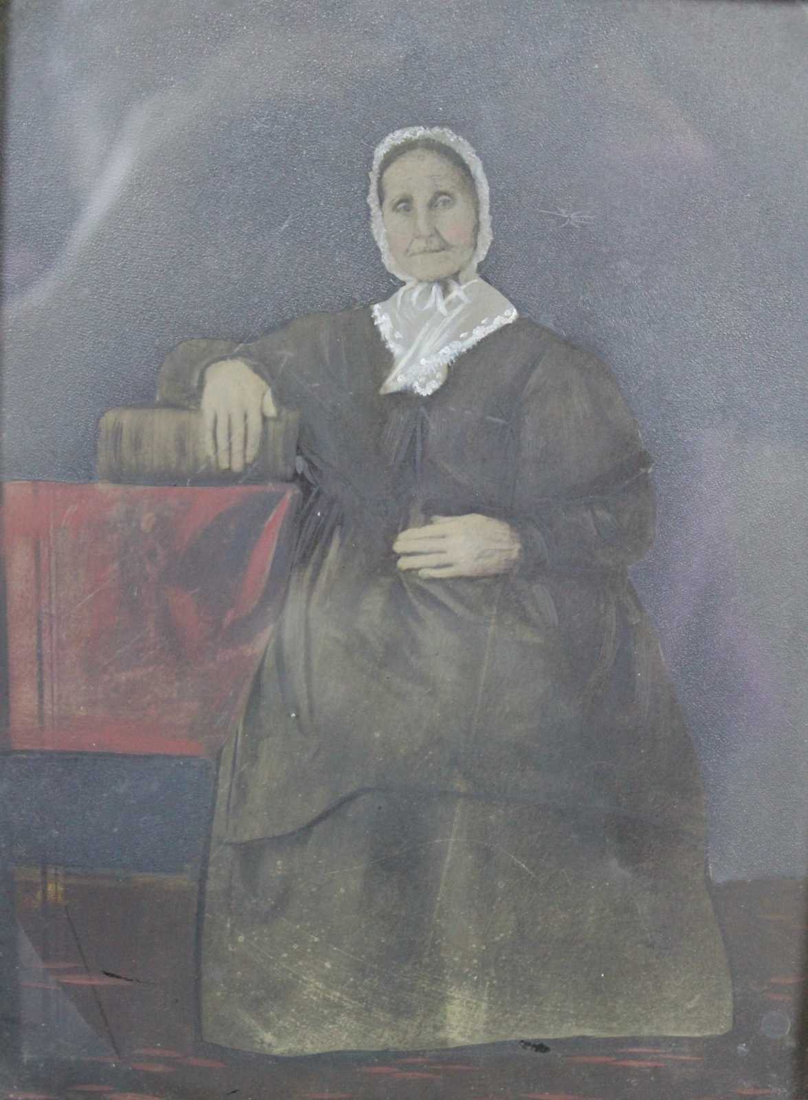 Fine antique oil painting on tin. A portrait painting of an elderly woman in black with a lace fichu bonnet seated at a table with her hand on a book.
