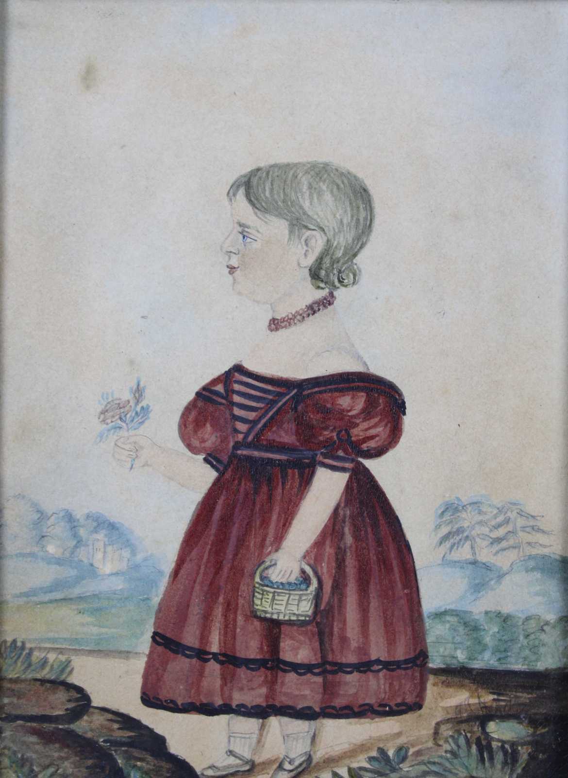 Antique miniature early 19th century watercolor portrait painting of a woman or girl in a red dress holding a basket of flowers.