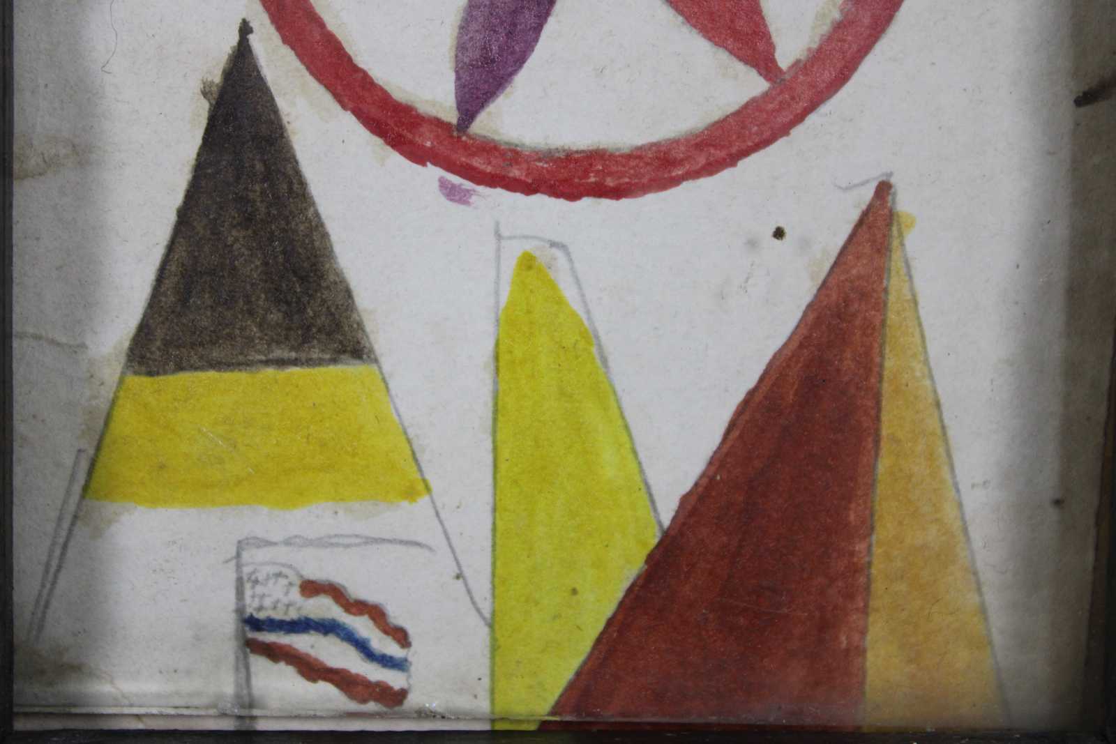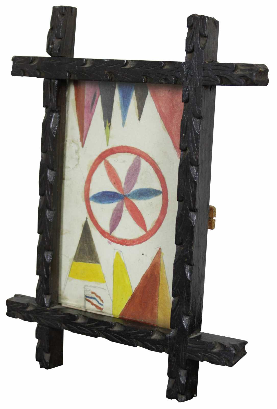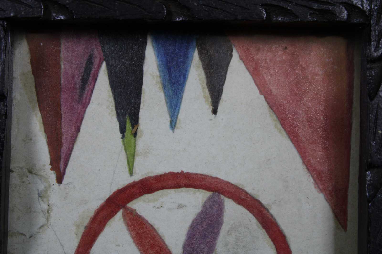 Vintage abstract geometric folk art watercolor painting featuring a pinwheel, American flag and a bunch of triangles, in a rustic carved frame.