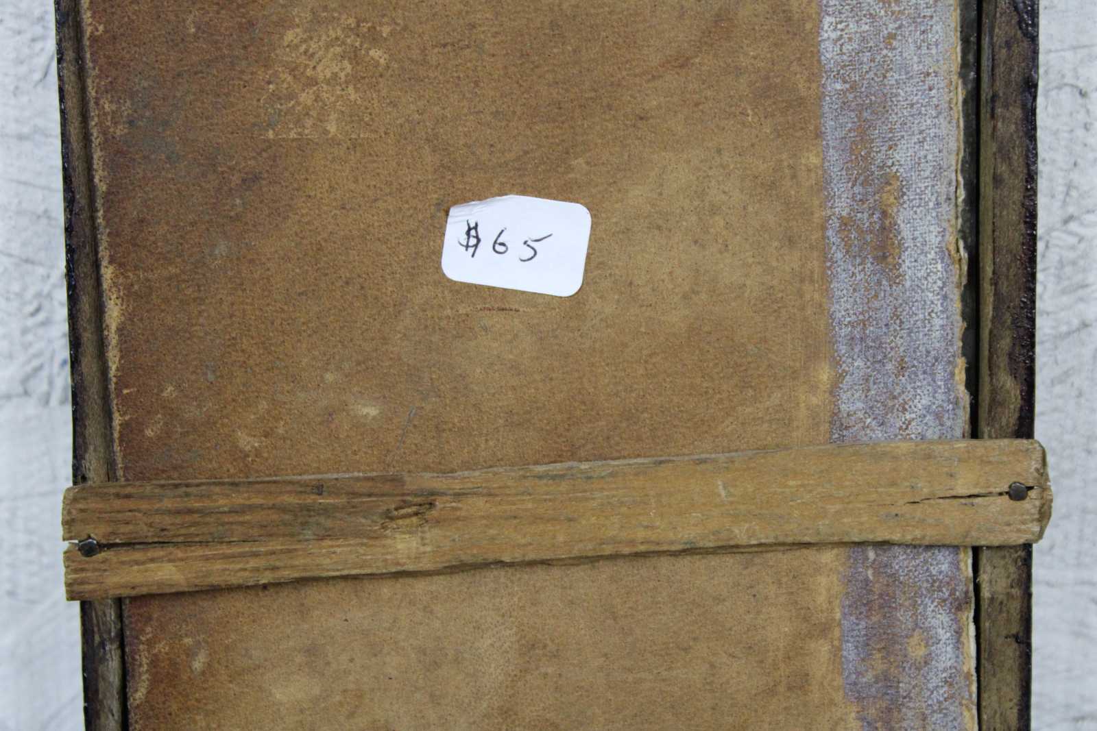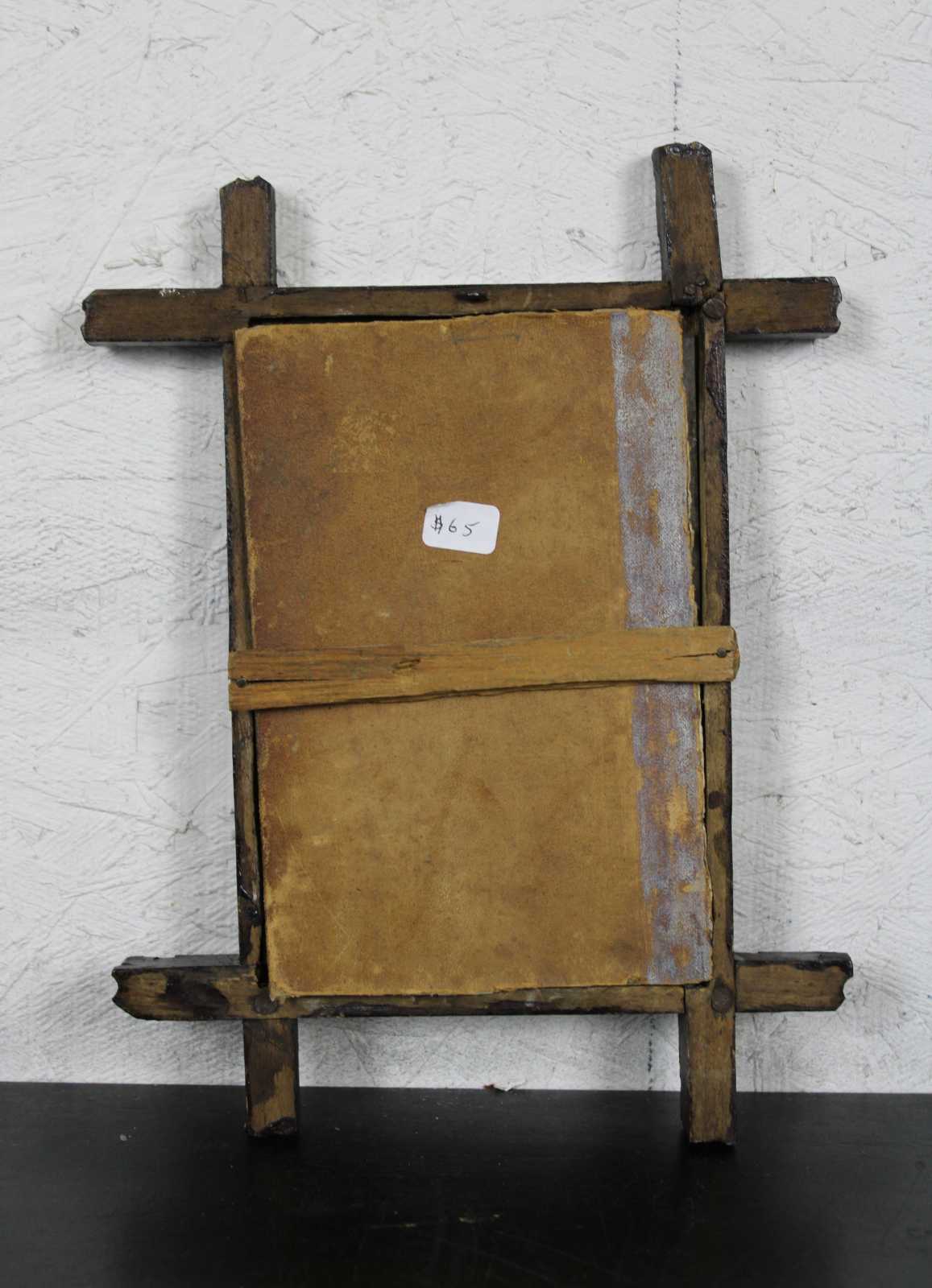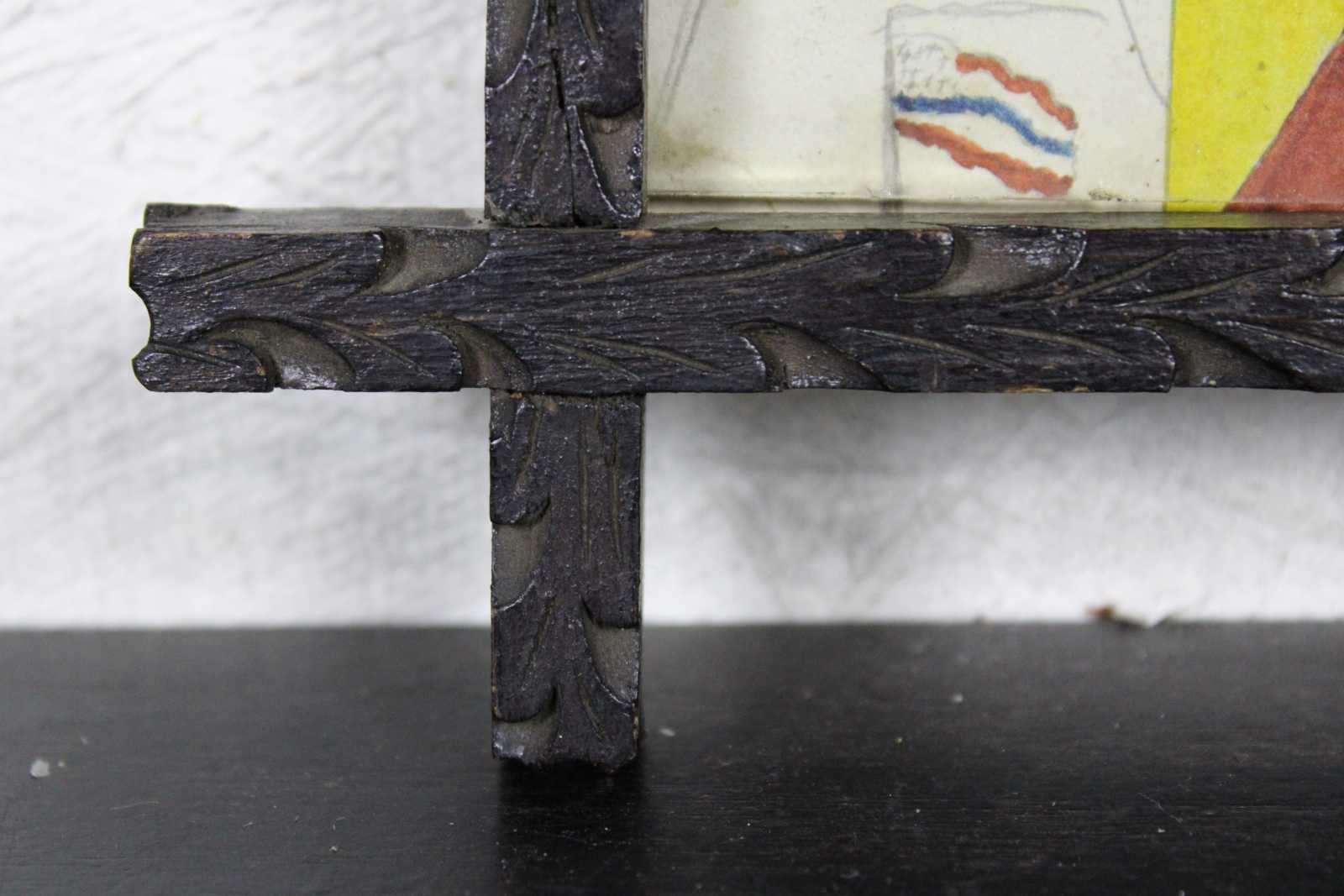 Vintage abstract geometric folk art watercolor painting featuring a pinwheel, American flag and a bunch of triangles, in a rustic carved frame.