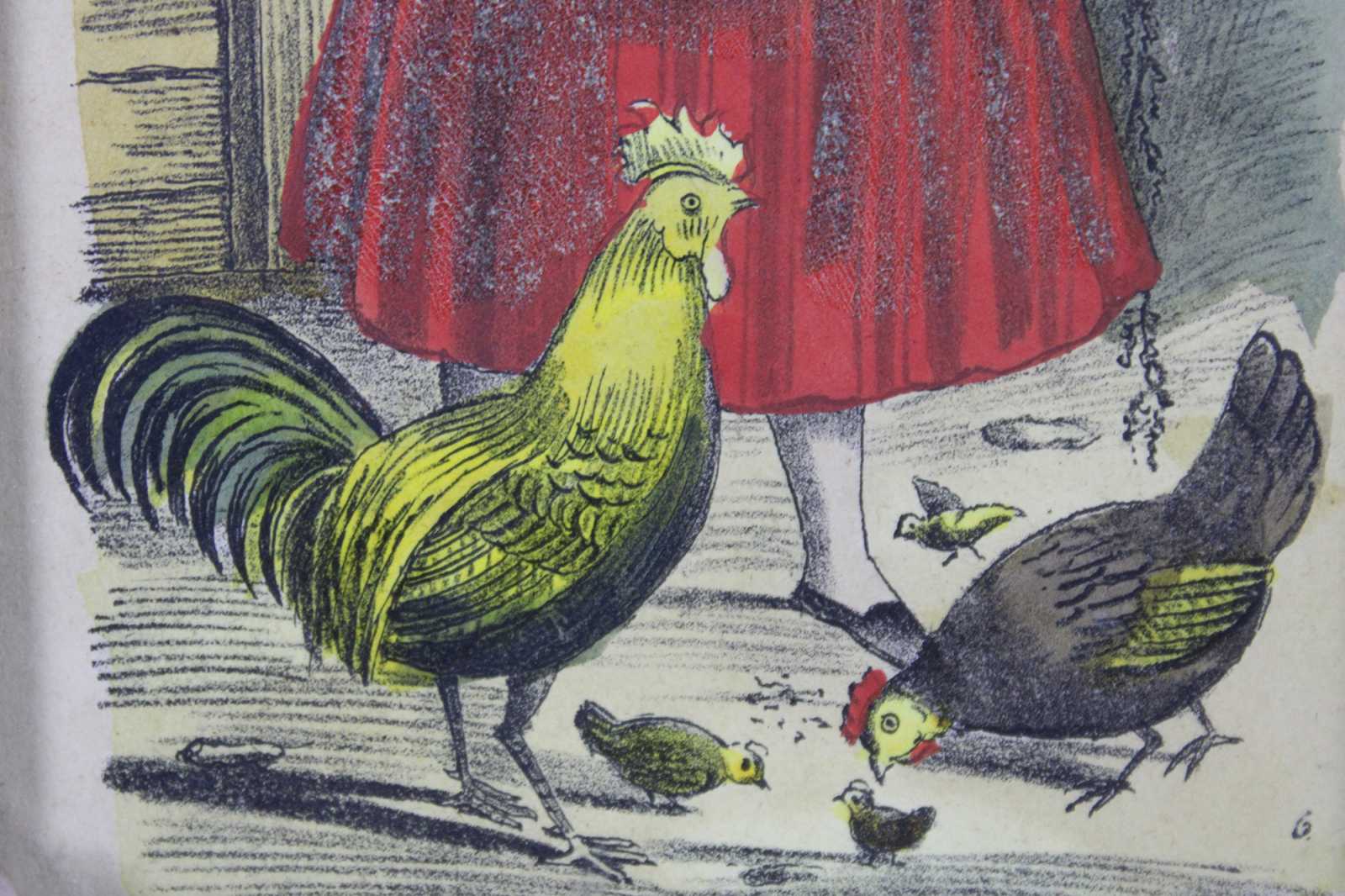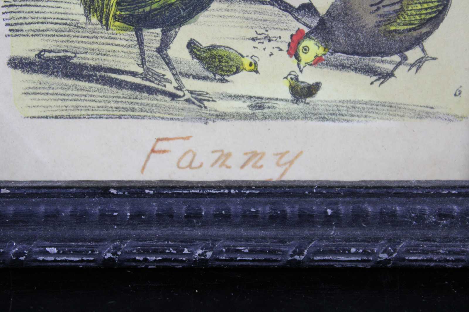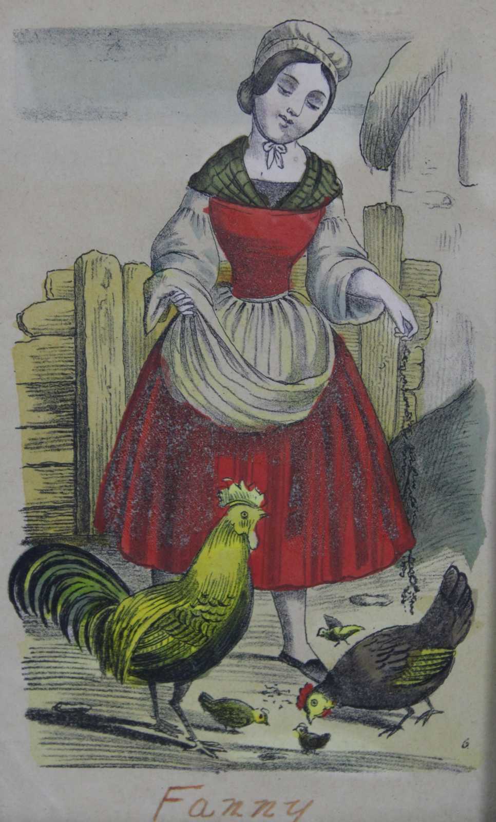 Antique hand colored print titled Fanny, showing a country woman in red and green feeding chickens.
