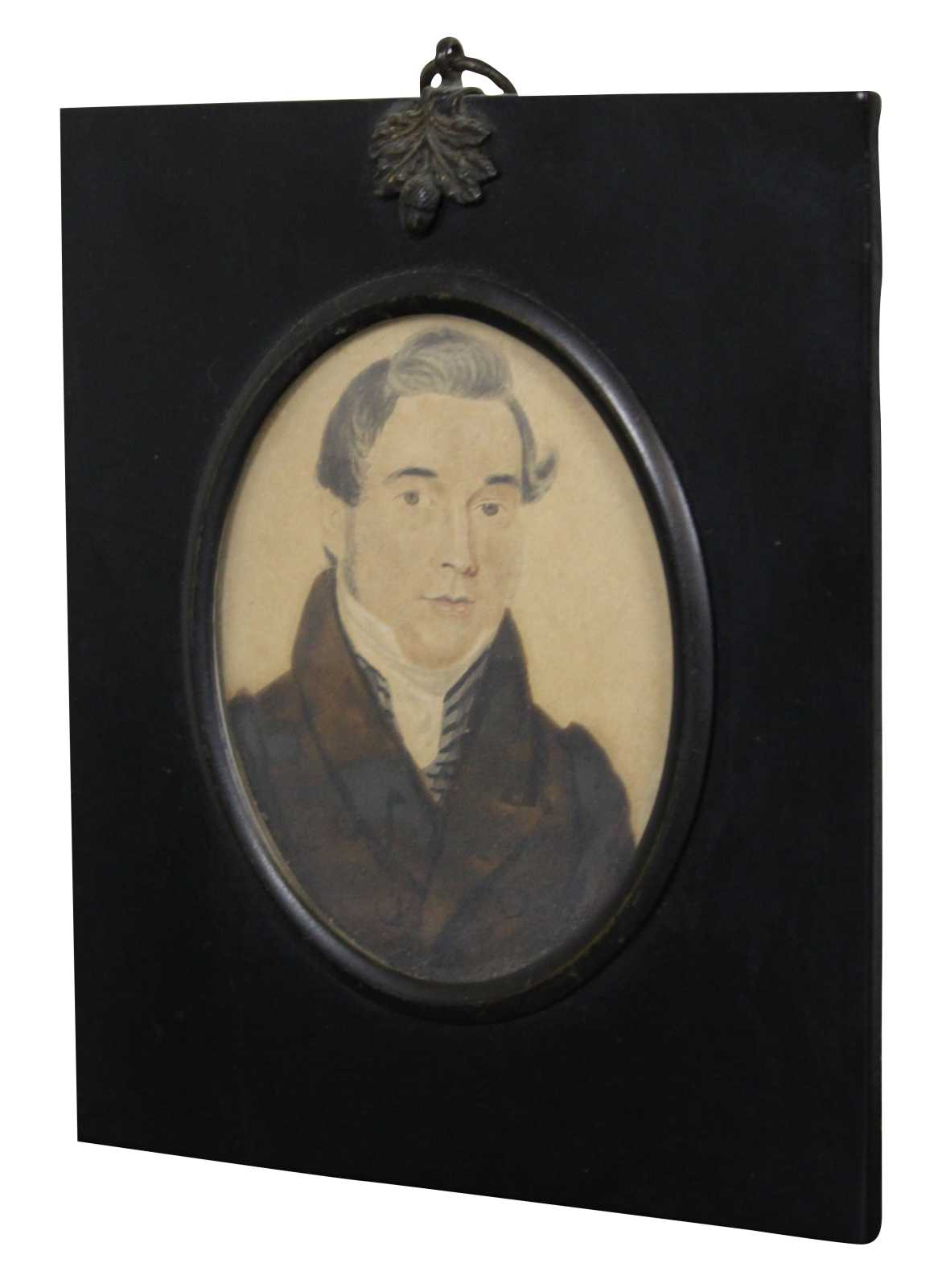 Fine antique American Victorian miniature oval watercolor portrait painting of a young man / gentleman in formal attire, framed.