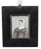 Antique miniature portrait painting showing a woman in a modest black dress and white lace bonnet, a Mrs. S. Wamacote of Newport, painted by J.W. Thomas, 1827.