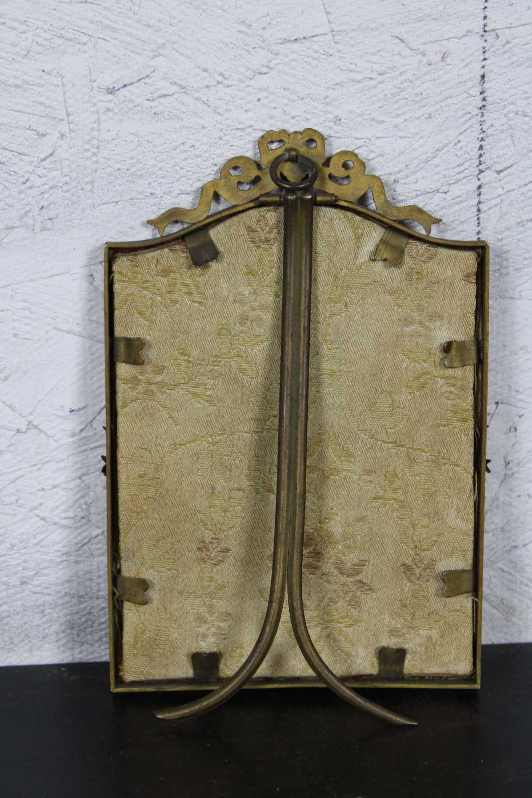Antique miniature portrait painting of Queen Henrietta Maria by the French artist Aime Perret. Young Henrietta is painted in a blue dress with white lace collar and brown curls. Signed along right side. Set in a Louis XV brass frame and matted in silk brocade. Circa late 19th Century