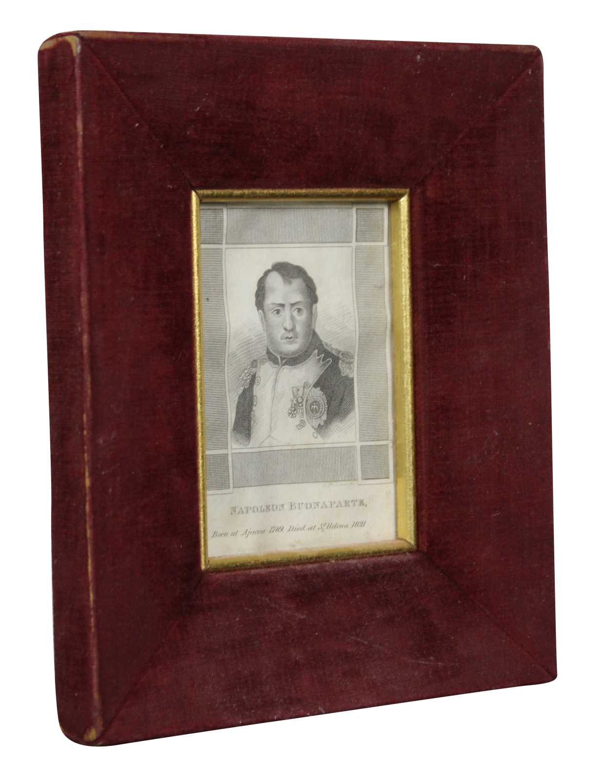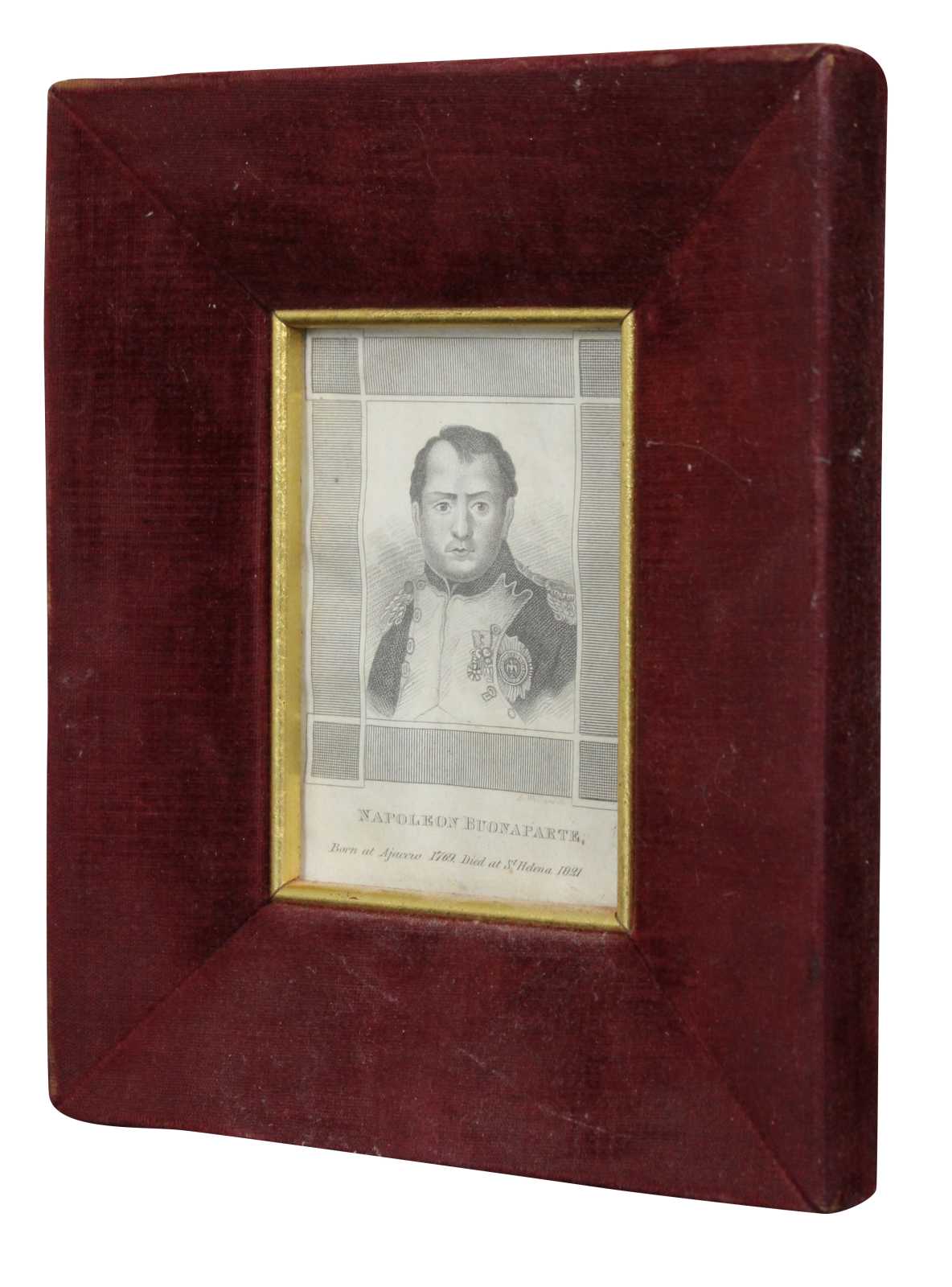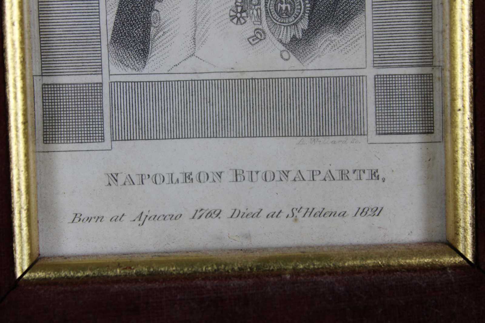 Antique 19th century miniature engraving and stipple etching on cream wove paper of Napoleon Buonaparte (1769-1821) by Asaph Willard (American, 1786–1880) displayed in a red velvet frame. Napoleon Bonaparte French military and political leader who rose to prominence during the French Revolution and its associated wars.