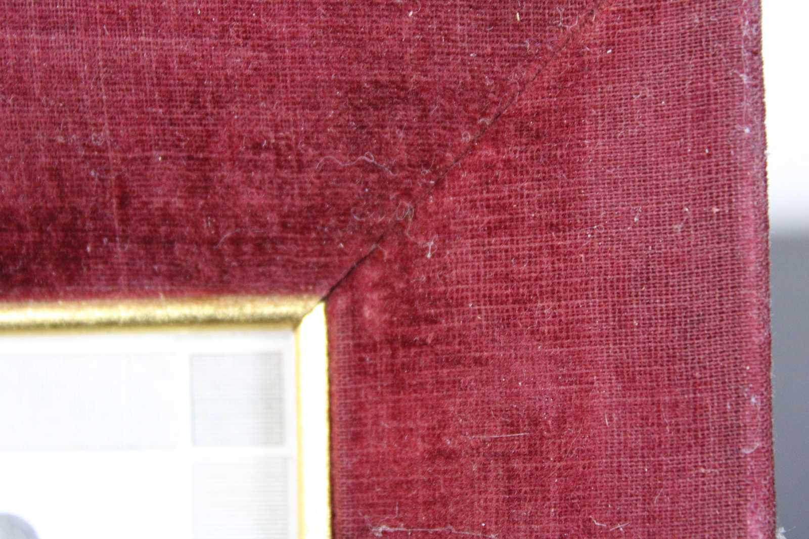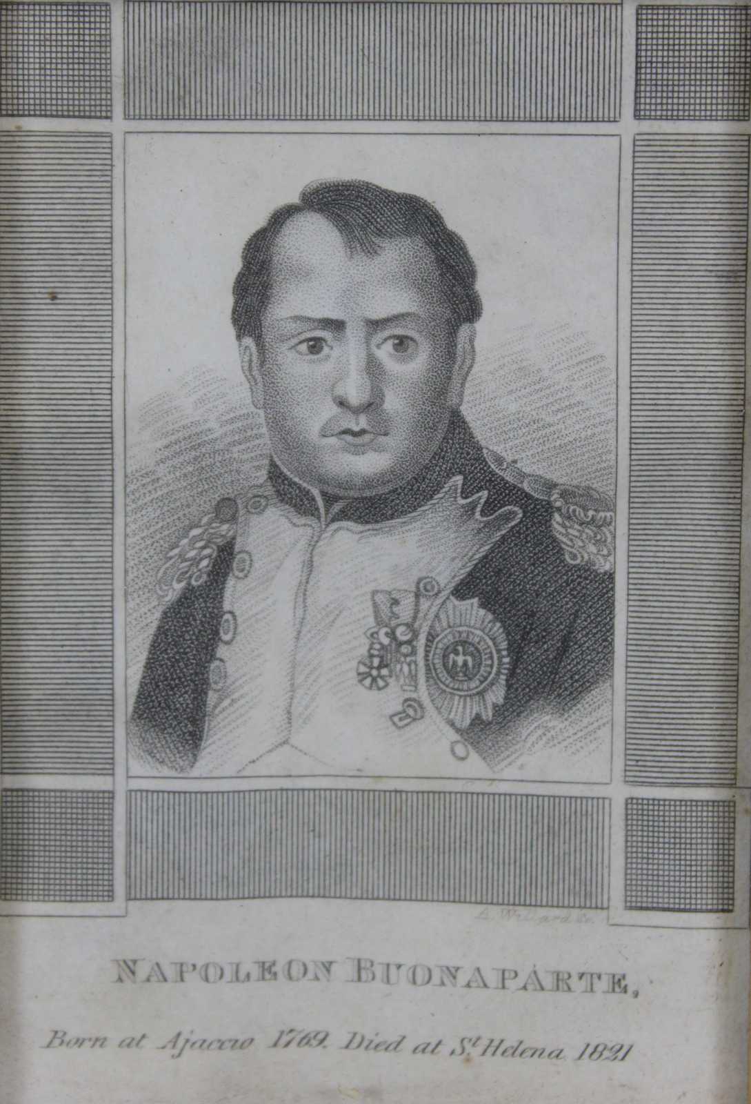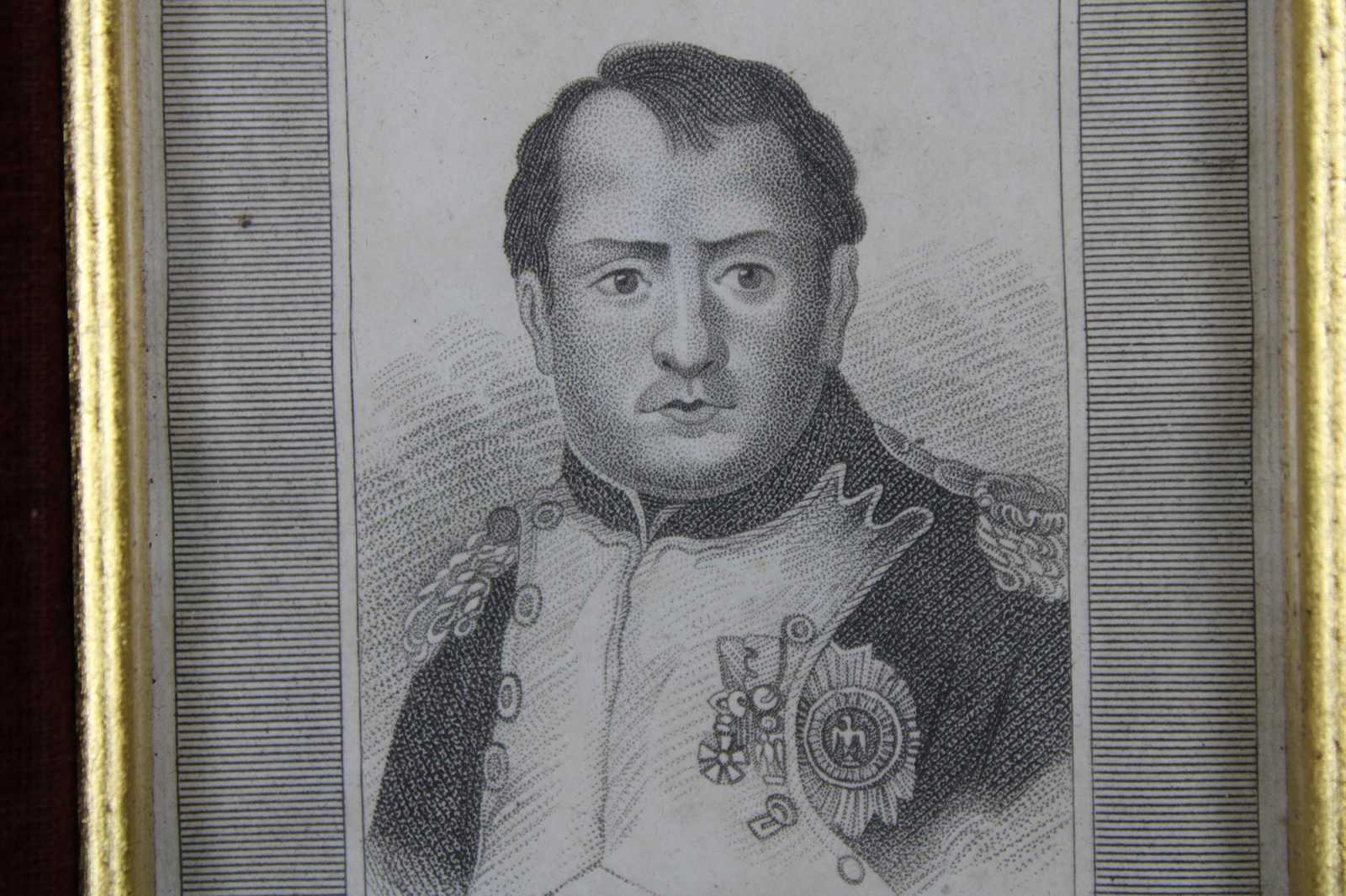 Antique 19th century miniature engraving and stipple etching on cream wove paper of Napoleon Buonaparte (1769-1821) by Asaph Willard (American, 1786–1880) displayed in a red velvet frame. Napoleon Bonaparte French military and political leader who rose to prominence during the French Revolution and its associated wars.