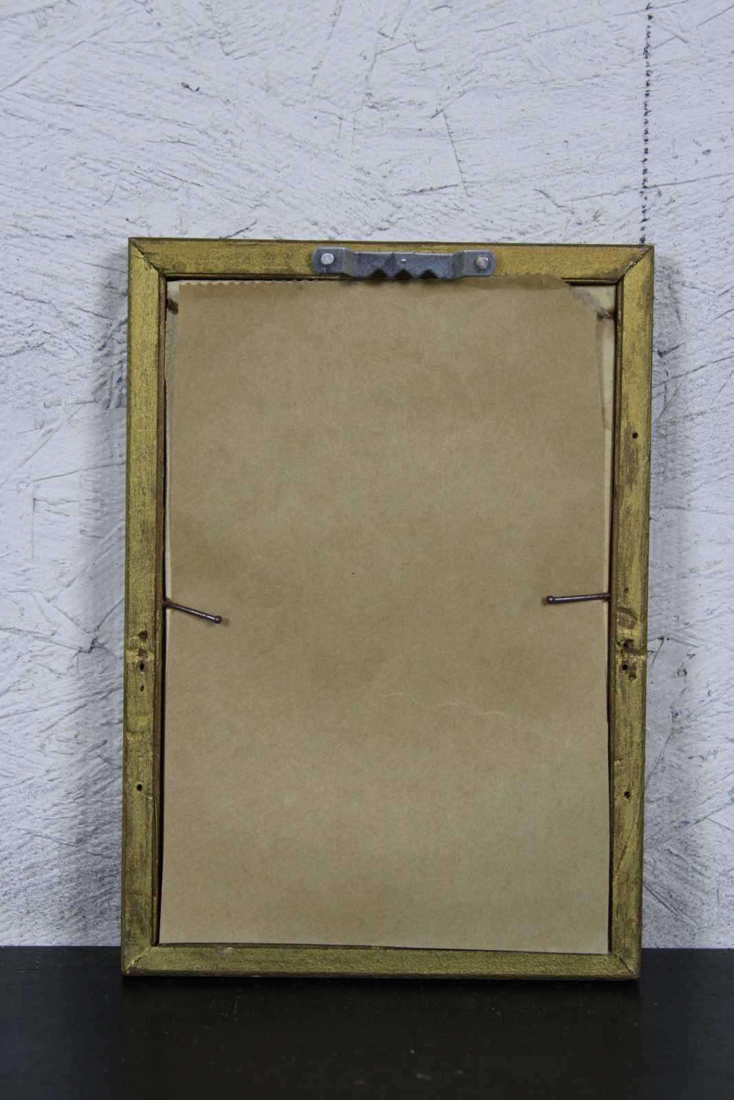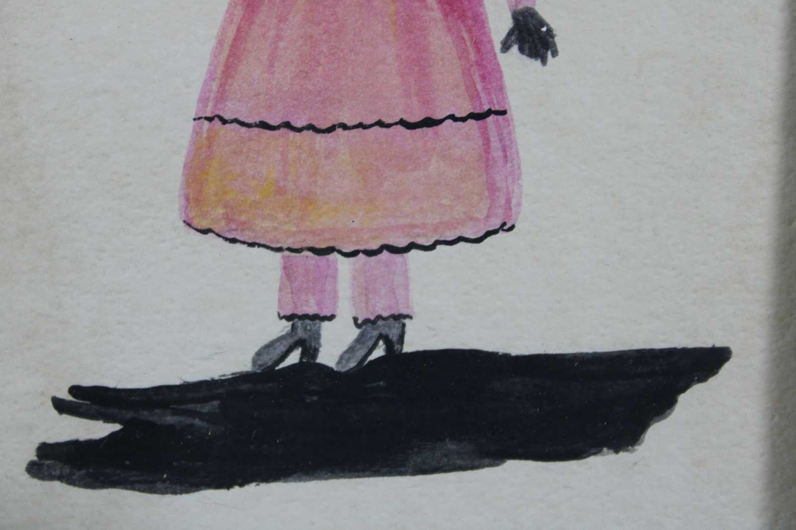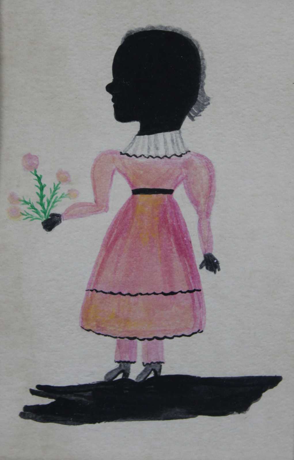 Vintage hand painted, Victorian-style folk art miniature, full body silhouette of a little girl / young woman in heals and pink dress holding a bouquet of flowers.