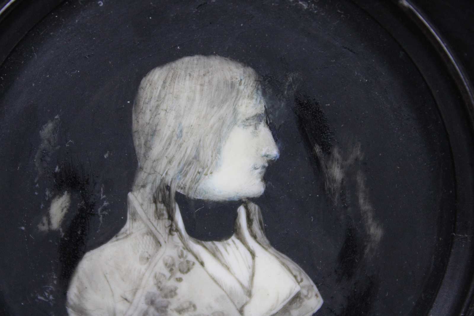 Early 19th century black and white miniature French silhouette style cameo portrait painting of a man / gentleman in an embroidered floral jacket; signed on lower right.