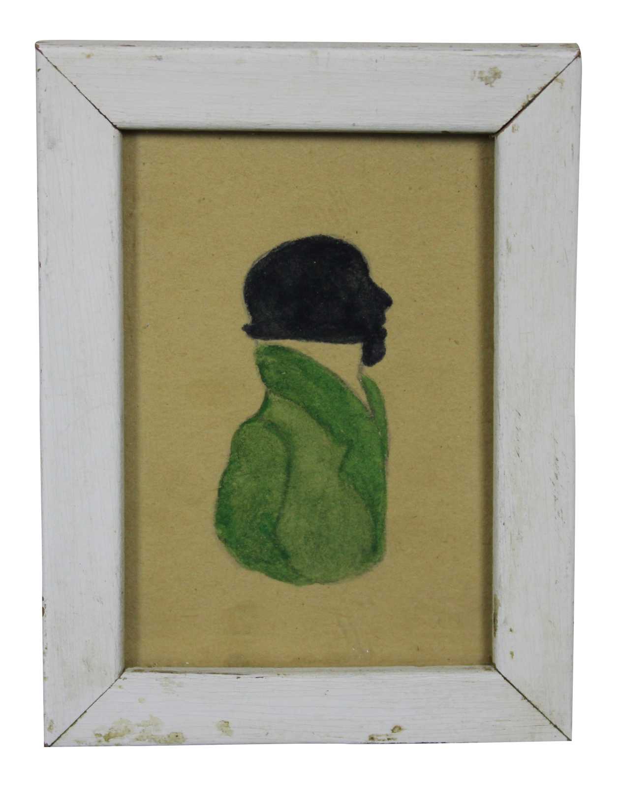 Antique Americana folk art hand painted pair of silhouettes showing a woman in a pink dress with puff sleeves, and a man in a green frock coat.
