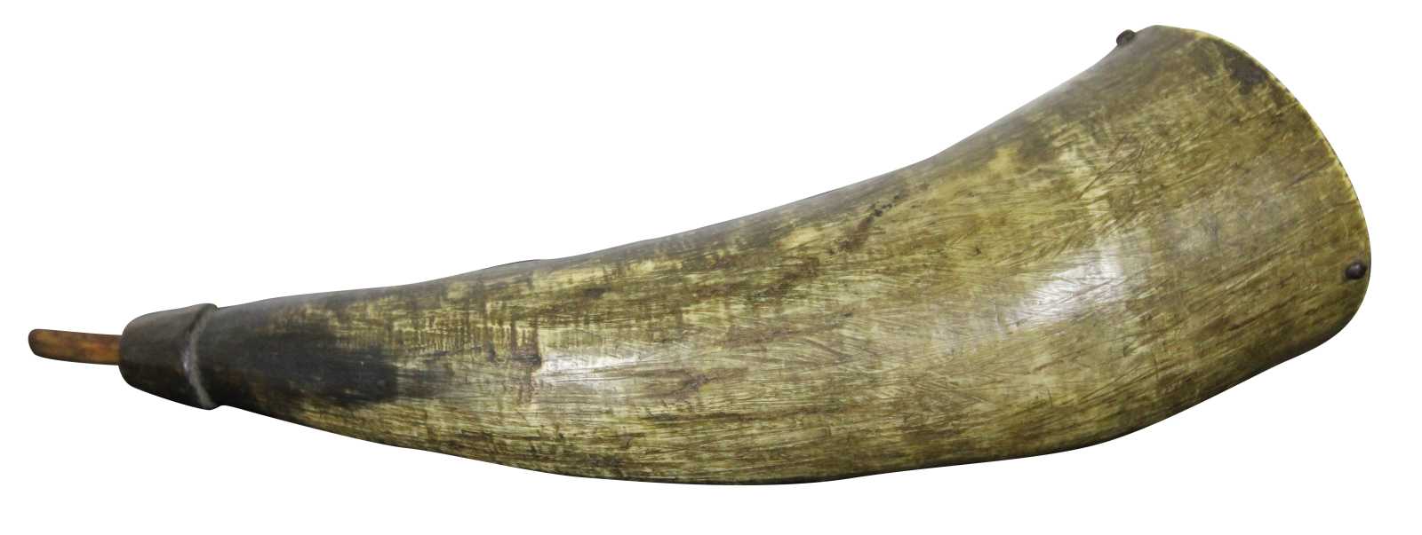 Antique Colonial era powder carved buffalo gun poweder horn with a brass pour spout and a wooden base and plug.