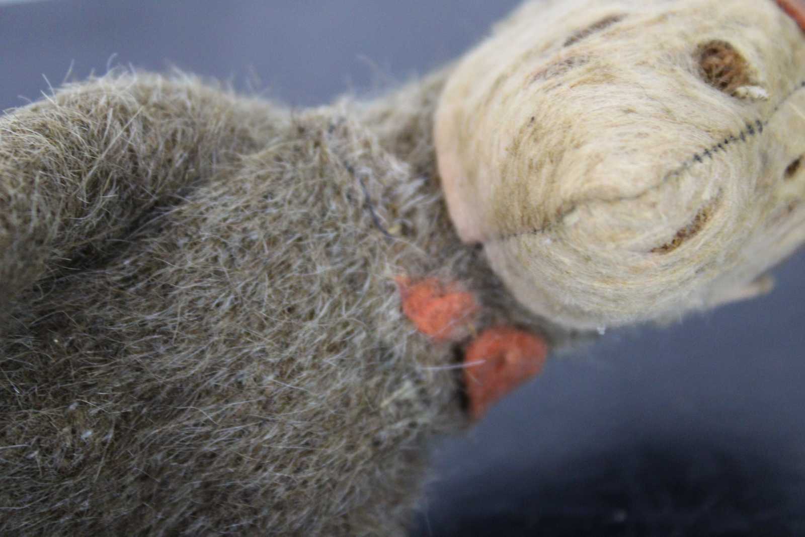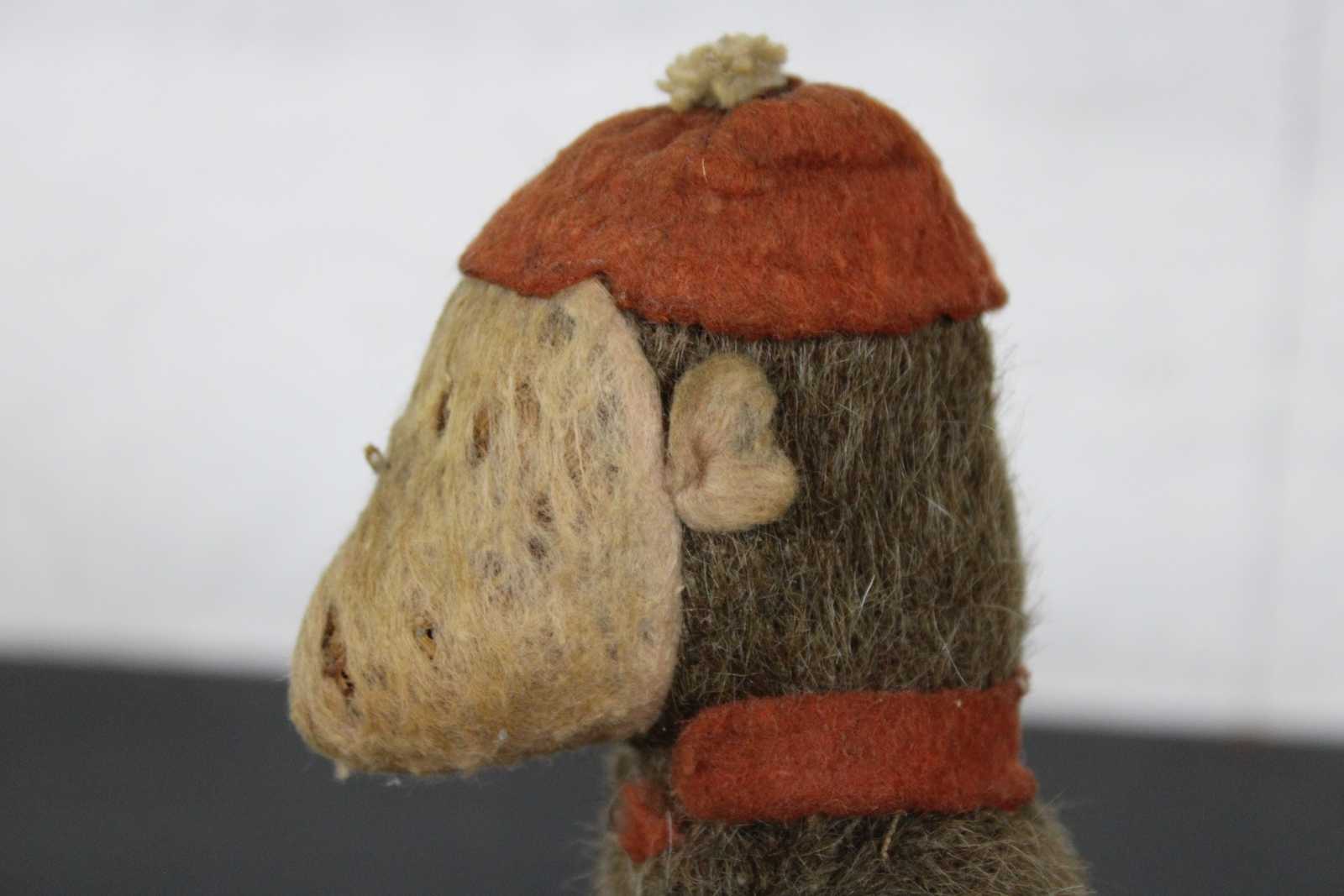 Antique early mohair stuffed monkey with tail, dressed in a red cap and scarf.