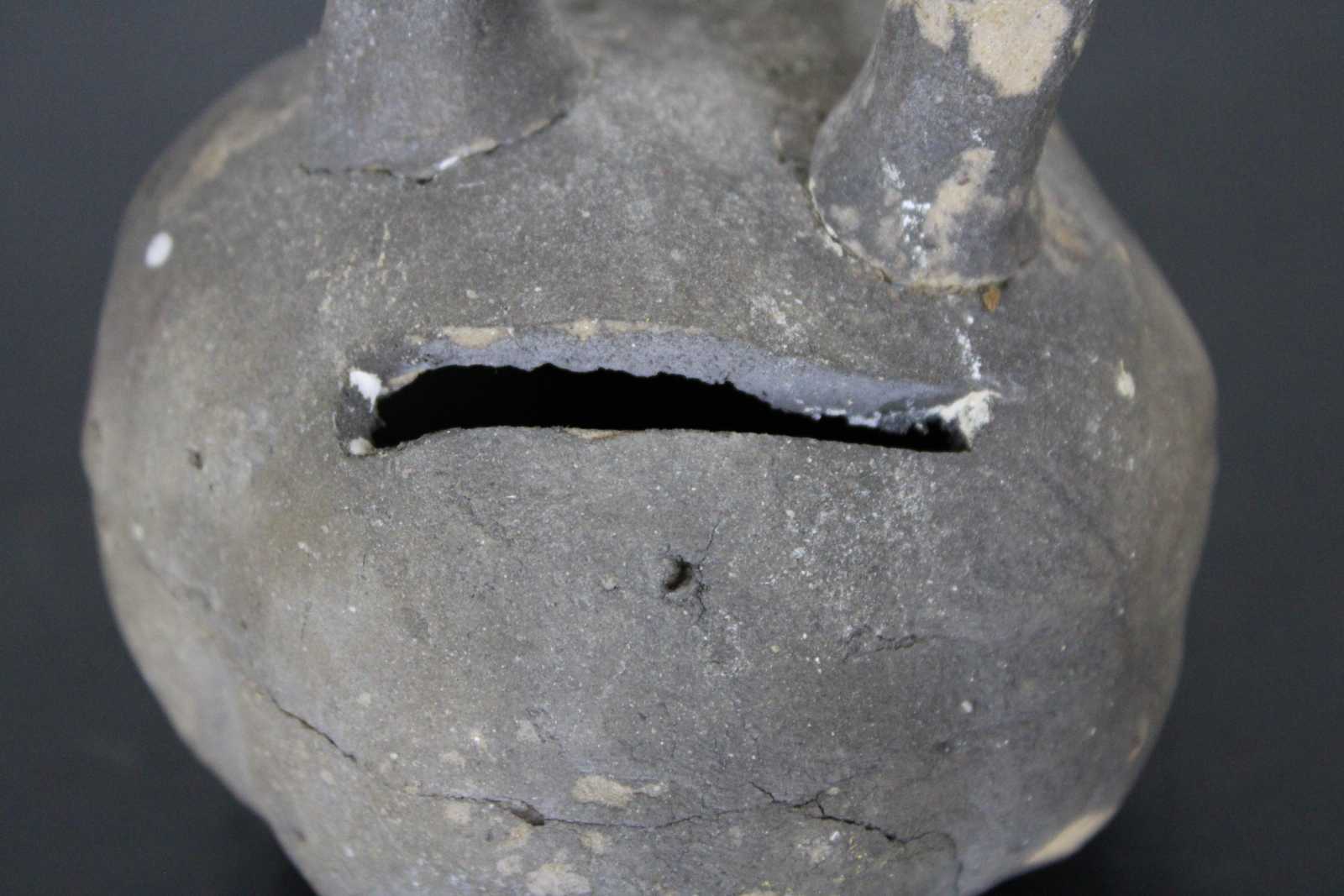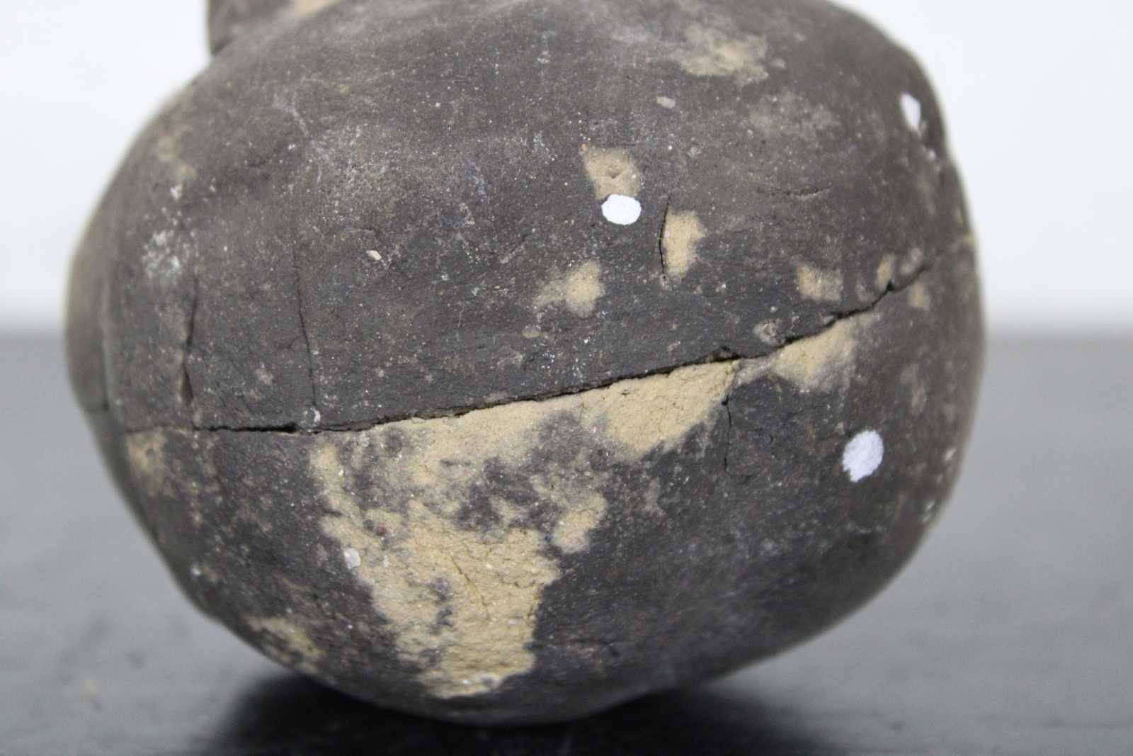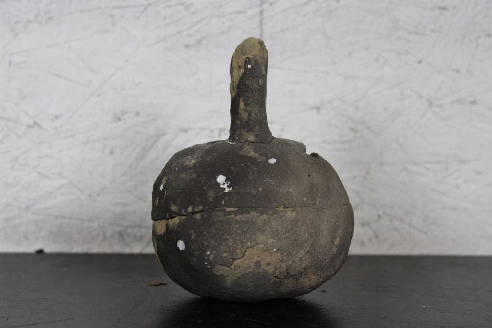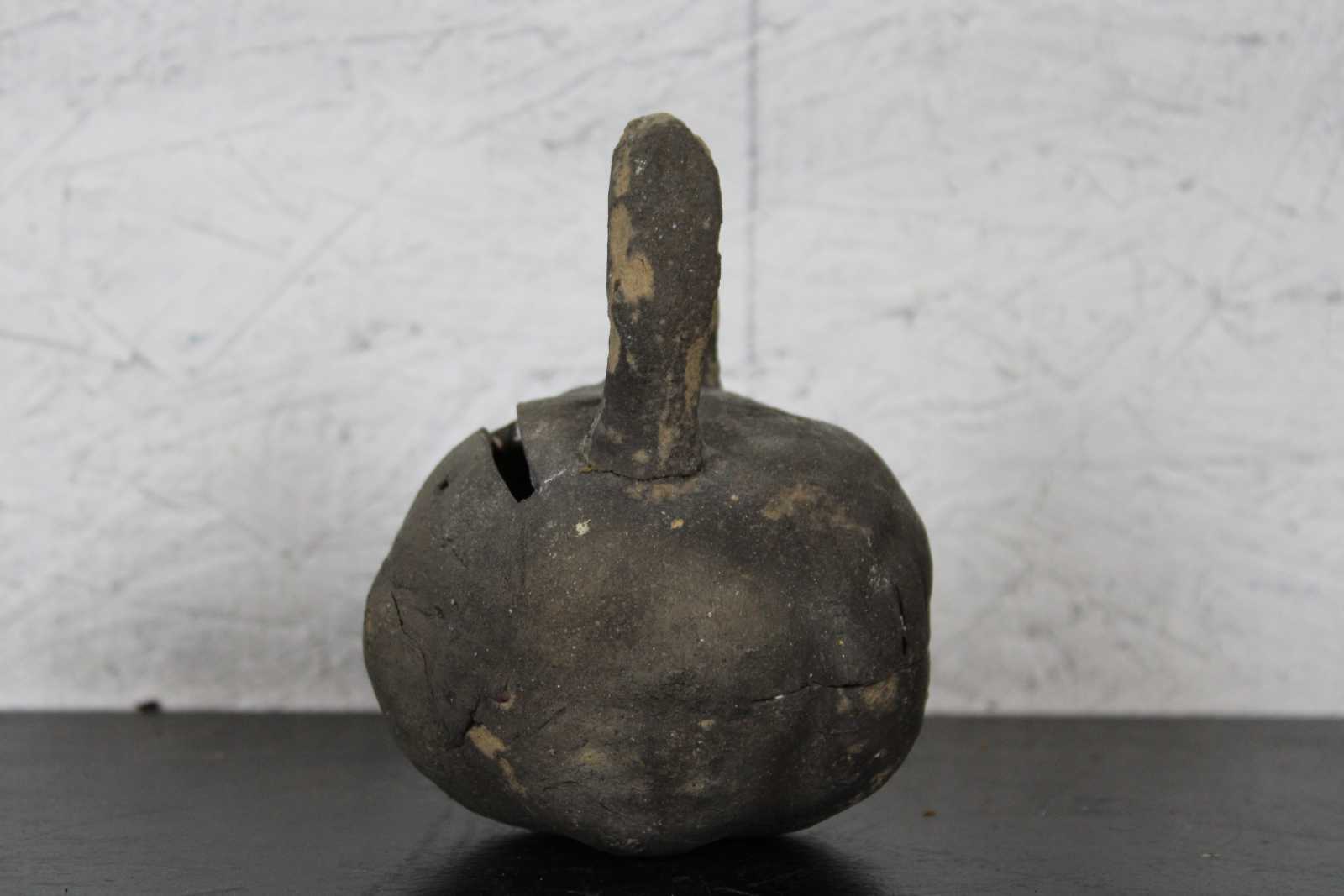 Antique primitive hand crafted folk art clay coin bank in the shape of a kettlebell.